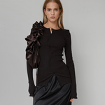 Our iconic Claire Seamless Cardigan is crafted from seamless 100% black organic cotton. The cardigan has a fitted silhouette with long sleeves, a v-shaped neckline and an all over ribbed detailing. It closes at the front with a wavy button closure and can be left undone or closed.
