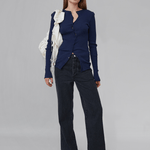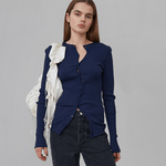 Our iconic Claire Seamless Cardigan in navy is crafted from seamless 100% organic cotton. The cardigan has a fitted silhouette with long sleeves, a v-shaped neckline and an all-over ribbed detailing. It closes at the front with a wavy button closure and can be left undone or closed.