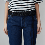 This new lace edition of the Coralie Belt is crafted from 100% recycled materials. This ruffled belt features a soft, textured finish and adjustable ties for a customisable fit. Perfect for adding a playful yet sophisticated touch to any outfit, it pairs beautifully with pants, skirts, or shirts, making it a versatile accessory for all occasions.