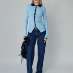 The Laura Seamless Shirt is crafted from blue organic cotton with black buttons. The Laura shirt has a fitted silhouette with long sleeves, a black pointy collar, and a black button-fastening down the front giving it a statement look.