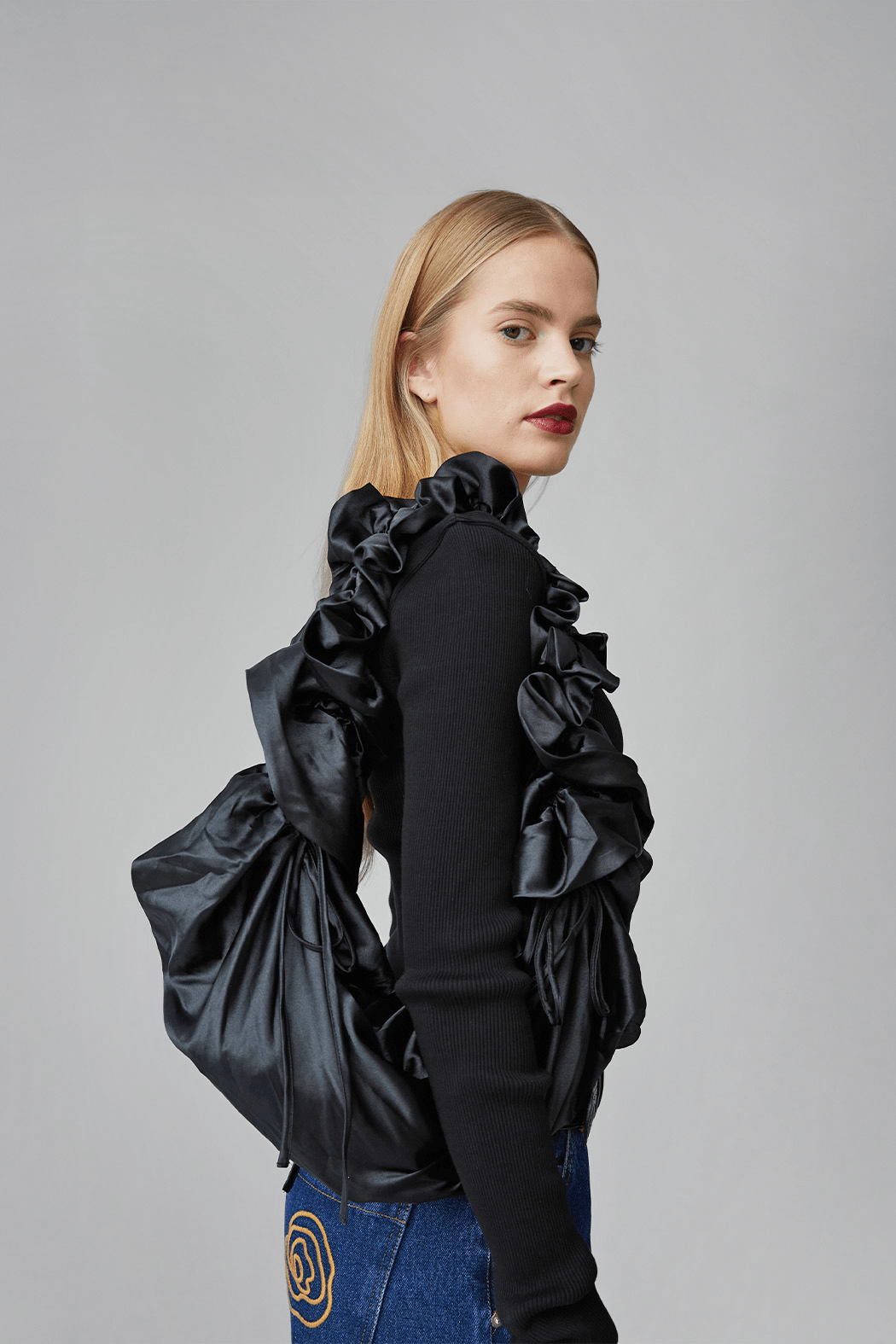 The eye-catching Shirley bag is crafted from luxurious black recycled polyester. Featuring an adjustable strap and ruffle detailing. Can be worn around the shoulder, crossbody, or as a handbag.