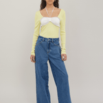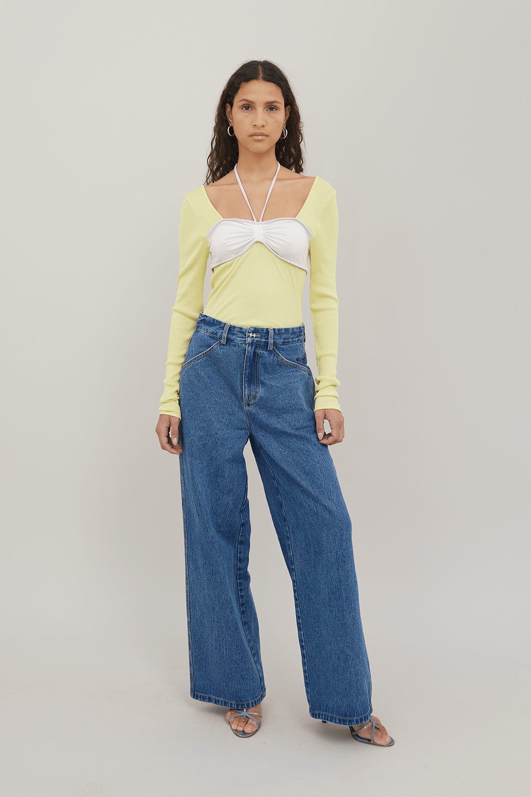 The elegant Carbo top is crafted from a mix of yellow recycled silk and white recycled polyamide. The top is detailed with a contrast between a soft ribbed body and long sleeves, and the bust is made from practical swimwear fabric. The top features ruching details and a decorative tie around the neck. The Caro top is the perfect way to spice up your spring and summer wardrobe.