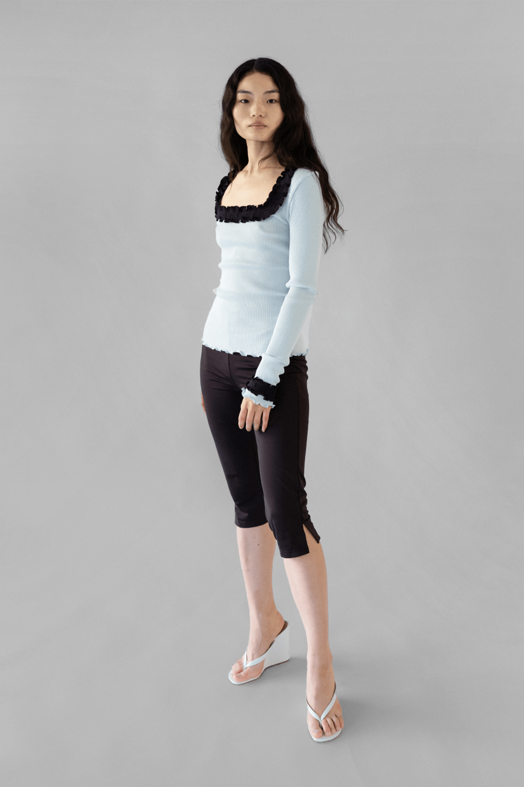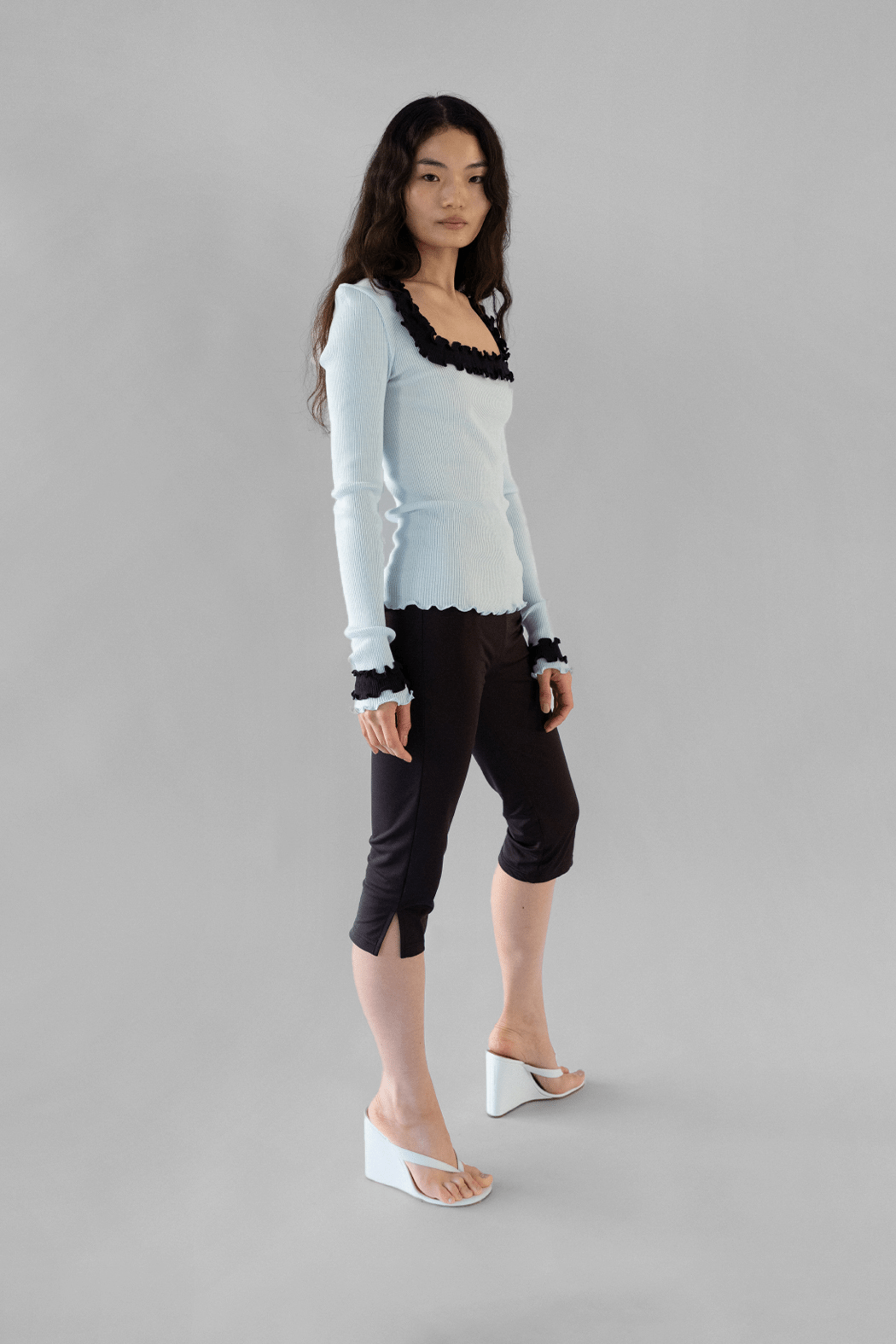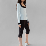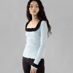 Our Rosie Seamless Top is crafted from soft 100% ice blue organic cotton. The top is all-over ribbed and hugs all shapes and sizes beautifully. The neckline features an open, square-shaped cut-out adorned with a lovely white ruffled edge that extends to the sleeve ends.