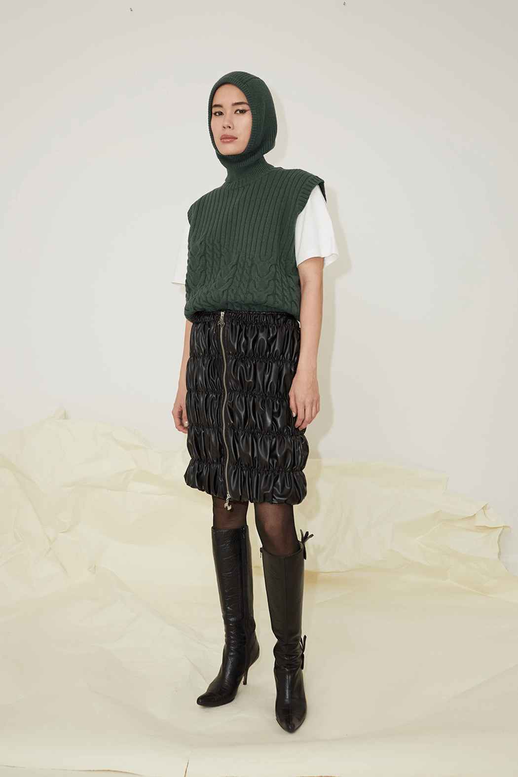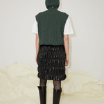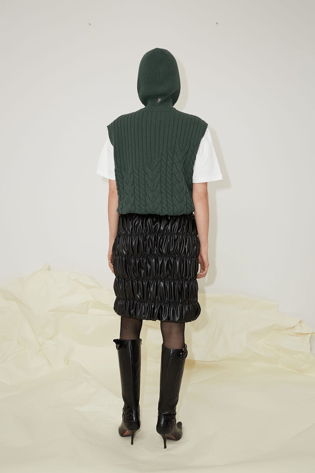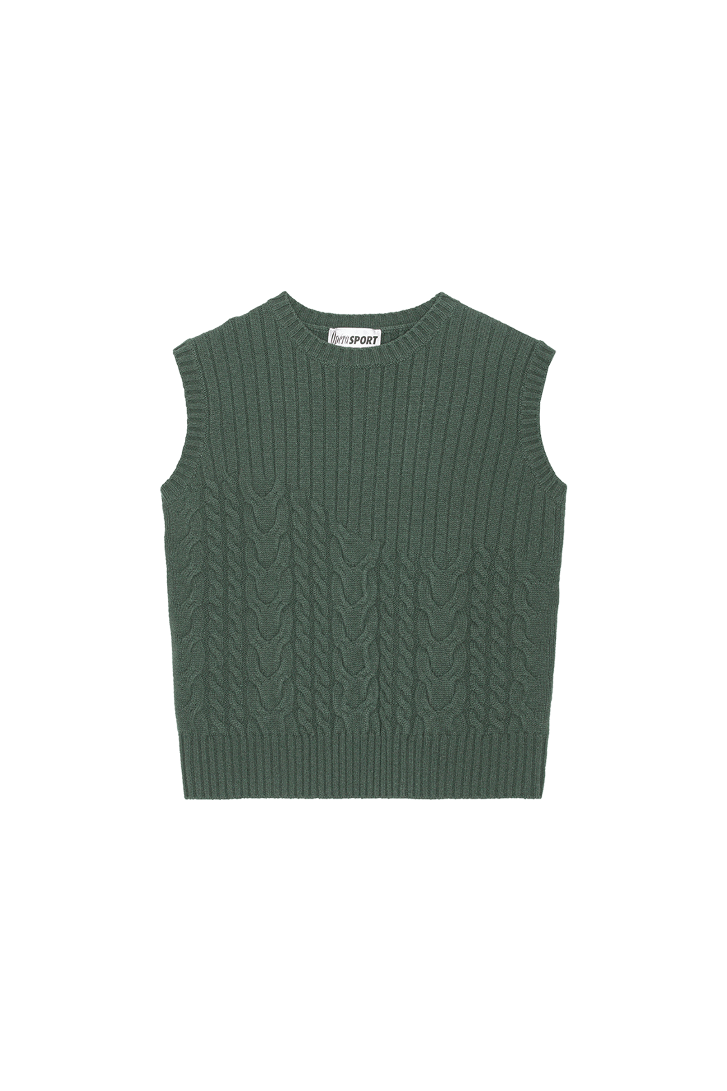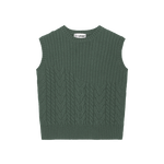 Master the art of cold-weather layering with OpéraSPORT's Wyatt unisex vest. It balances texture with a relaxed feel through a mixture of vertical and figure of eight rib stitch construction of this jungle green sweater. It features a high neckline and sleeveless silhouette. This geometric pattern creates a comforting, relaxed feel complimented by a boxy shape.