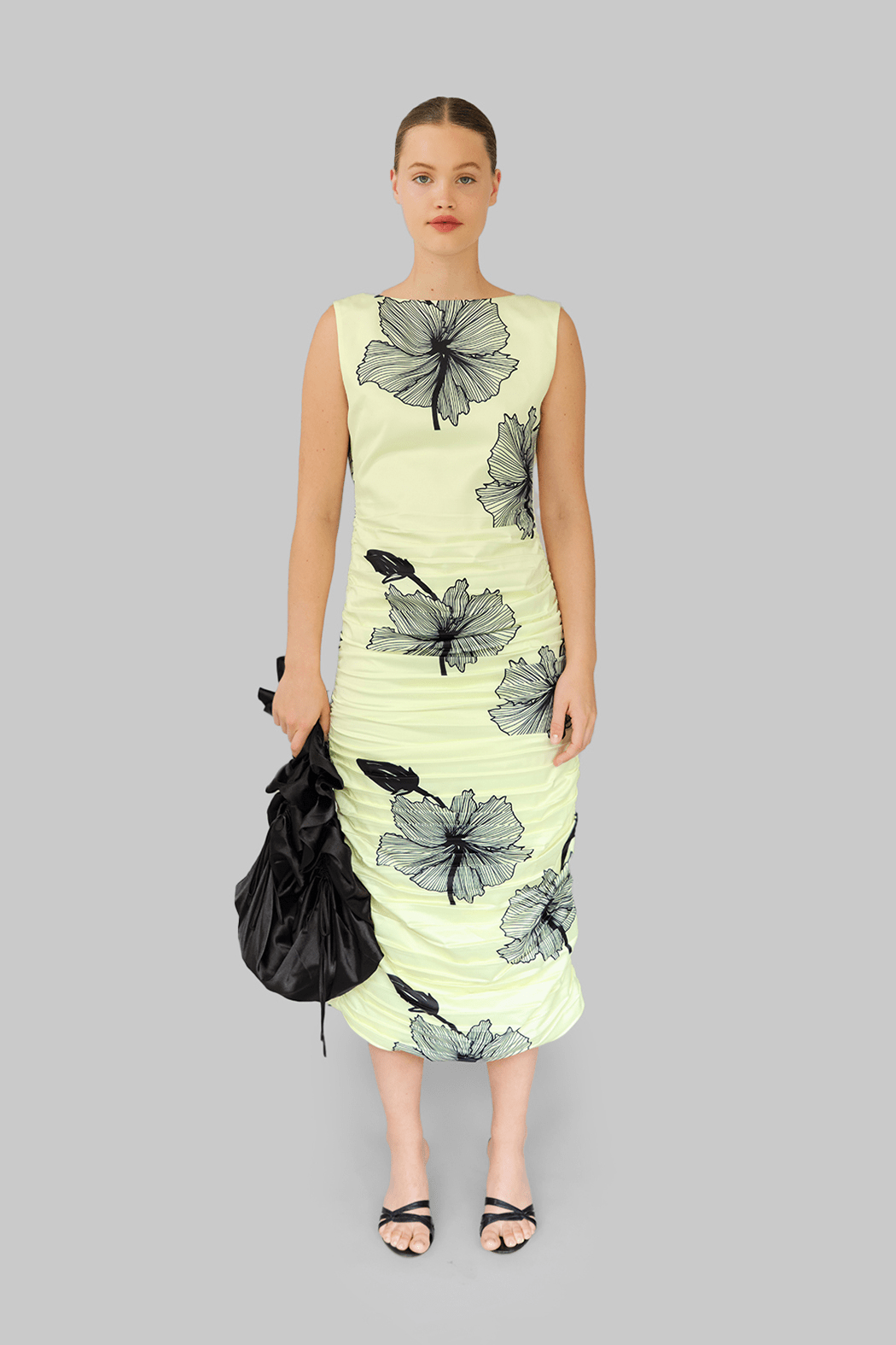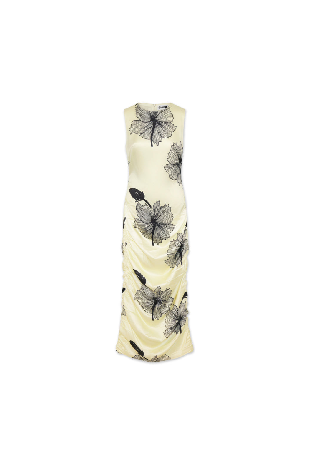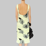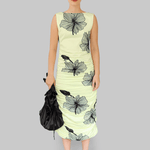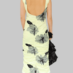 The Lone Dress is crafted from 100% recycled polyester in tender yellow with bold black floral prints. This sleeveless design features a boat neckline and a fitted silhouette that is softly ruched throughout, creating a flattering shape that flows into a midi-length skirt.