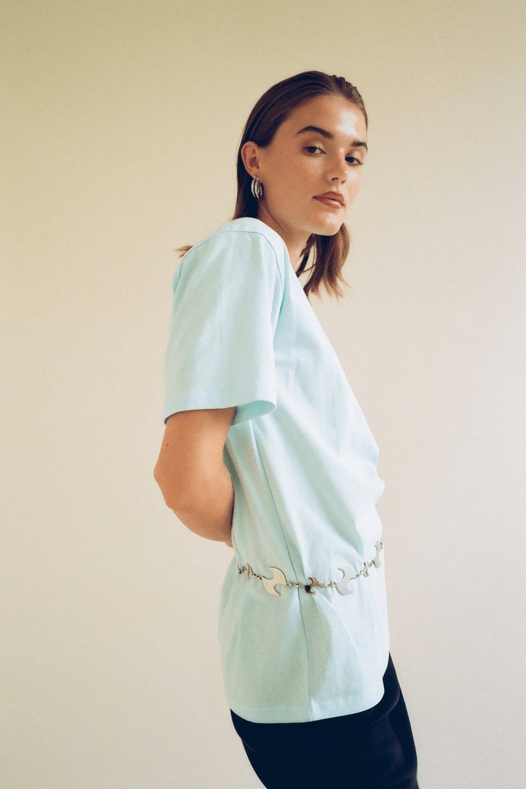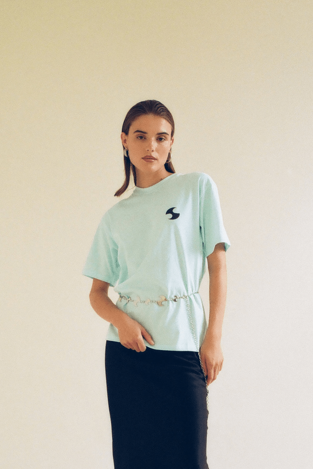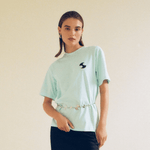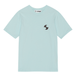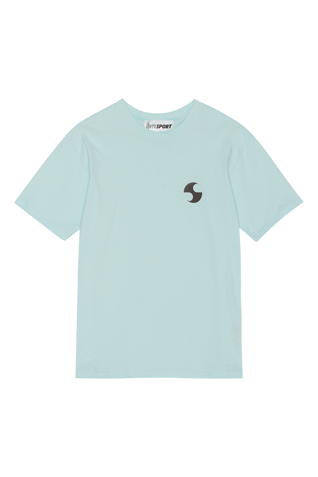 The Castell t-shirt is crafted from mint blue 100% recycled cotton. It has a relaxed fit and features a round neckline, short sleeves, a contrast logo print at the chest, and a straight hem. The t-shirt has the signature OpéraSPORT logo on the chest.