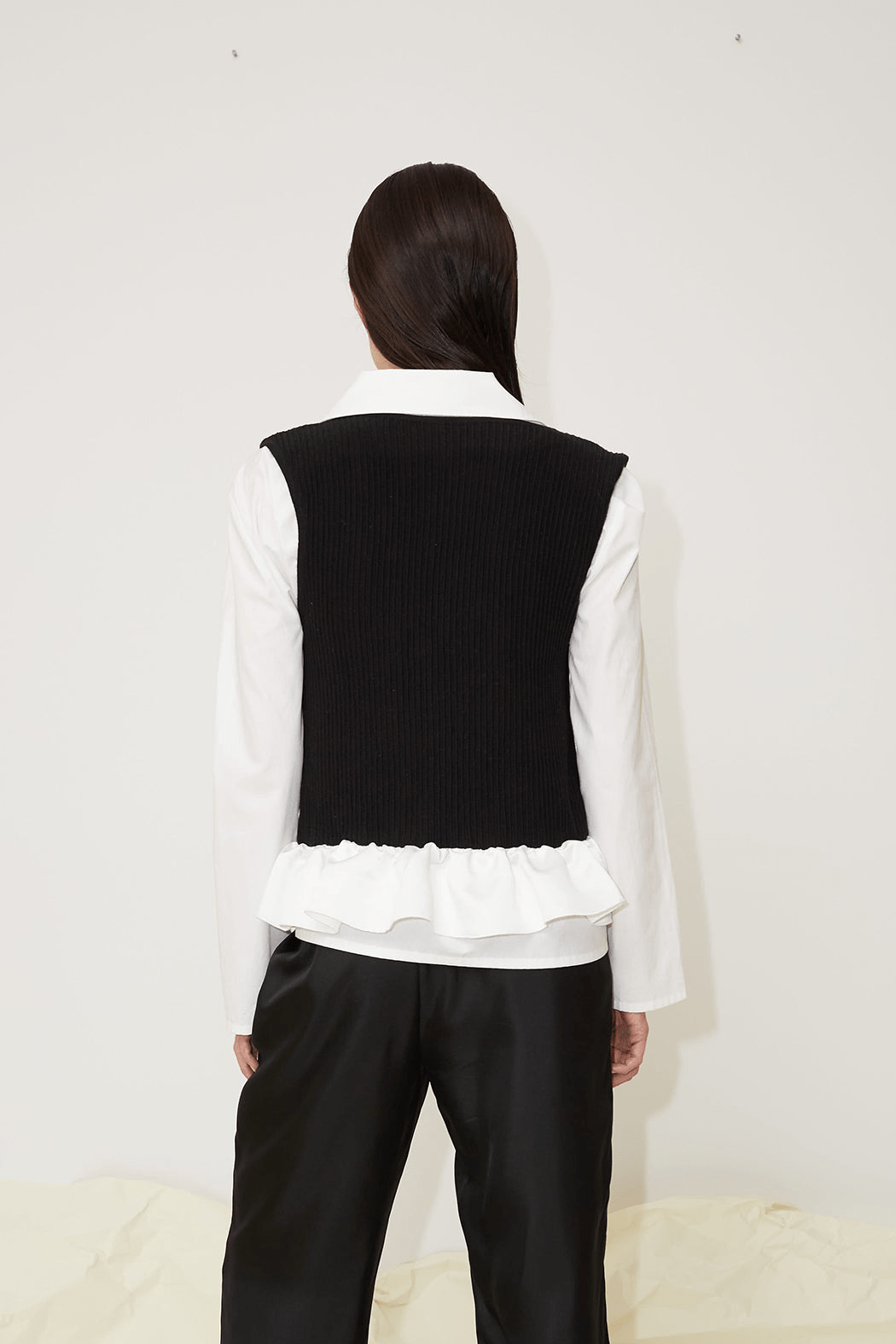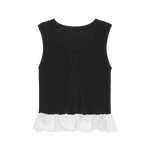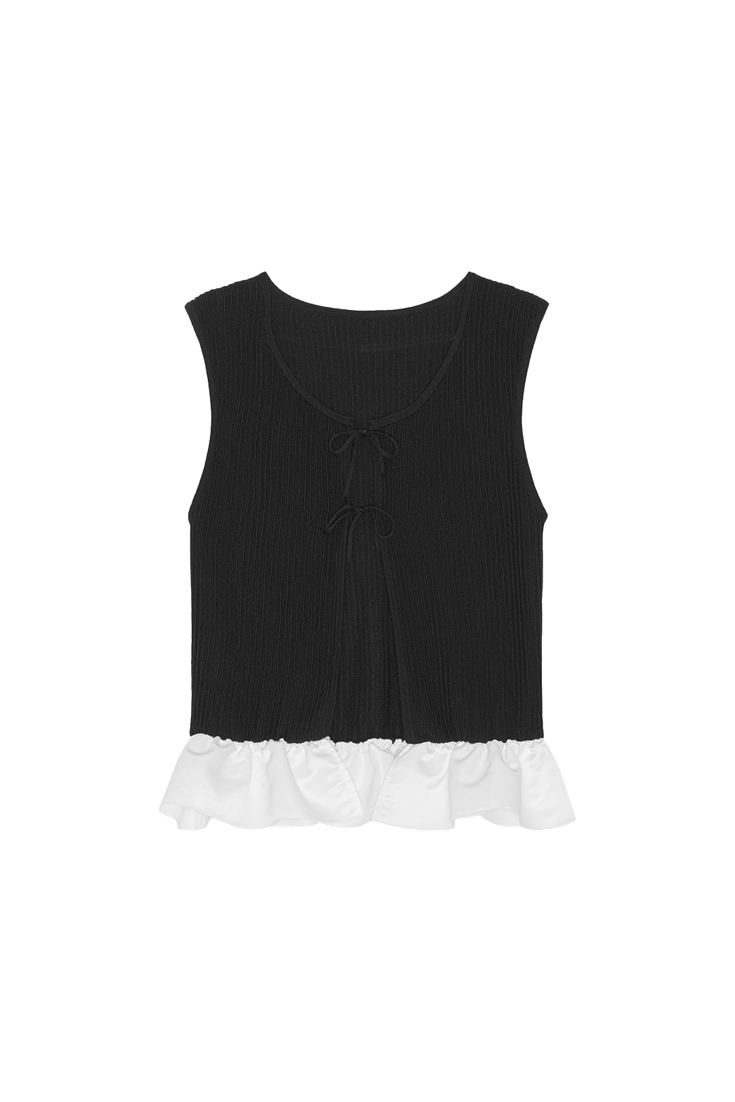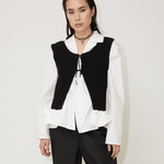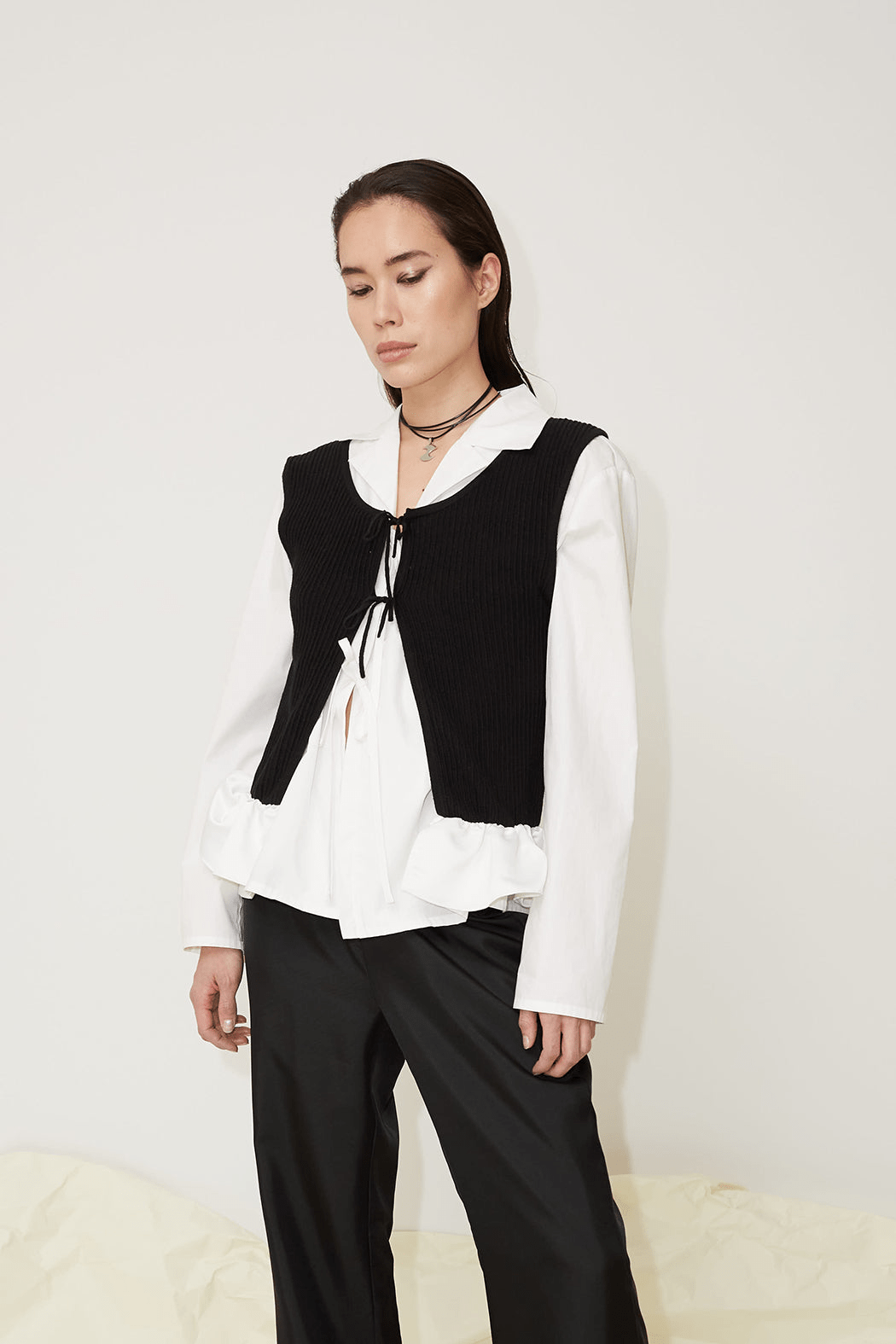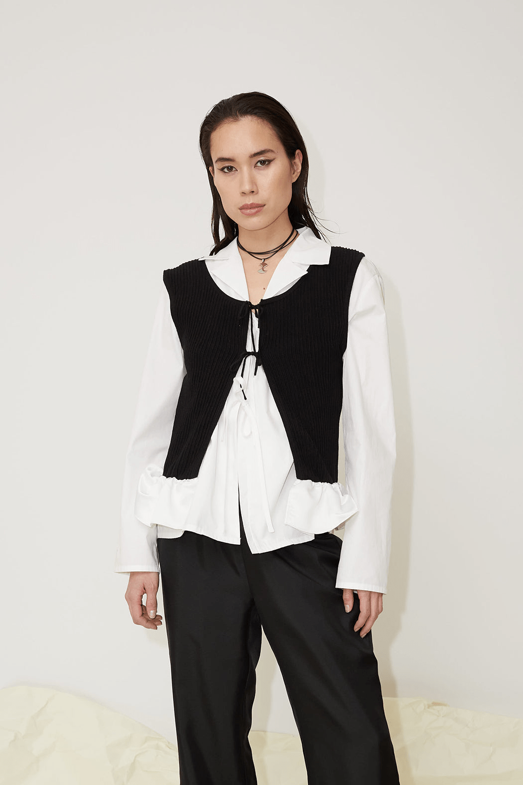 The Flora vest is crafted from compact ribbed knit material in 75% recycled wool and 25% recycled silk. The vest features a rounded neckline and is cut to a slim silhouette. Shaped with an open front and slender ties, the ties that can either be left undone or knotted into a bow for a whimsical finish.