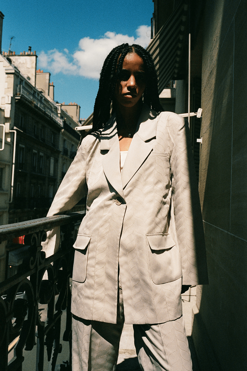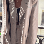 The Cameron blazer is made of taupe 100% recycled polyester. The blazer has a boxy and oversized fit with internal shoulder pads that emphasizes a mens-inspired silhouette. The fabric features organically shaped stitching details. The blazer can be worn with the Carter pants to create an elegant everyday suit.