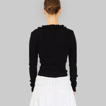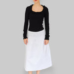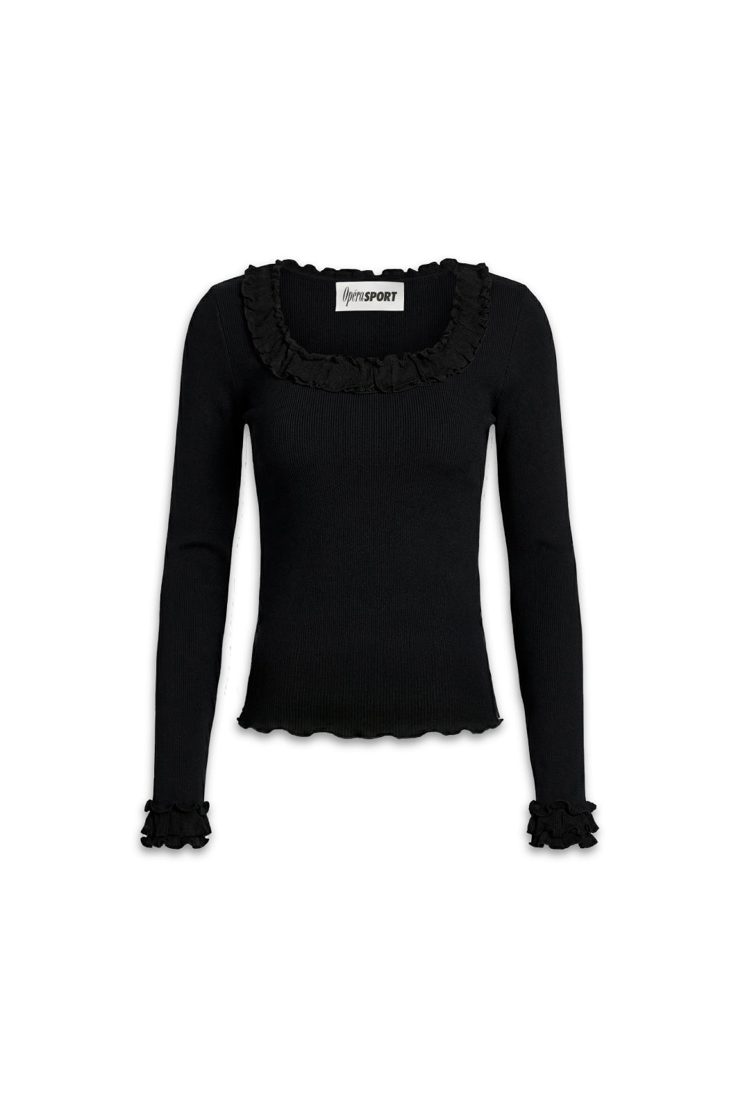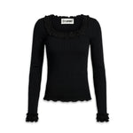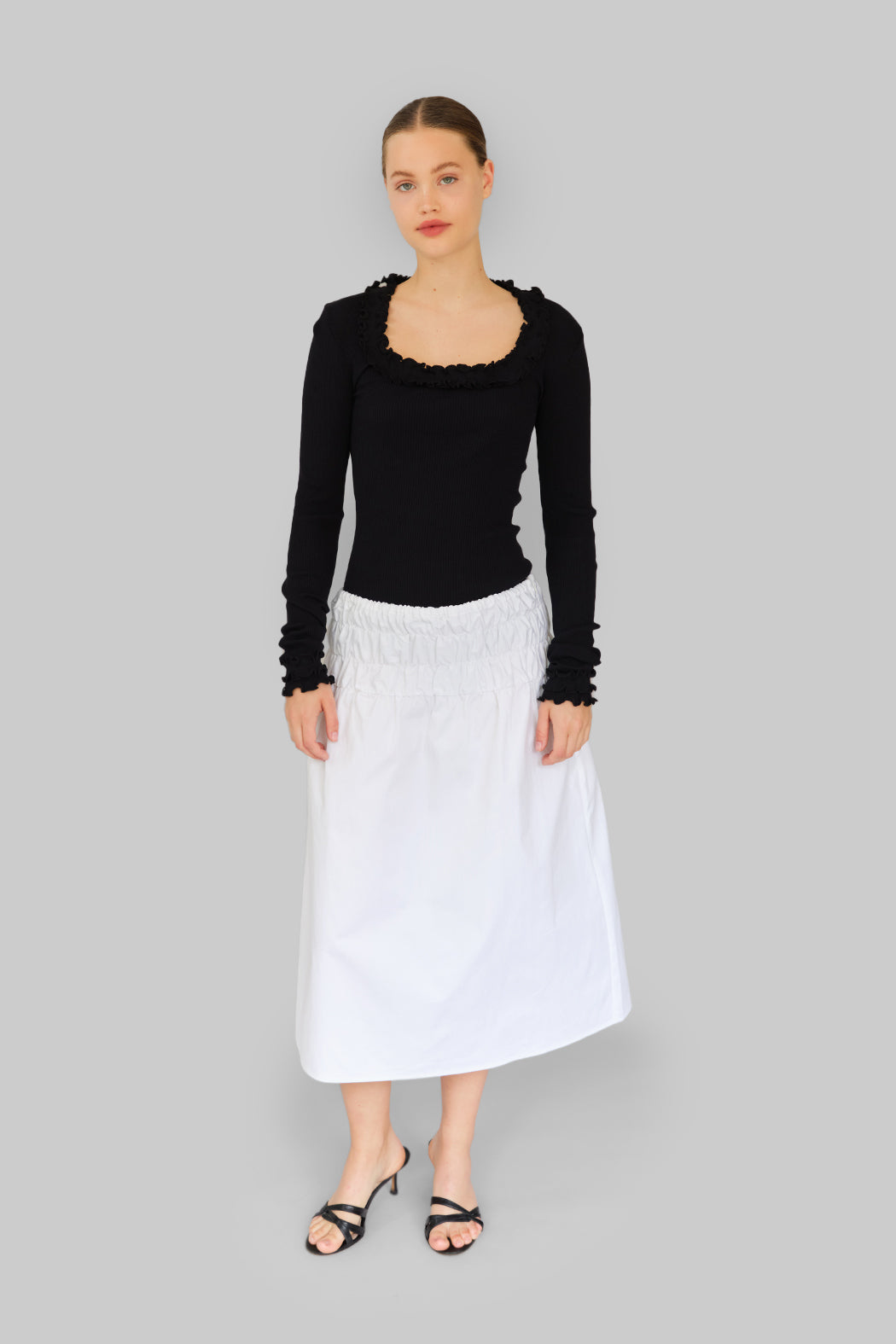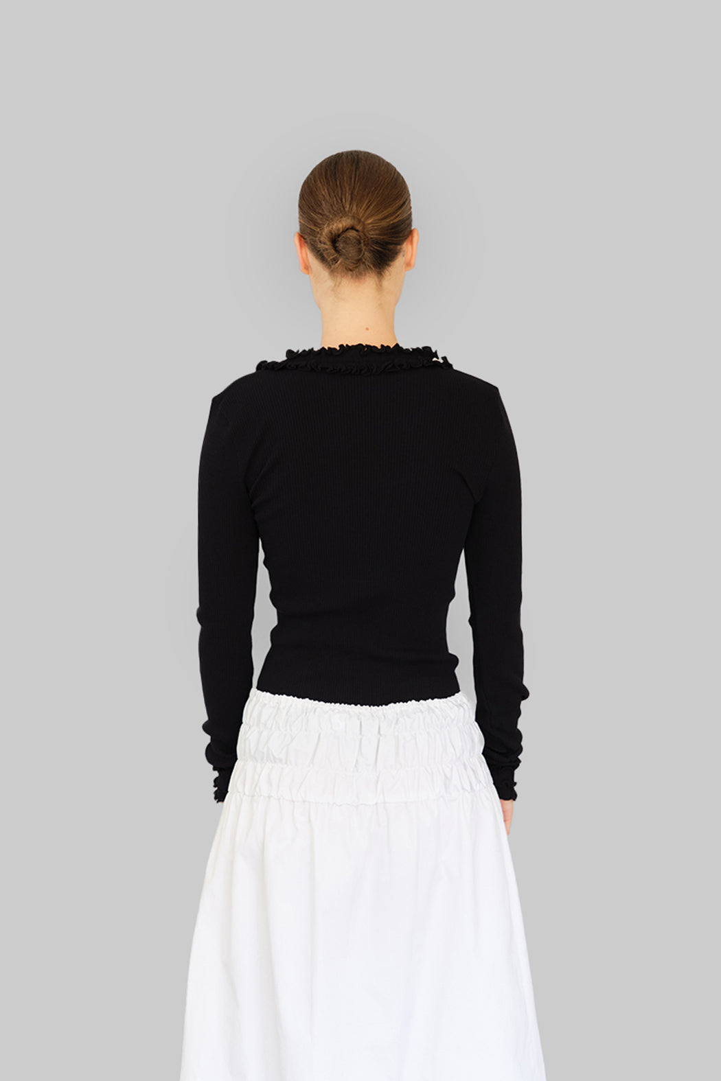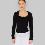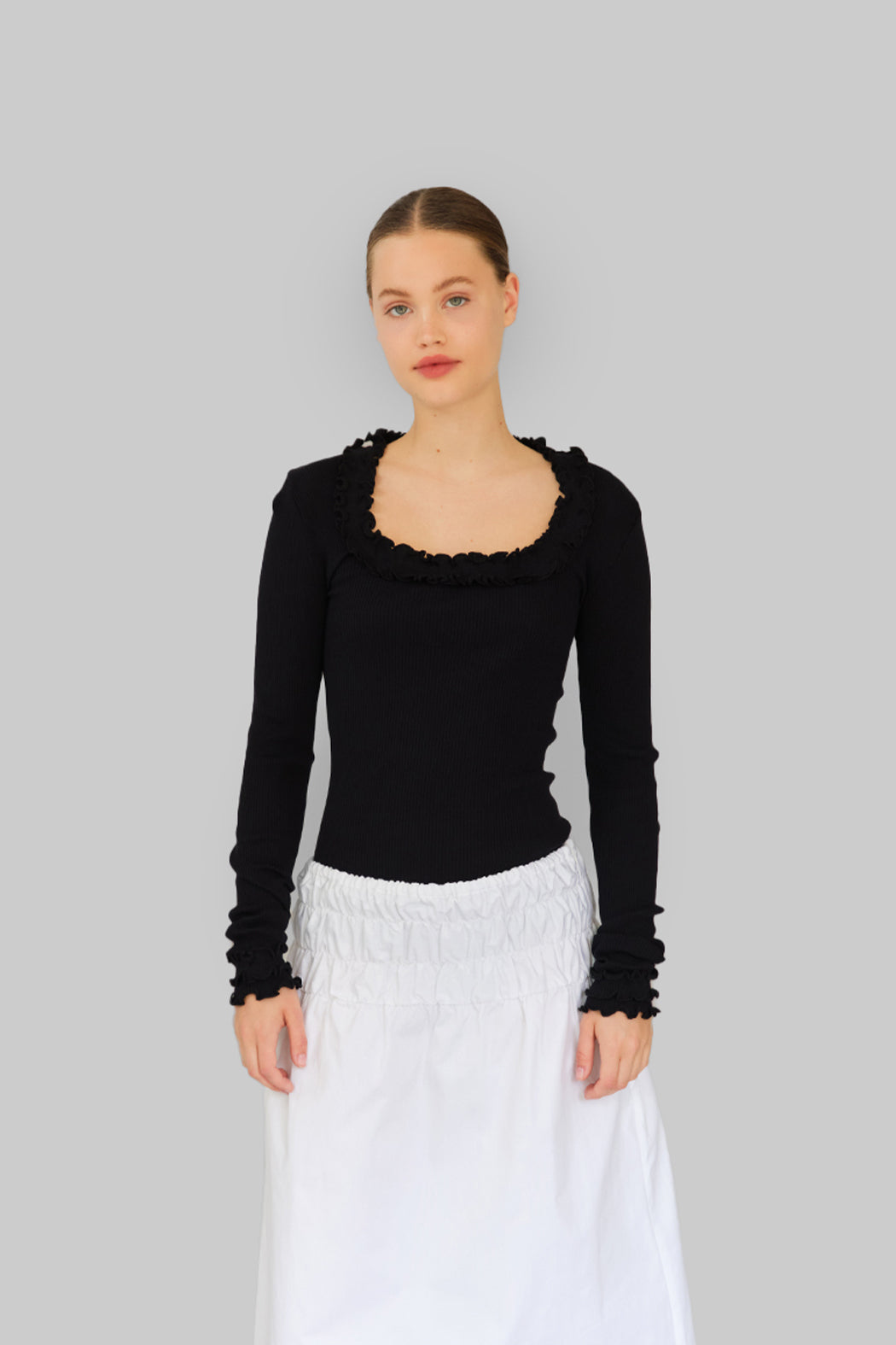 Our Rósie Seamless Top is crafted from soft 100% organic cotton. The top is all-over ribbed and hugs all shapes and sizes beautifully. The neckline features an open, square-shaped cut-out adorned with a crisp black ruffled edge that extends to the sleeve ends.