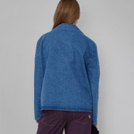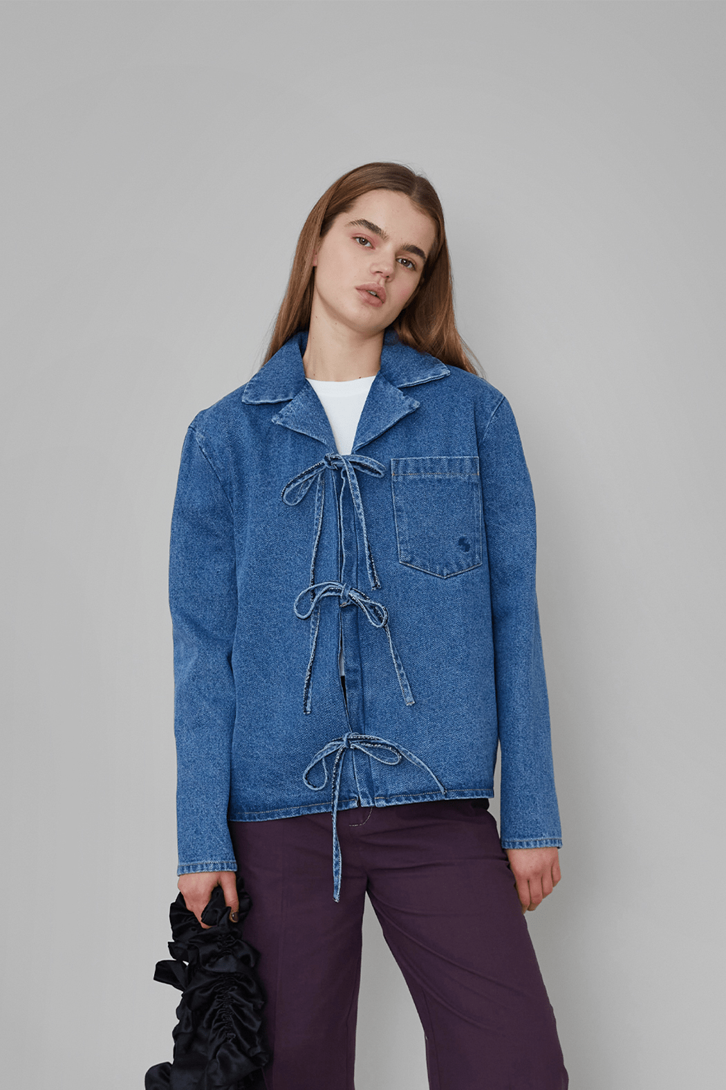 The Tavon Shirt is crafted from indigo blue denim in 100% organic cotton. It has a boxy fit with long sleeves, a wide collar, and one front pocket with embroidered OpéraSPORT logo on. The shirt has ties down along the body that can either be left undone or knotted into a bow.