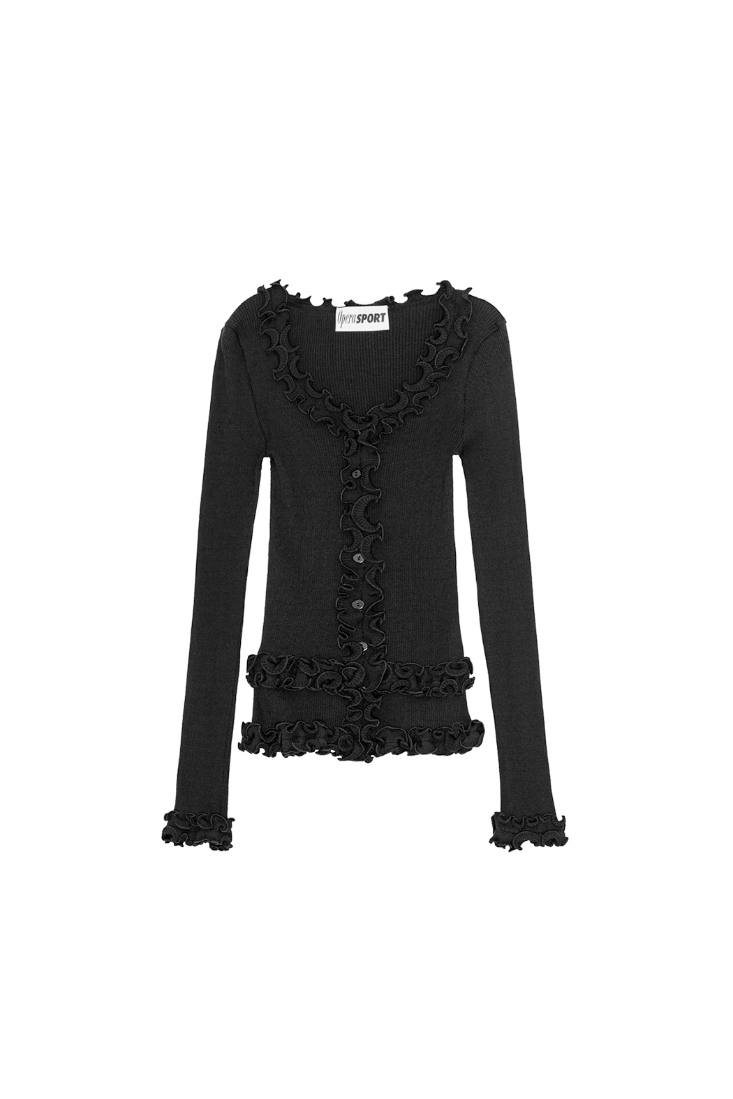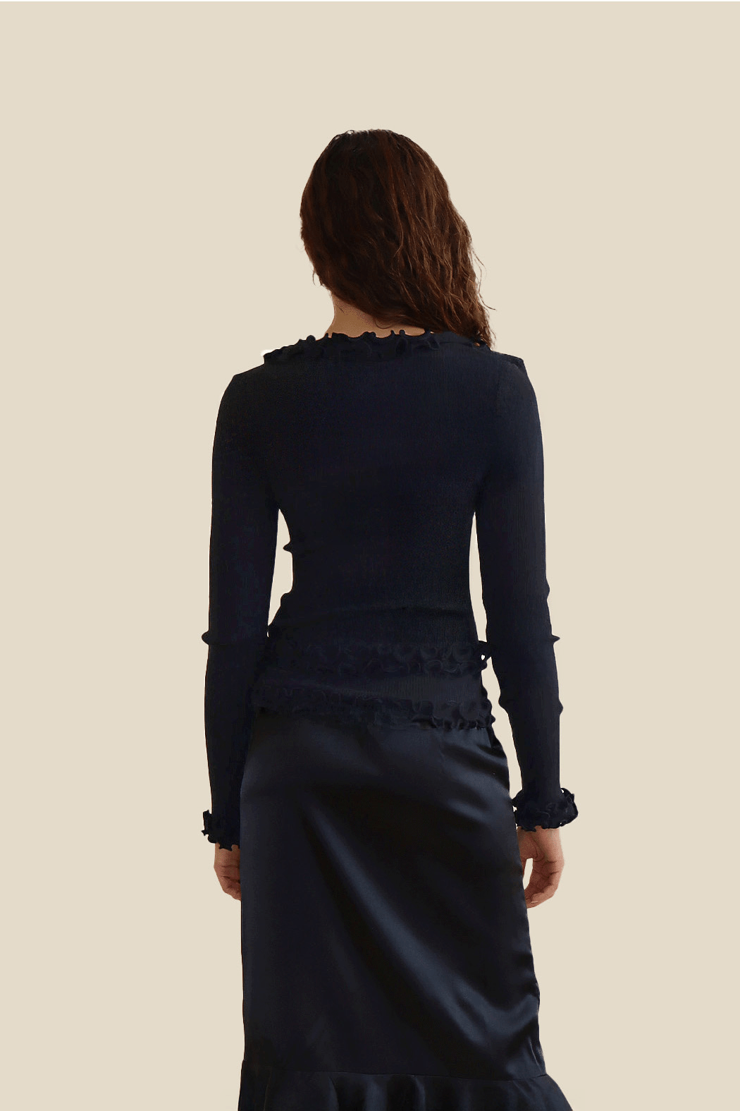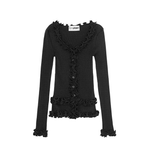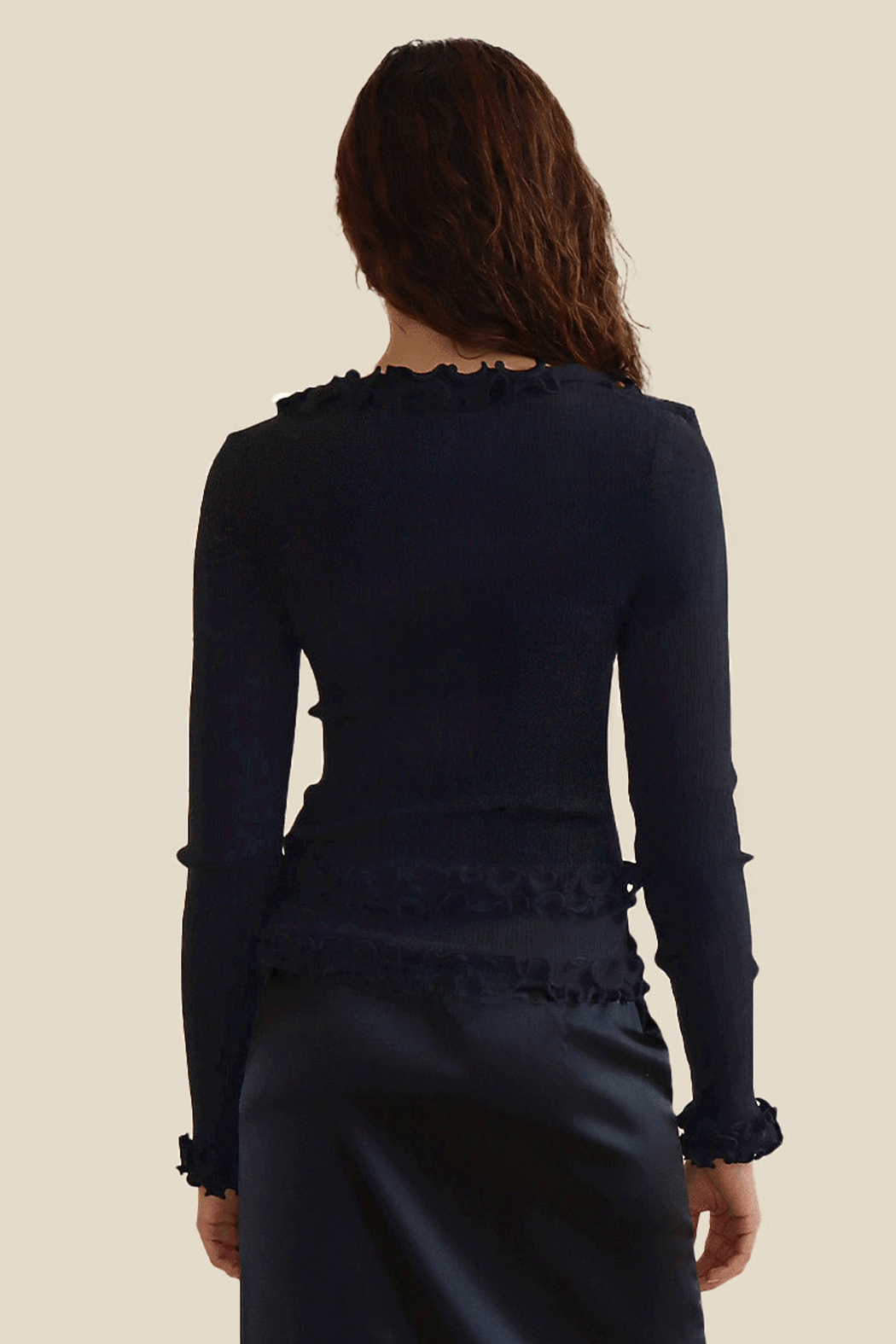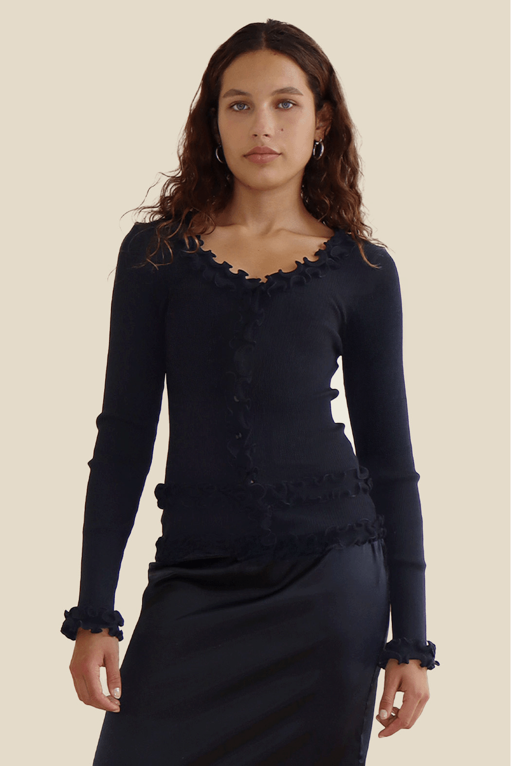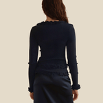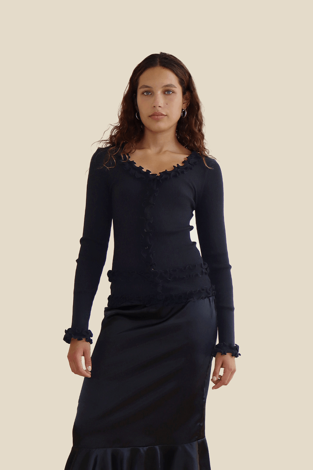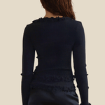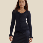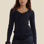 Our stunning Caroline seamless top in black is crafted from 100% organic cotton, combining comfort with style. It features delicate black ruffle details throughout and a flattering V-neckline, making it a versatile addition to any wardrobe.
