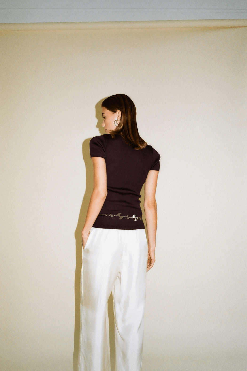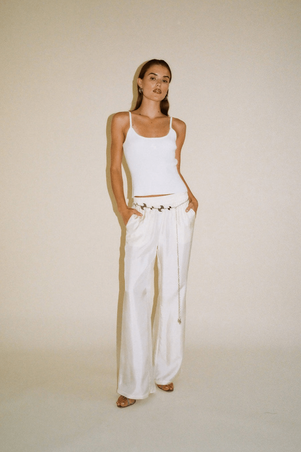The elegant Rapita pants are crafted from ecru lightweight fabric in 100% recycled silk. The pants have a slightly loose silhouette with long straight legs and an elasticated waist.