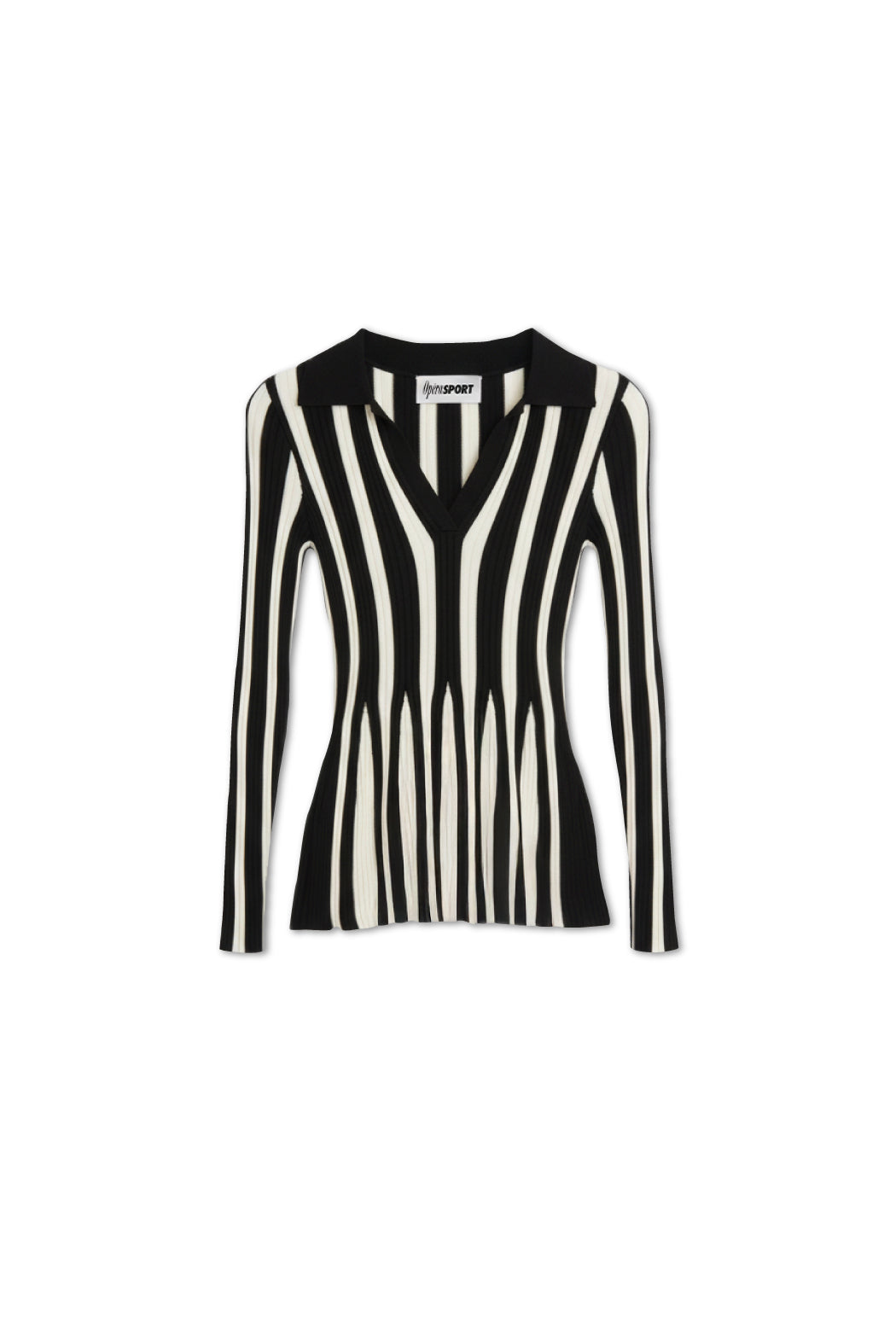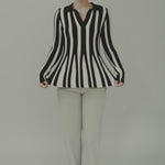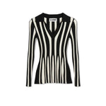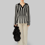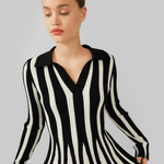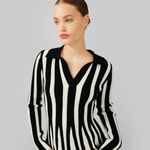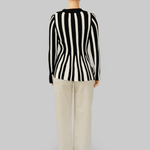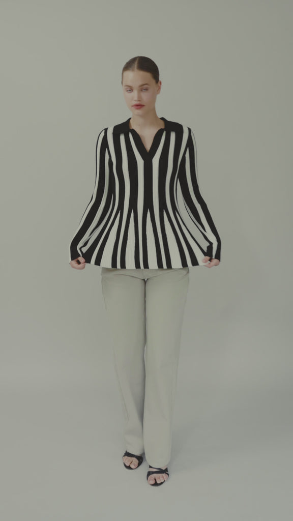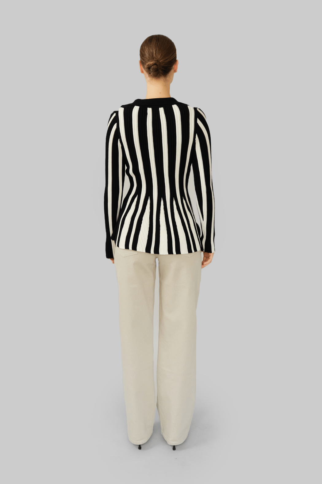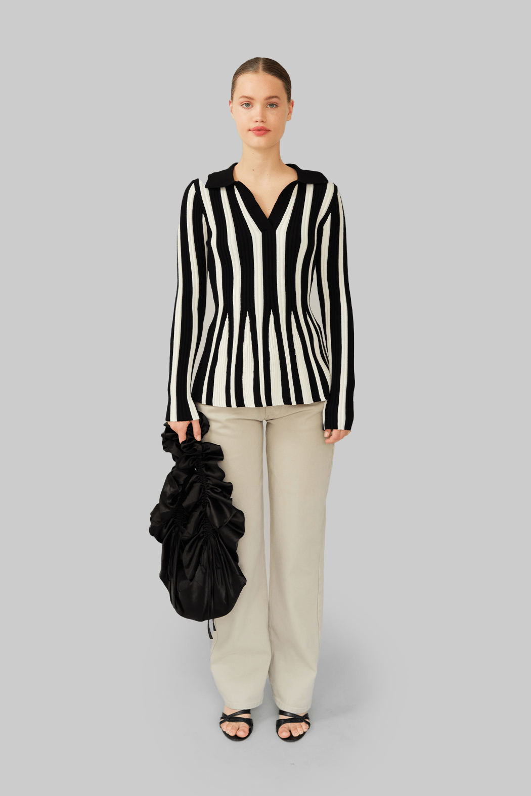 The Cara Sweater is crafted from a soft blend of 95% organic cotton and 5% cashmere in black with contrasting white stripes. Designed with a pointed collar and a subtle V-neckline, it has a body-following silhouette enhanced by structured rib knit for a refined finish.