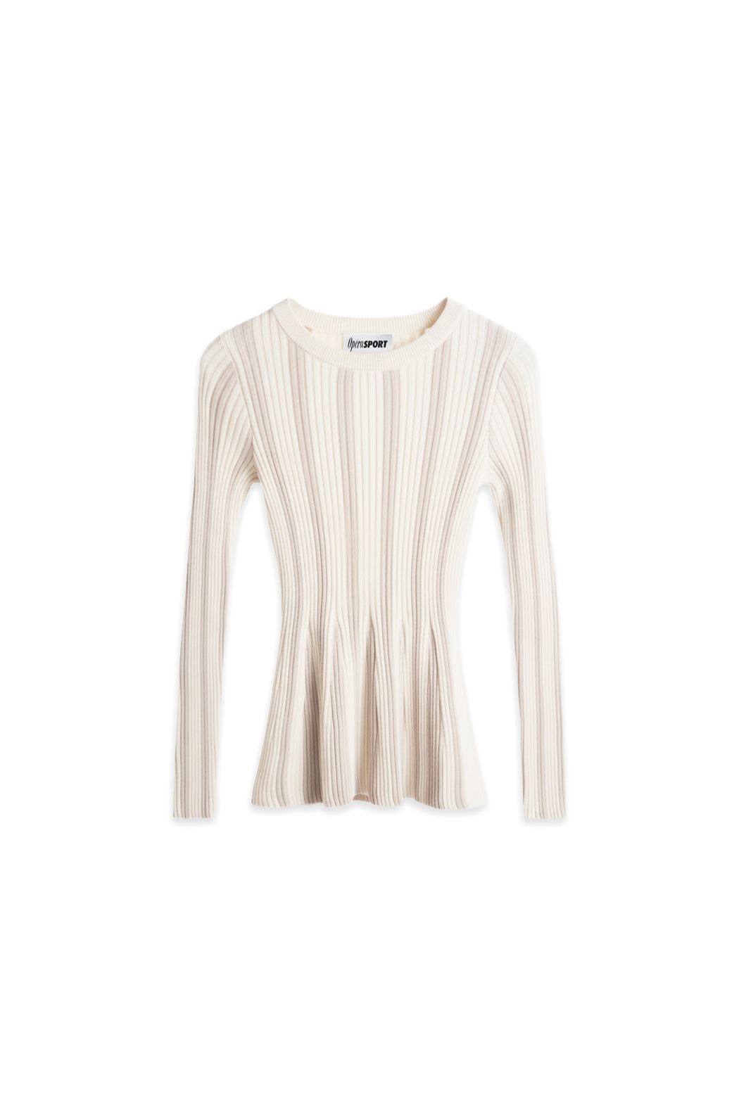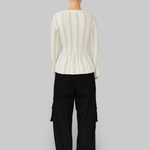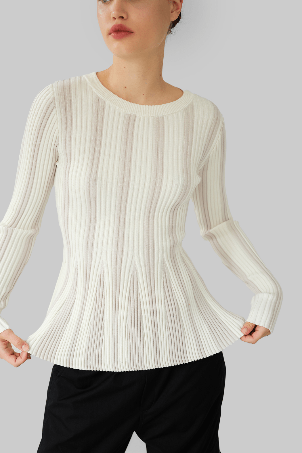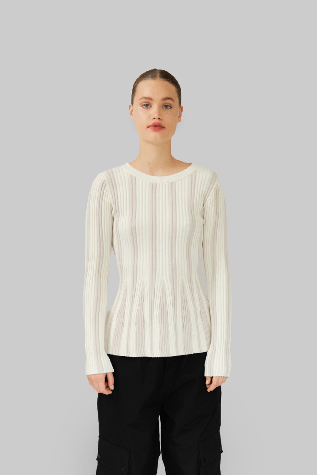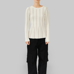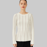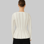 The Yara Sweater is crafted from a blend of organic cotton and cashmere in white. Designed with a round neckline and long sleeves, it features a ribbed knit structure that subtly narrows at the waist, creating a sculpted and streamlined silhouette.