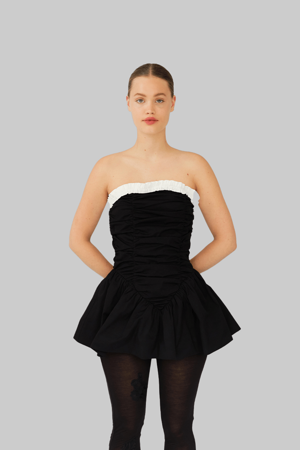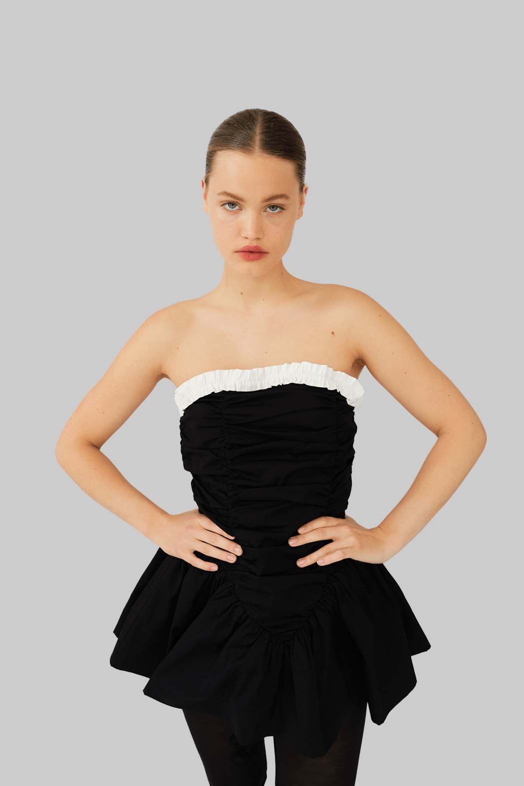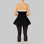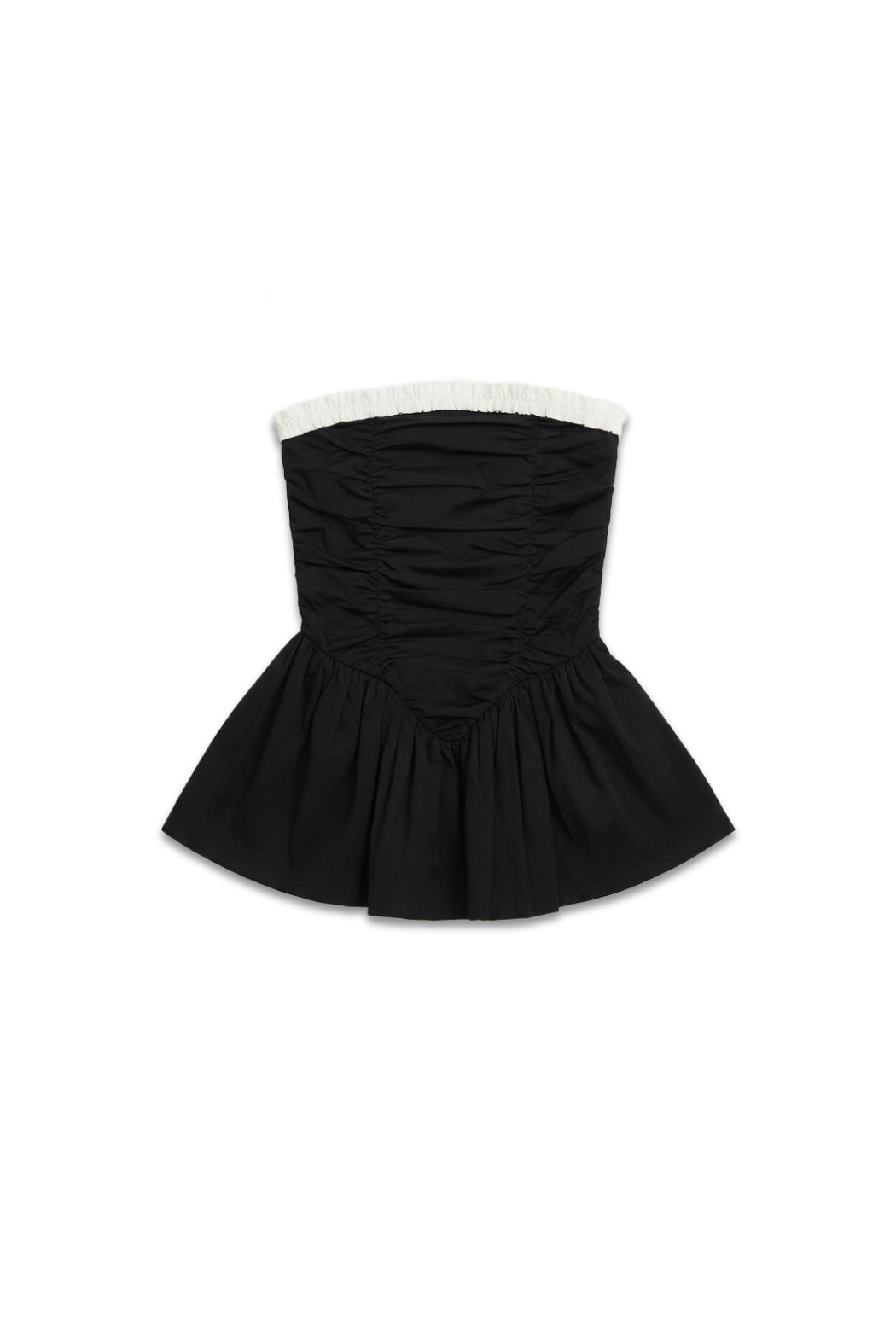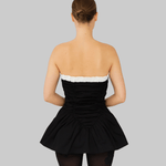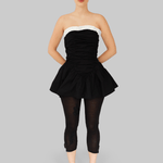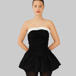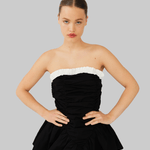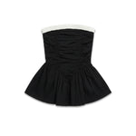 The Ayla Top is crafted from 100% organic cotton in black. This strapless design features a voluminous peplum hem and gathered ruching through the bodice for a sculpted effect. A contrasting white ruffled trim frames the neckline, adding a feminine detail to the structured silhouette. Perfect to style on its own or layered over pants for a more everyday look.