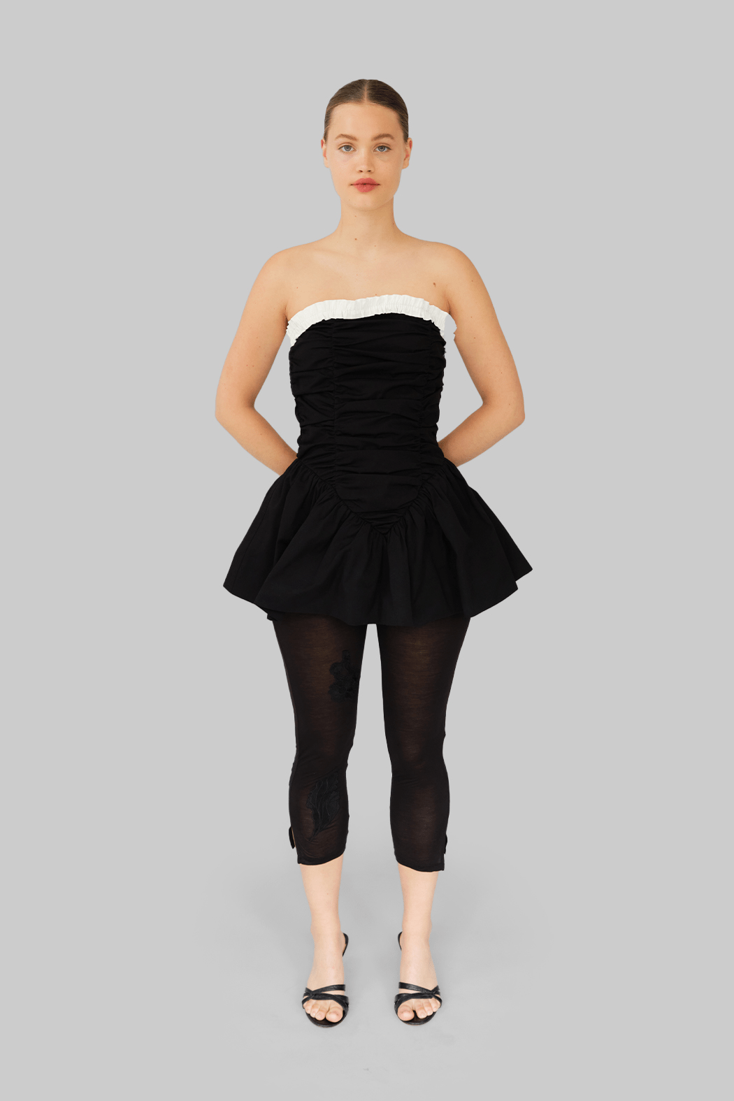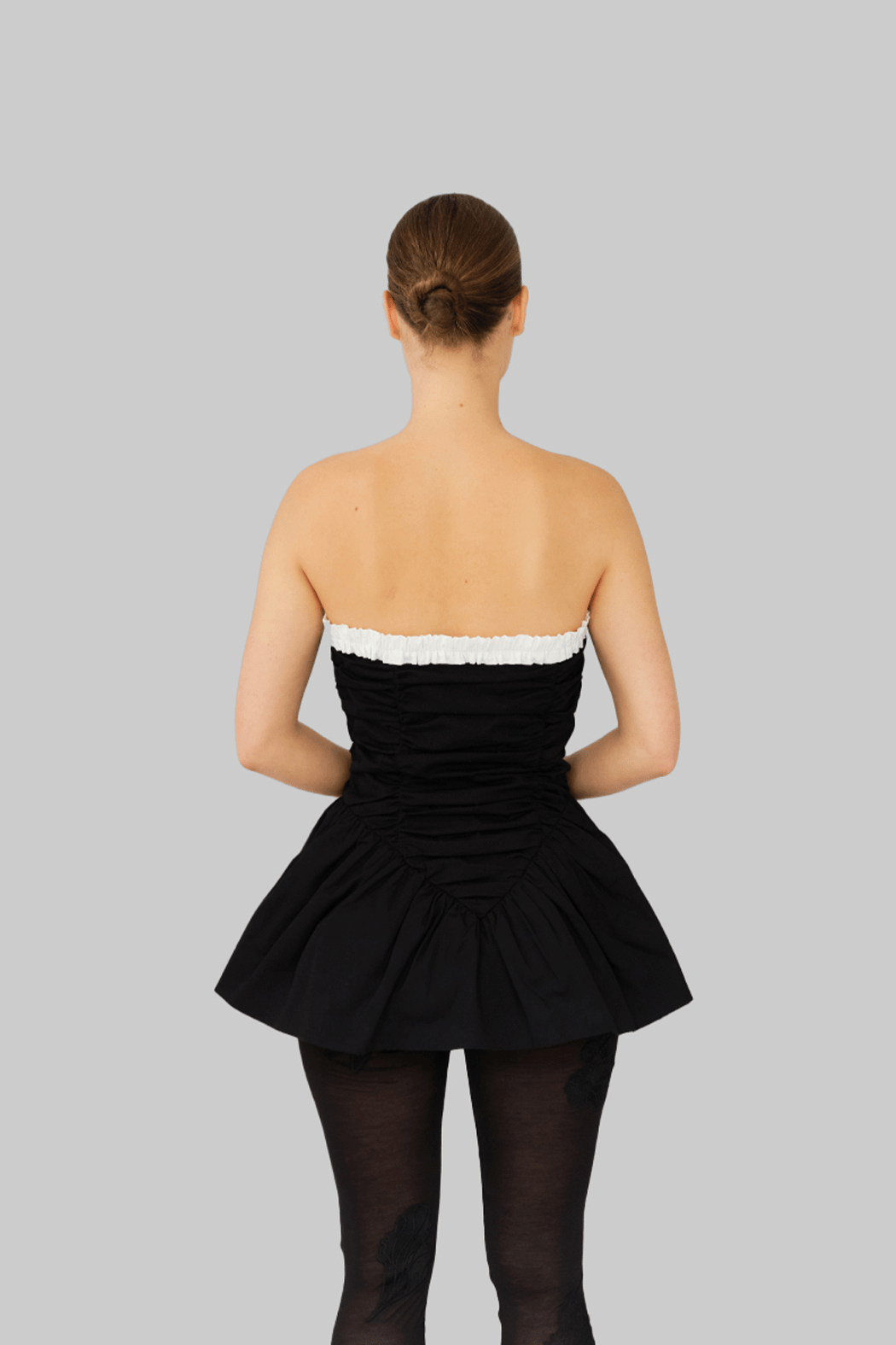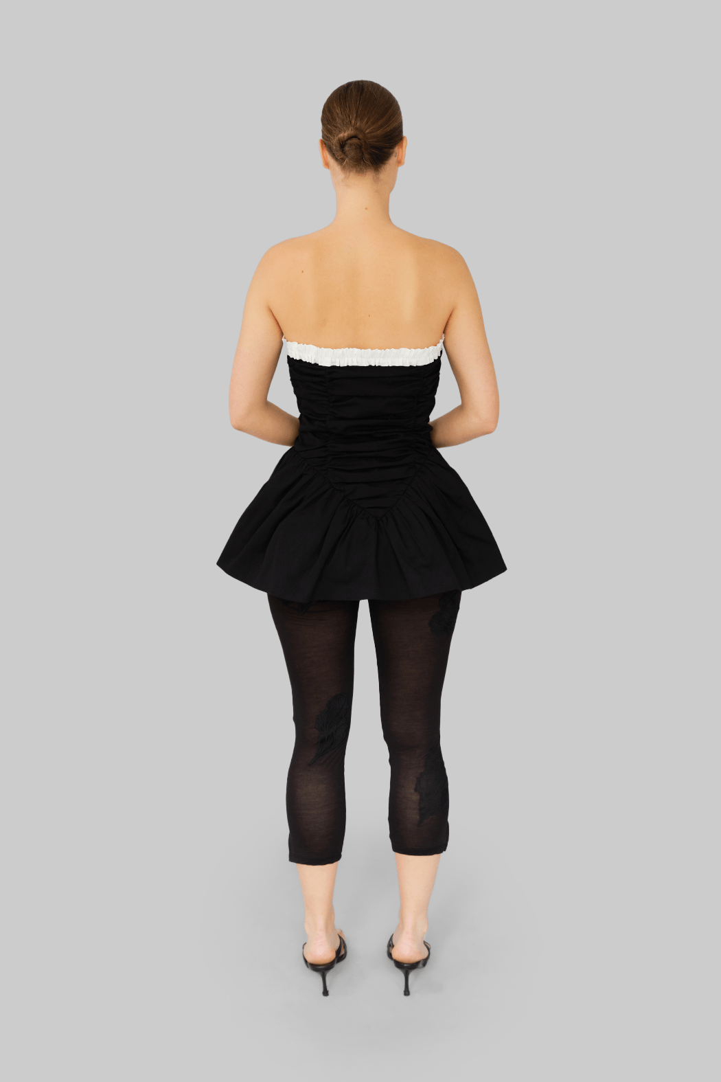 The Ayla Top is crafted from 100% organic cotton in black. This strapless design features a voluminous peplum hem and gathered ruching through the bodice for a sculpted effect. A contrasting white ruffled trim frames the neckline, adding a feminine detail to the structured silhouette. Perfect to style on its own or layered over pants for a more everyday look.