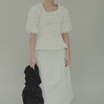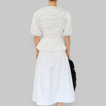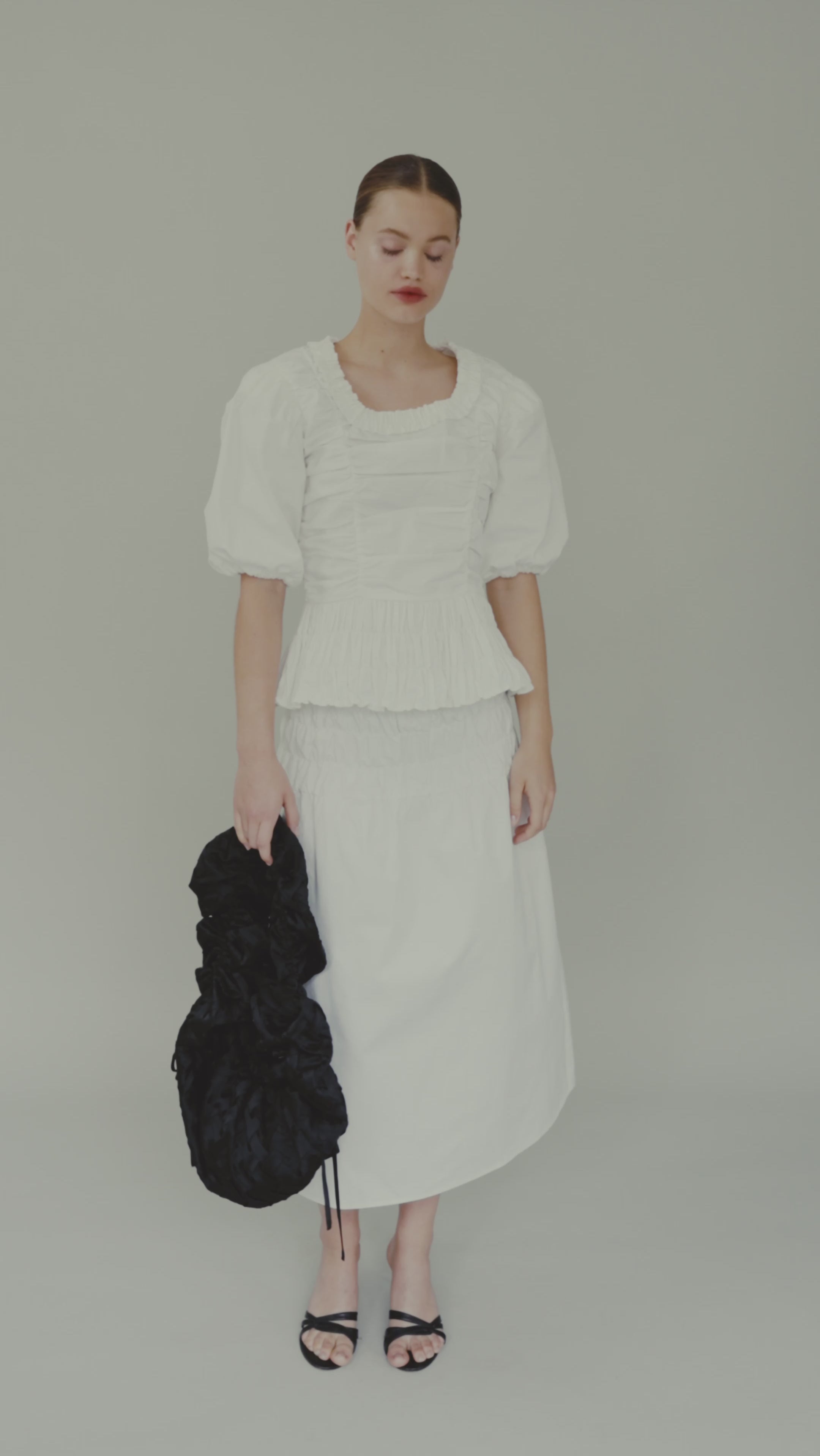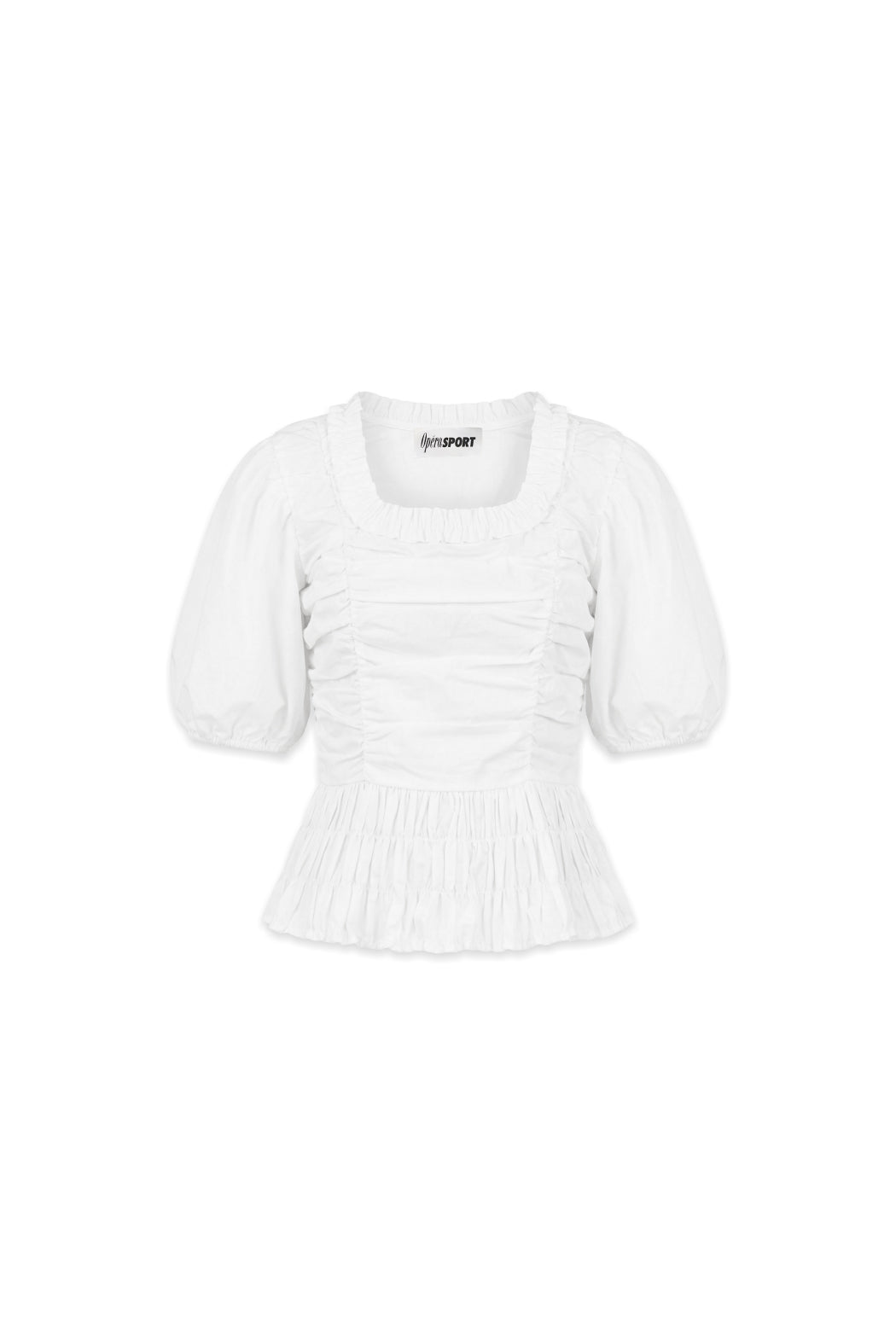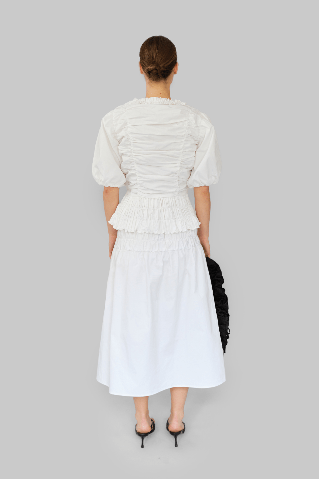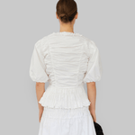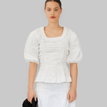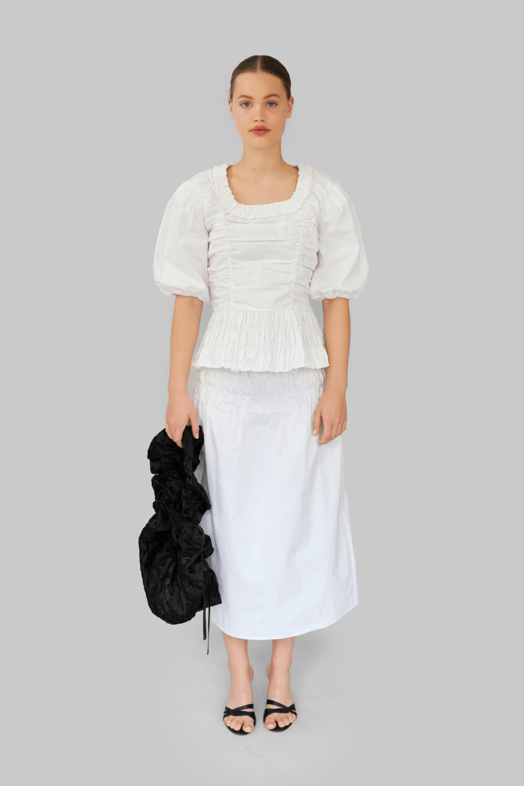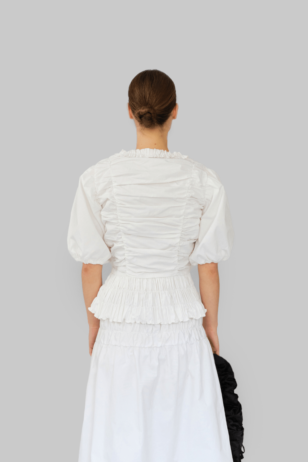 The Gabriella Top is crafted from 100% organic cotton in white. Designed with a square neckline, it features voluminous puff sleeves and ruched detailing throughout the bodice. The hem is finished with gathered ruffles, adding a feminine touch to its structured silhouette.