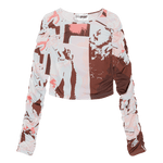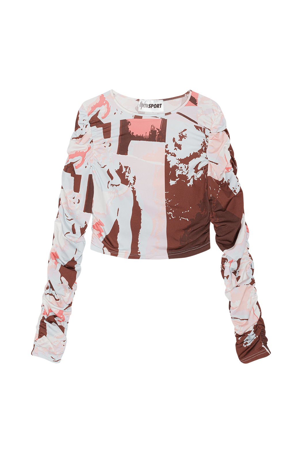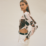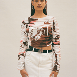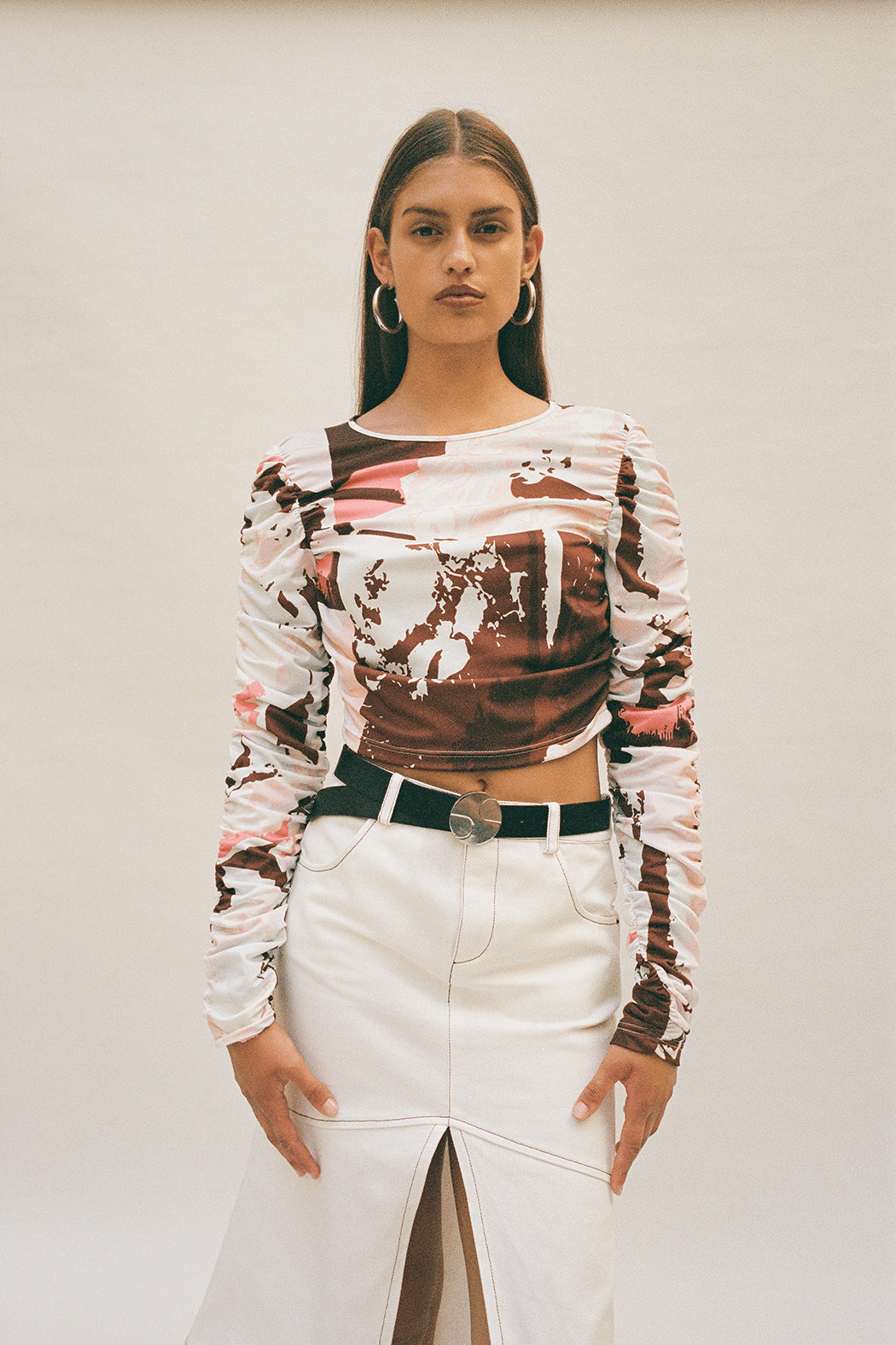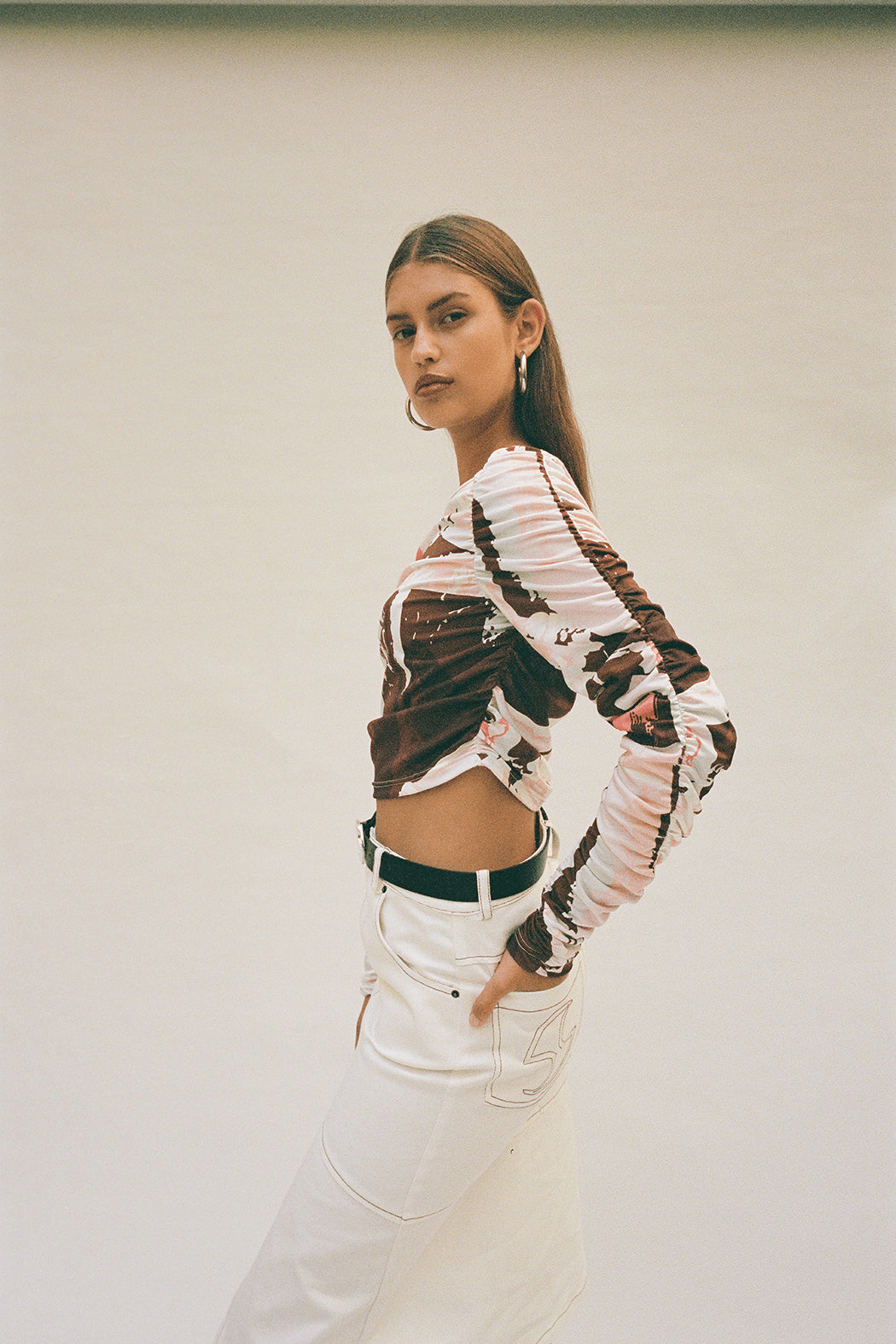 The Jane top is made from printed recycled polyamide and spandex, that is artfully ruched throughout the body and sleeves. It has long sleeves and a cropped cut. Style yours with our denim styles.