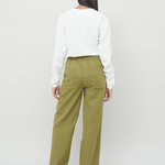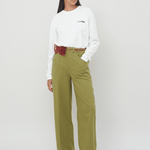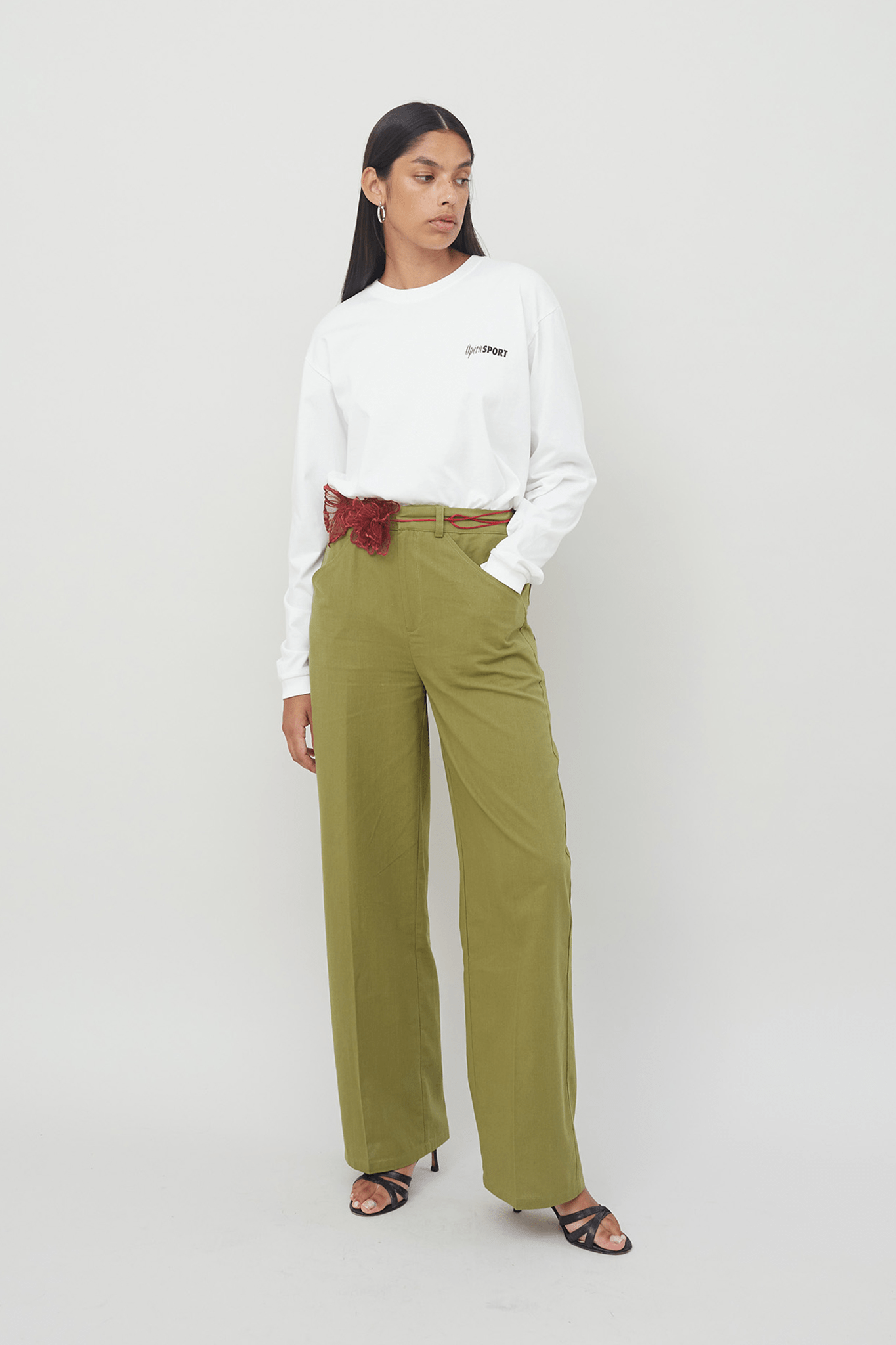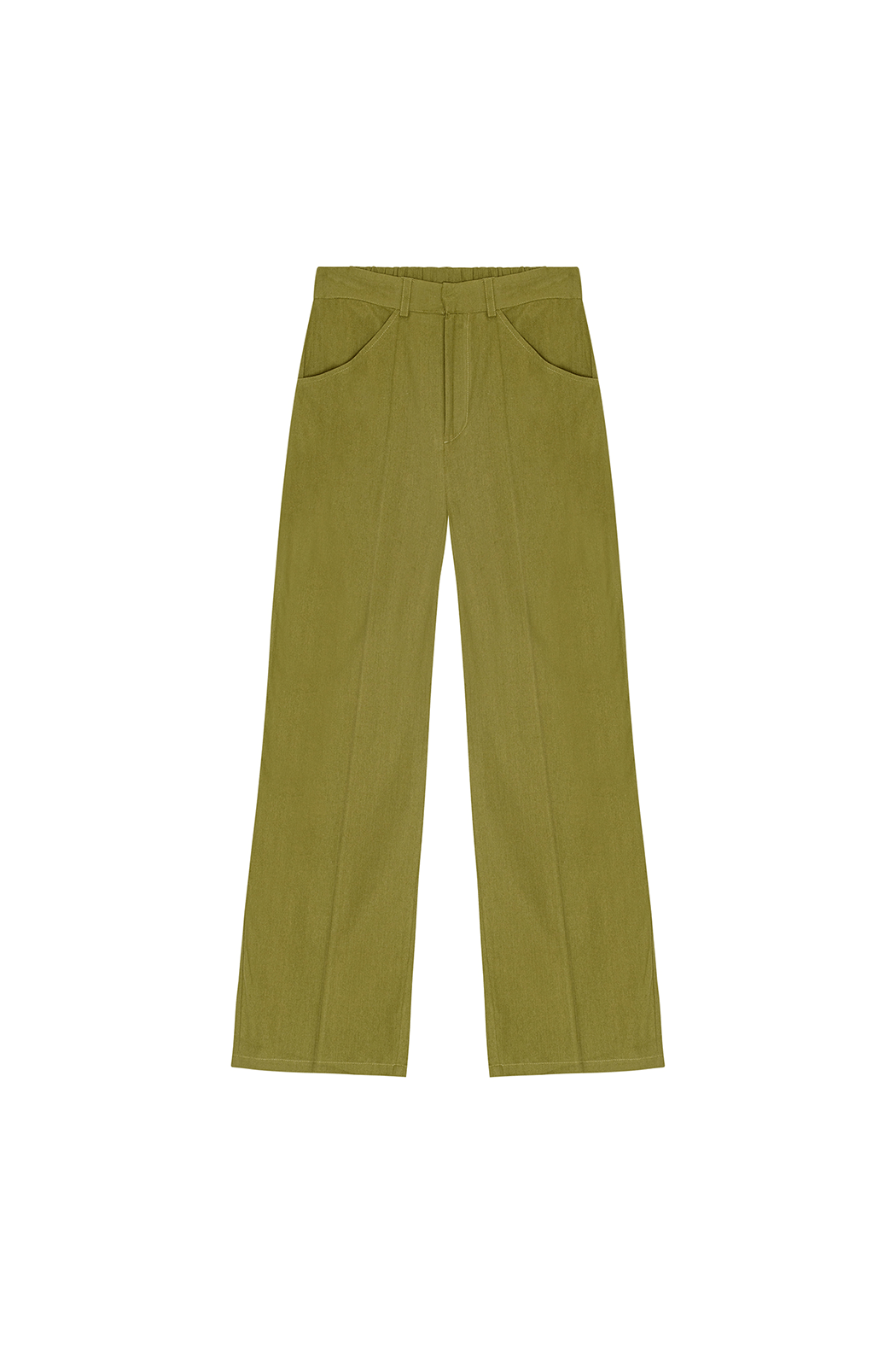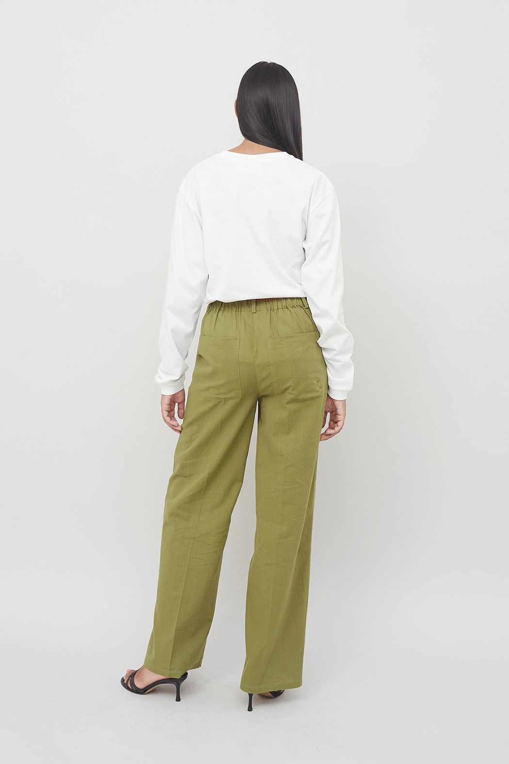 Our Olive pants in olive green are crafted from 100% recycled cotton. Featuring a relaxed fit, zip closure, belt loops and pockets. These pants are made to feel comfortable while looking chic and cool.
