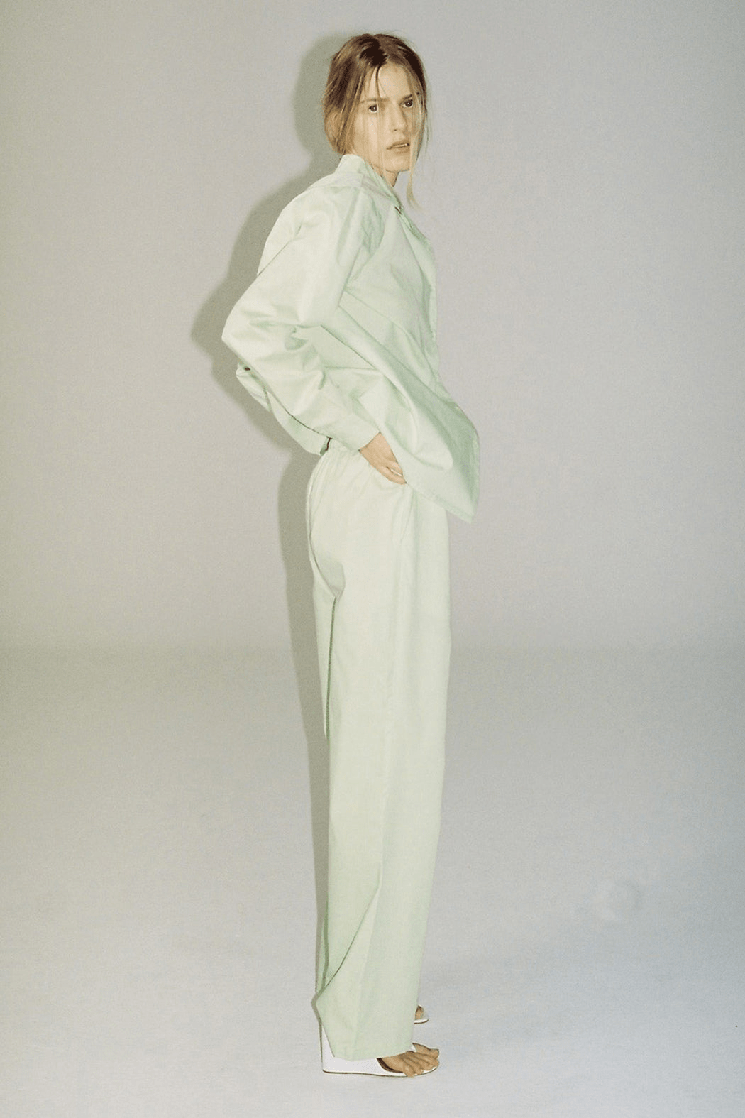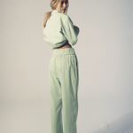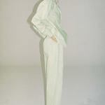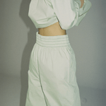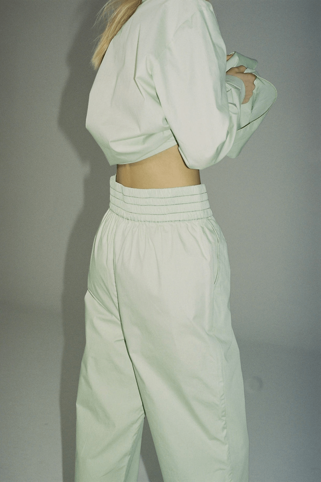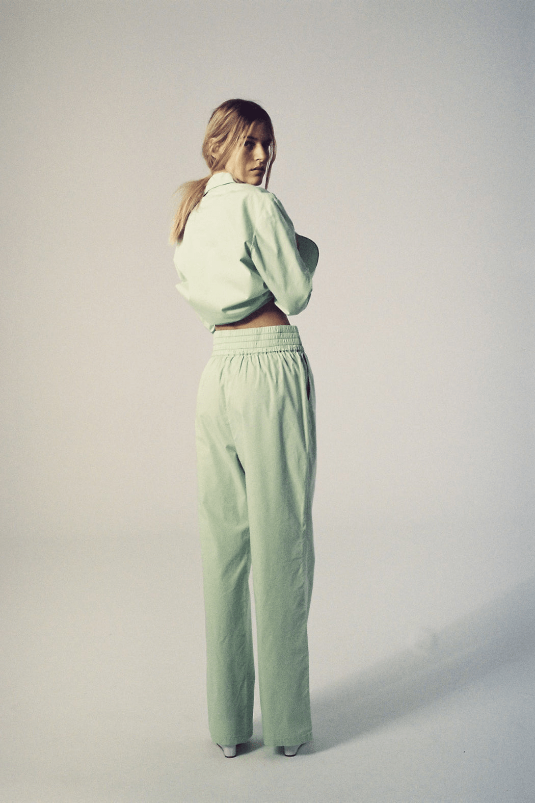 The cool Ramone pants are crafted from crisp green poplin in 100% organic cotton. They have a loose fit with long straight legs and side pockets. The pants have a slip-in design and a wide elastic band at the waist.