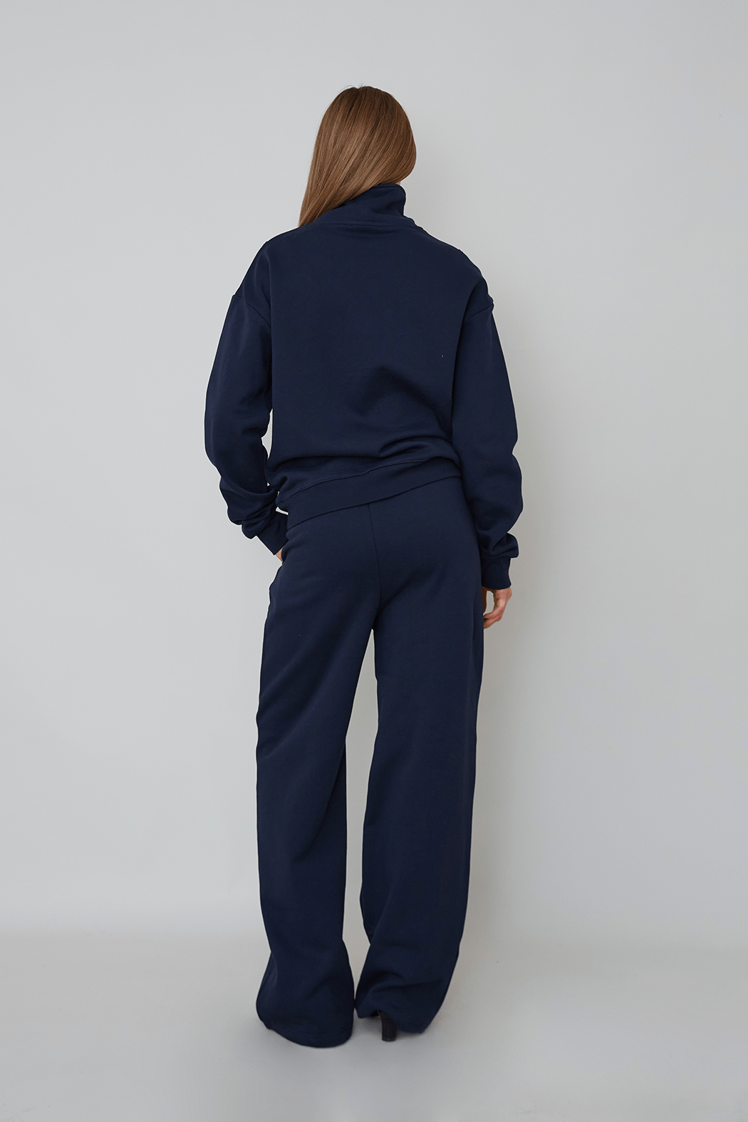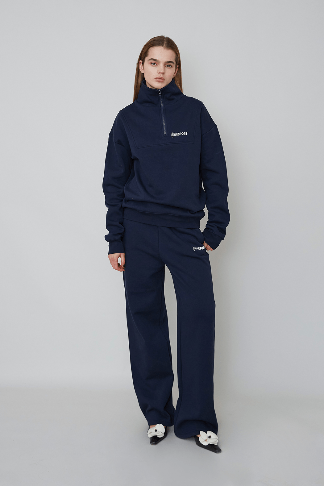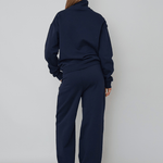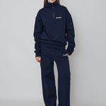 The Navy Rayan Sweatpants are crafted from a soft blend of 65% organic cotton and 35% recycled polyester. It has a loose fit with side pockets, an elasticated waist, and long legs with an OpéraSPORT logo on the left pocket.