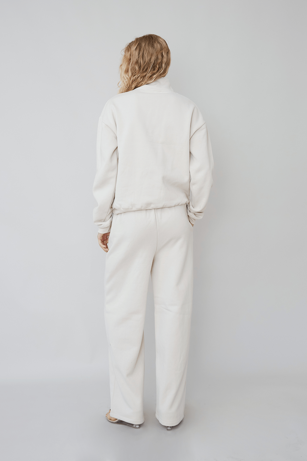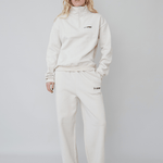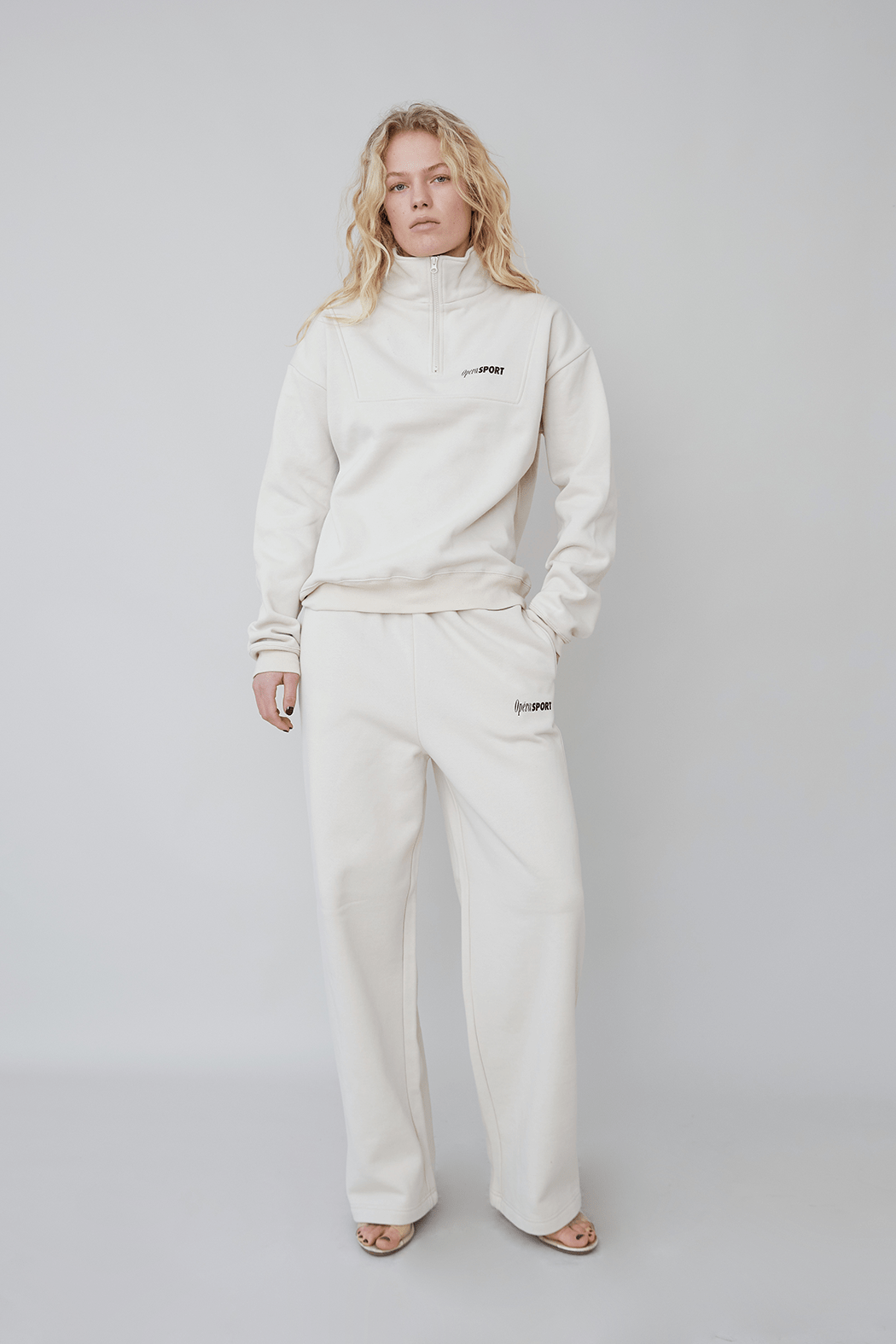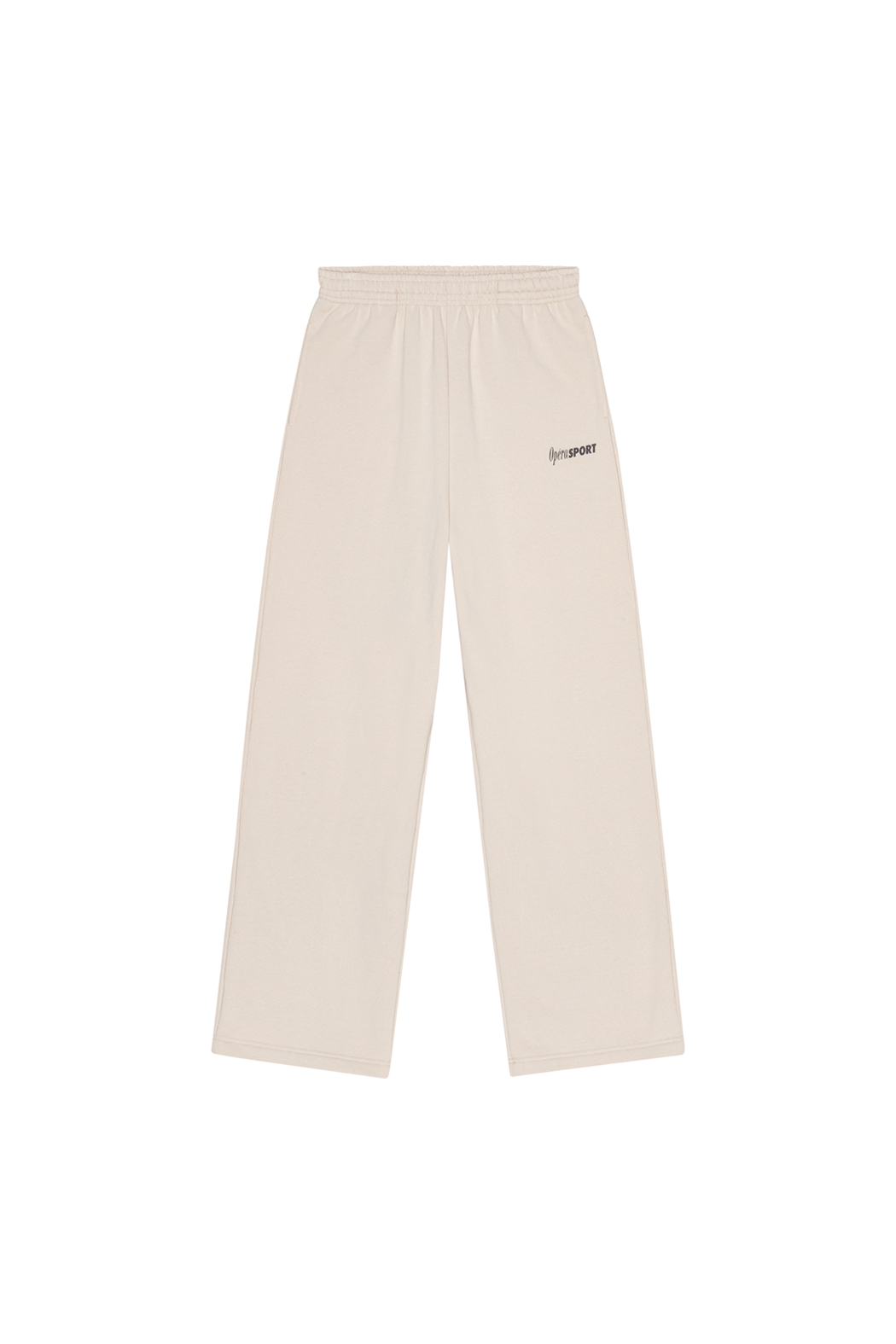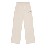The Rayan Sweatpants in beige are crafted from a soft blend of 65% organic cotton and 35% recycled polyester. It has a loose fit with side pockets, an elasticated waist, and long legs with an OpéraSPORT logo on the left pocket.