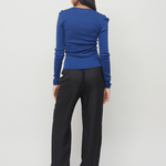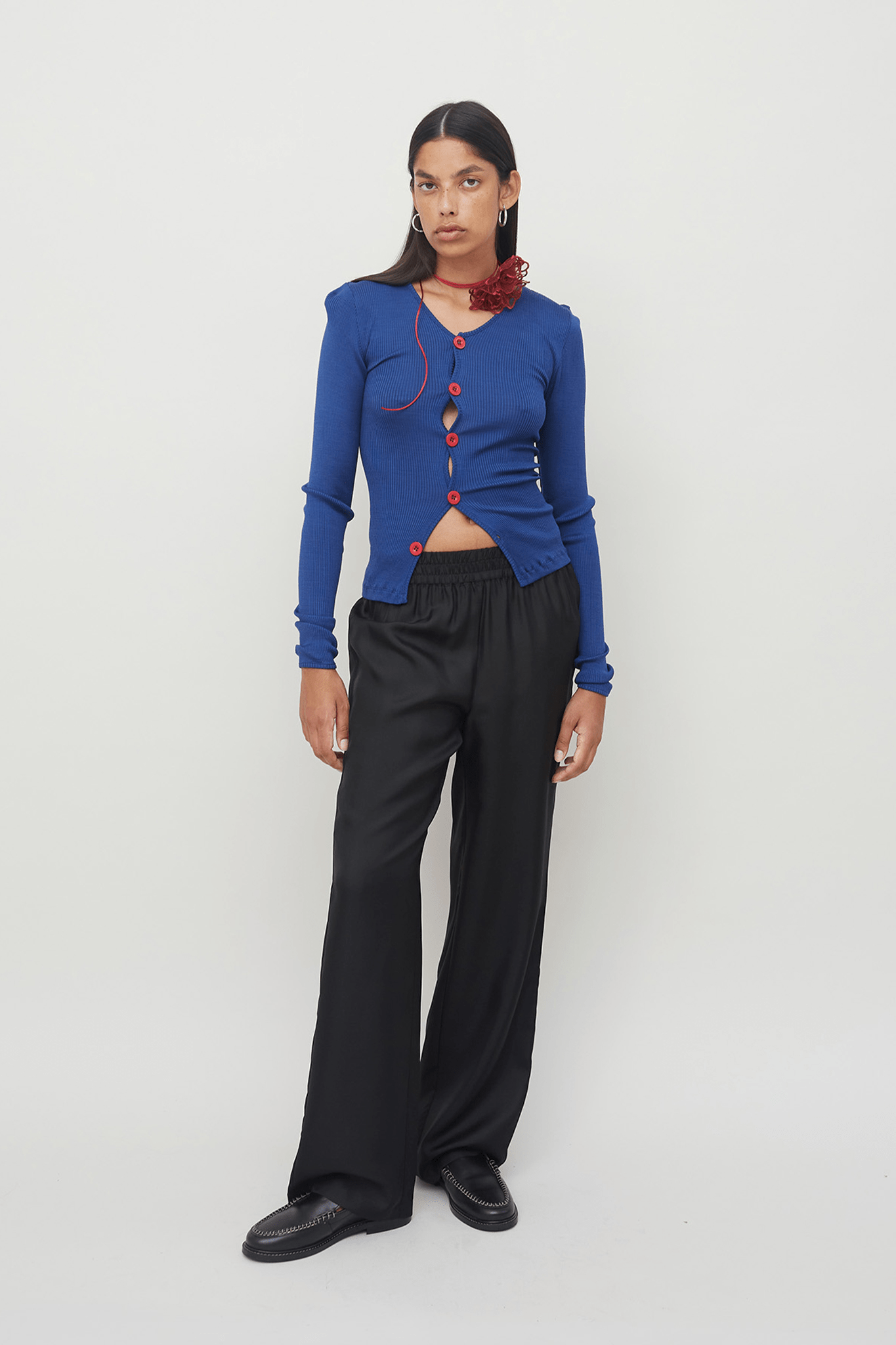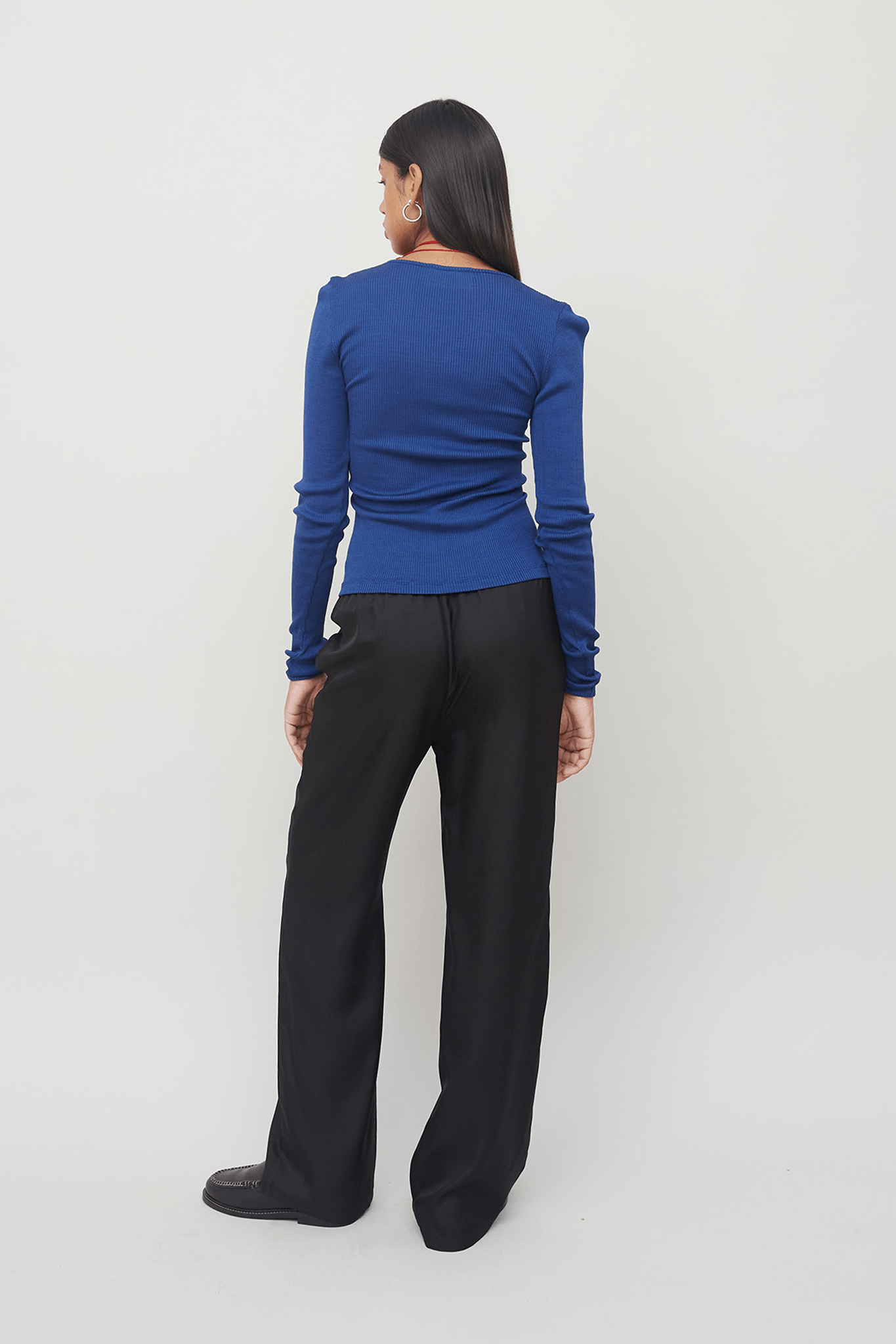 The elegant Renata pants is one of OpéraSPORT's signature pieces. They are crafted from black lightweight fabric in 100% recycled silk. The pants have a slightly loose silhouette with long straight legs and an elasticated waist.
