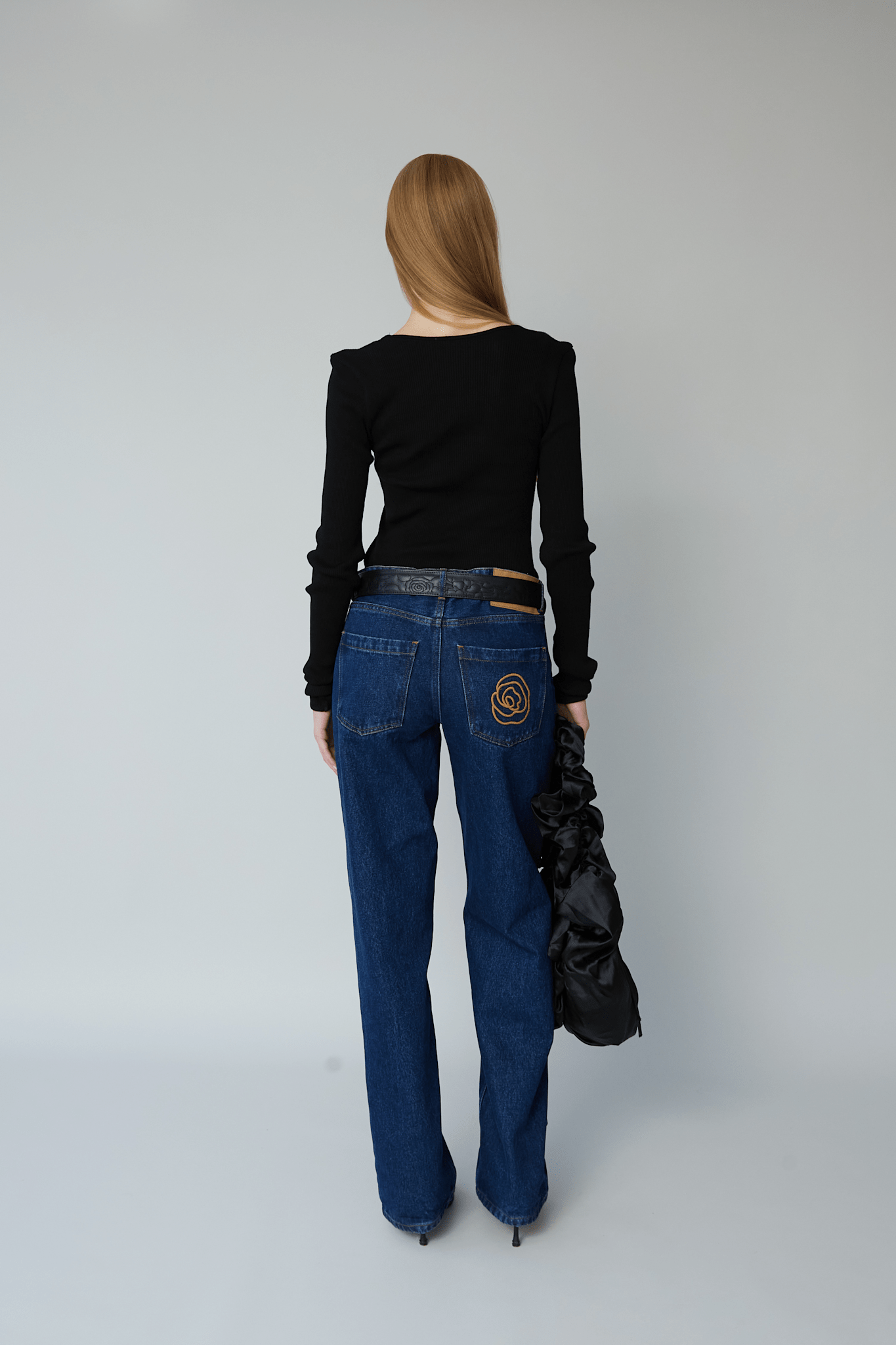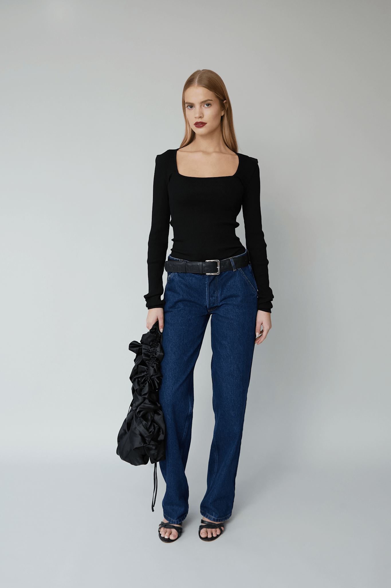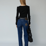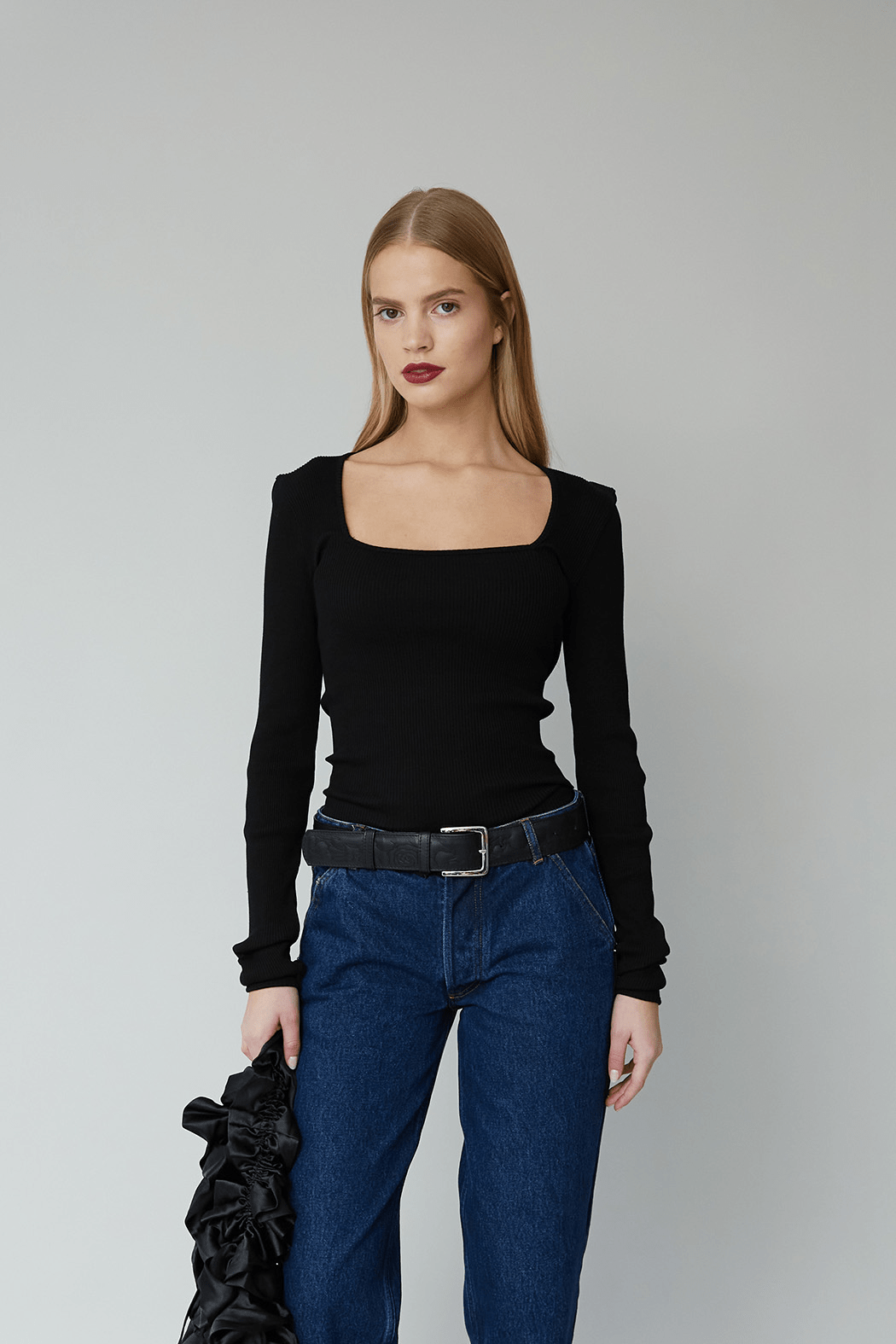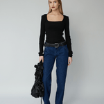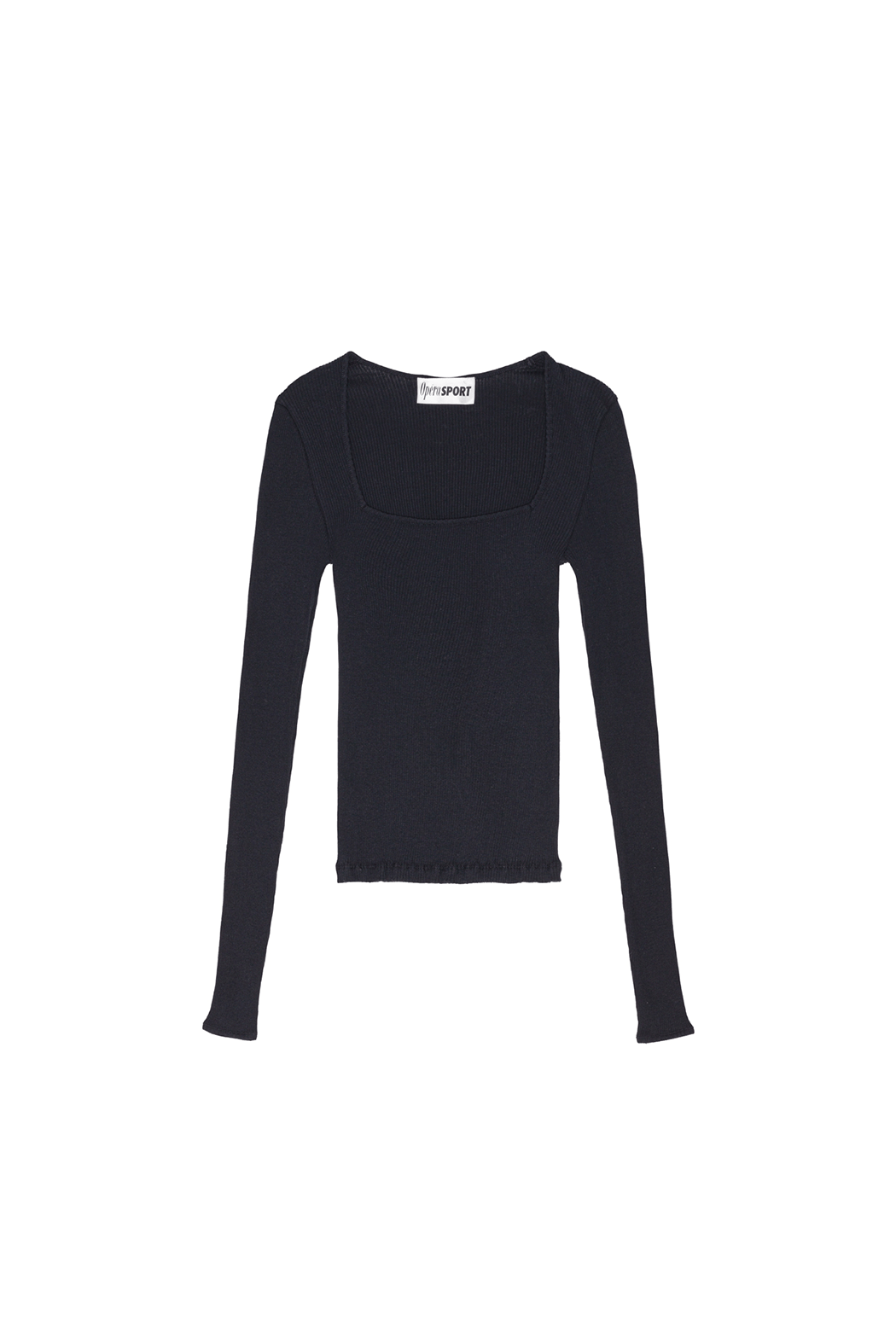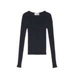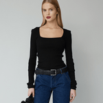 The elegant Rose Top is crafted from black seamless fabric in 100% organic cotton. Rose is all over ribbed and stretchable and has a fitted silhouette with long sleeves and a square neckline.