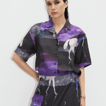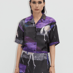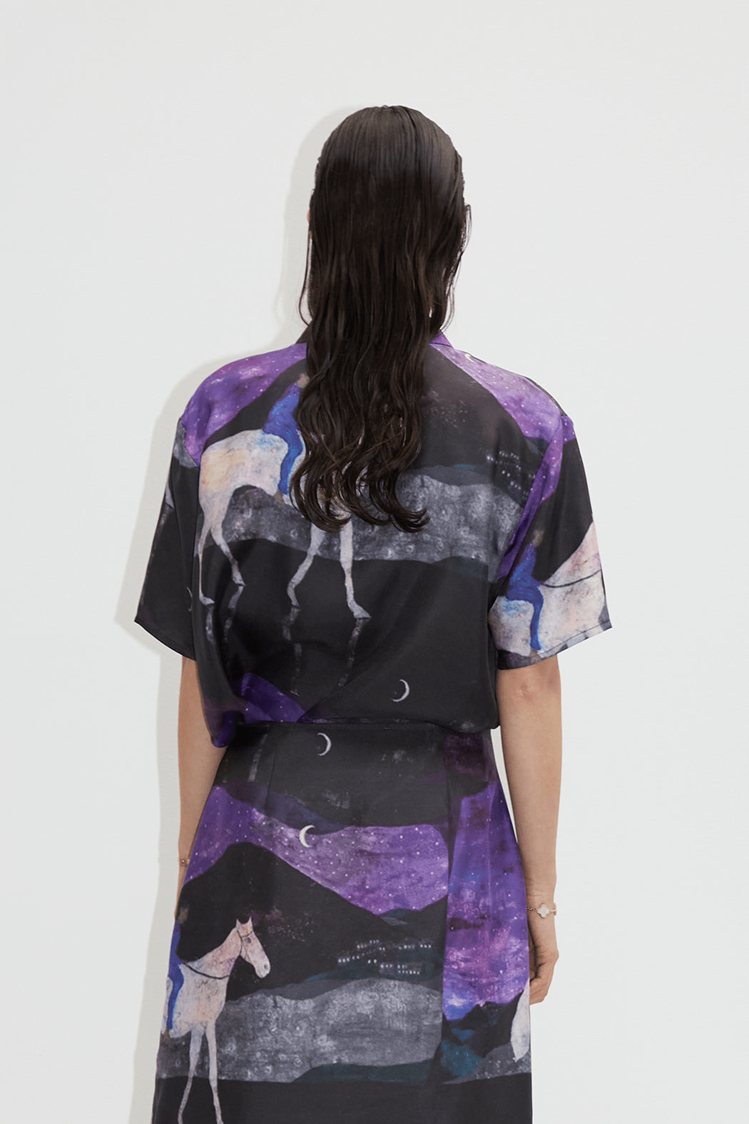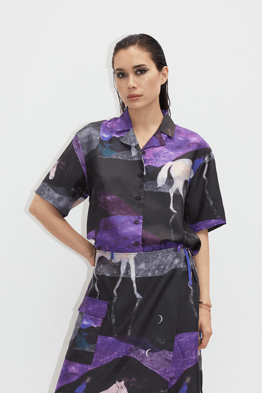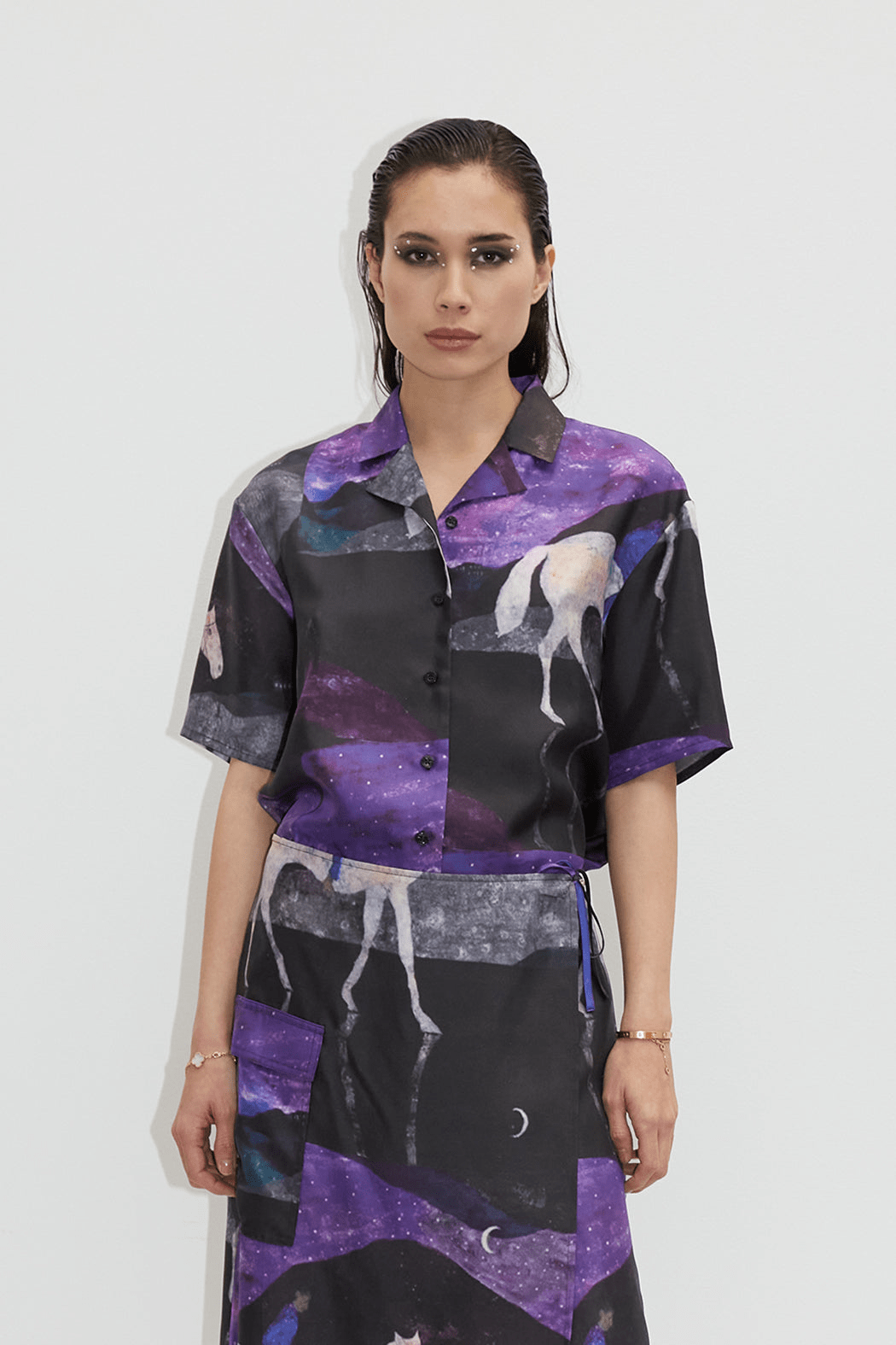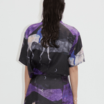 The Tony Unisex shirt is crafted from 100% recycled silk and imprinted with art prints made in collaboration with the artist Tom Anholt in blue, purple and black shades. It features short sleeves, black front buttons and a soft-to-the-touch, shiny satin finishing.