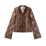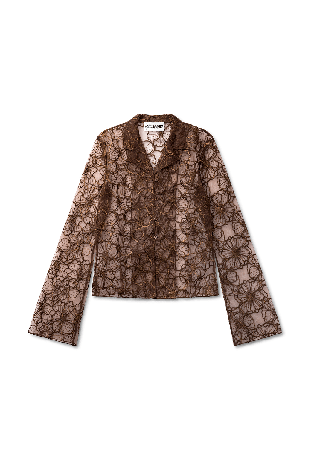 The beautiful lacy Flora shirt in brown is crafted from 100% recycled polyester. The shirt is designed with buttons down the center and a collar along a v-neck cut. Flora is very elegant and can be worn over a top or dress, as well as with less underneath for a more daring look.