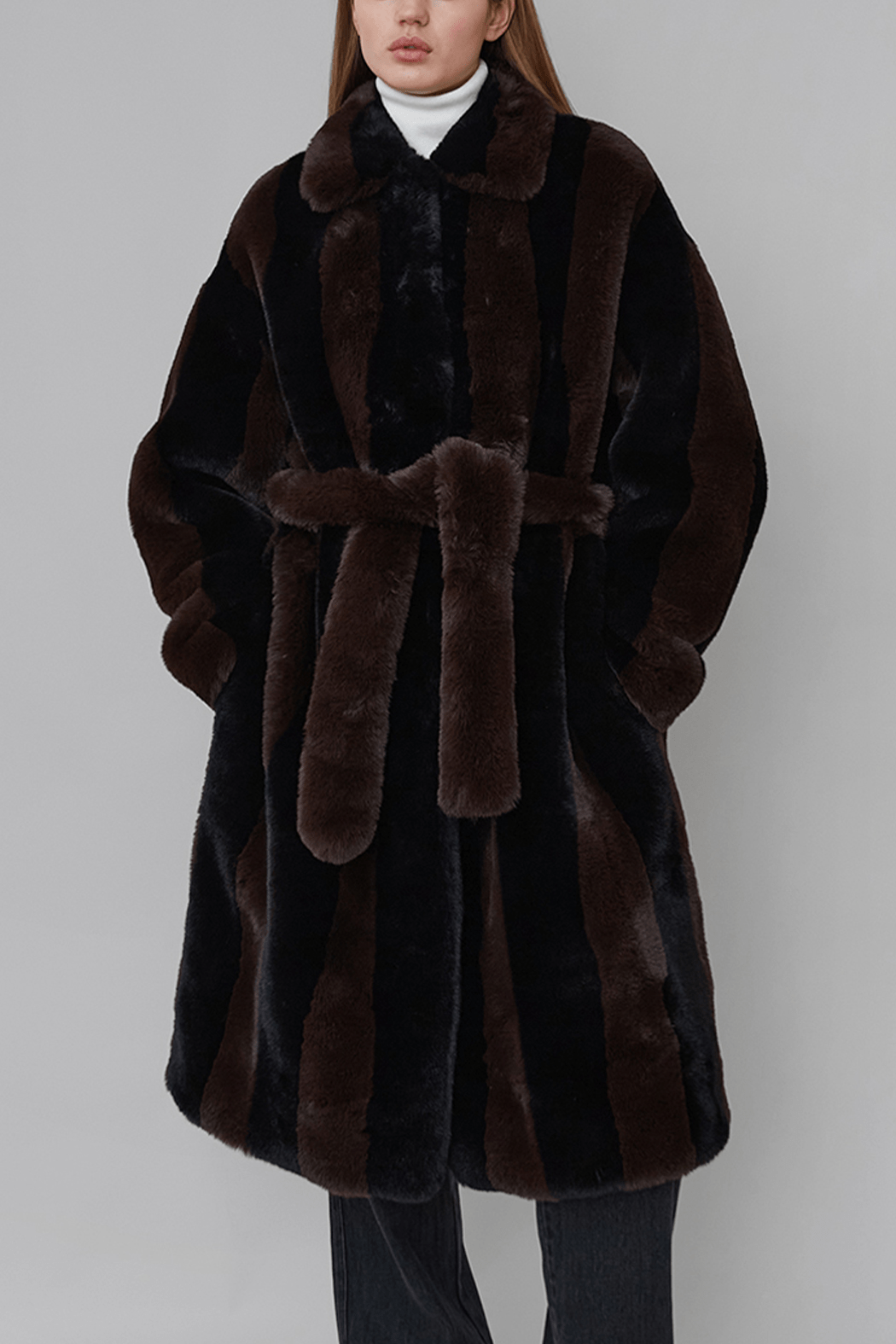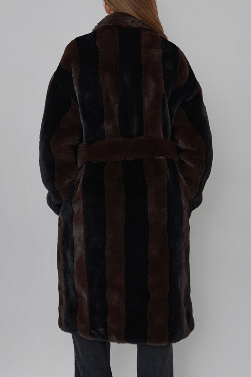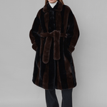 Our dreamy Estelle Coat is crafted from the softest 100% recycled polyester. It features an oversized fit with alternating black and dark brown stripes. The coat includes two full pockets, a collar, and closes with a belt. The fullness of the coat gives it an elegant and elevated look.