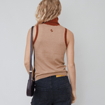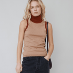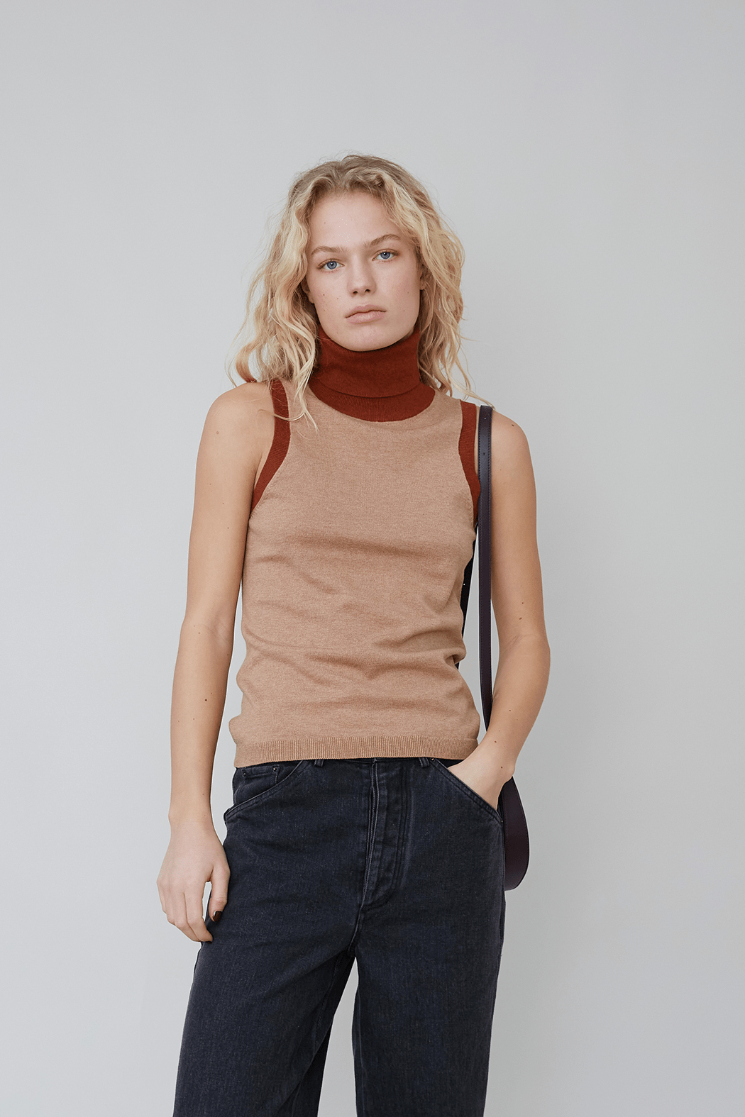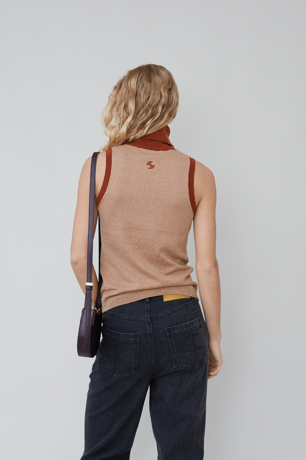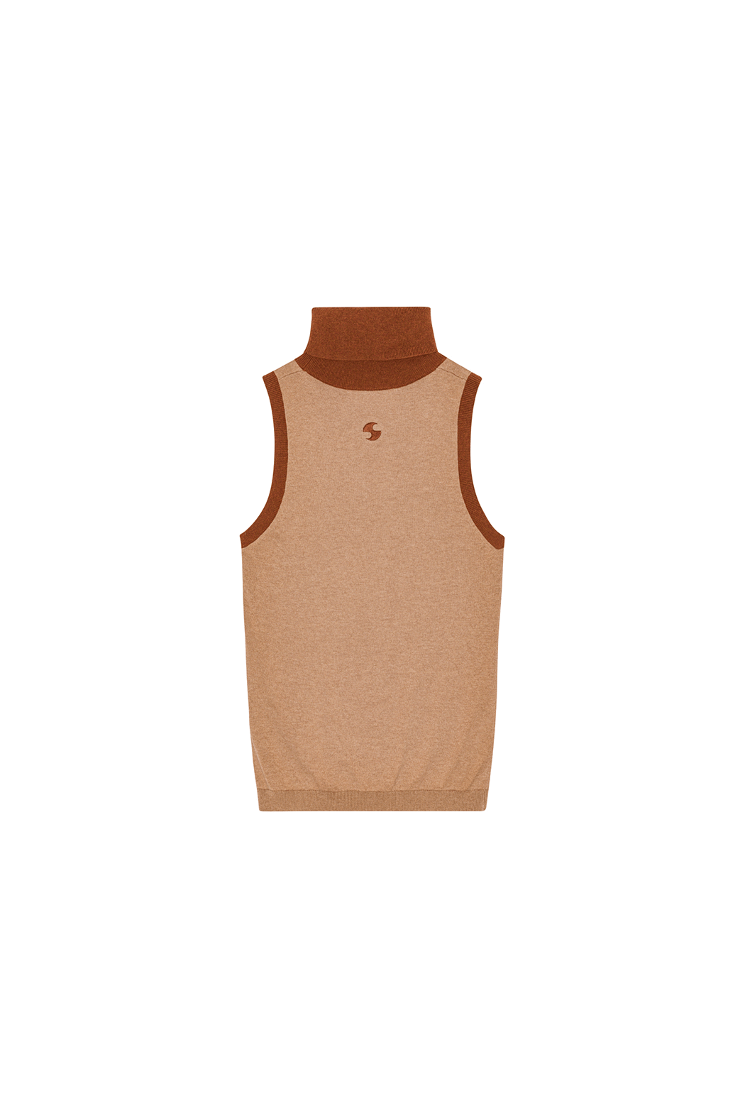 Juliette is crafted from soft 30% RWS wool and 70% organic cotton. The top is a light camel color with darker edges and a high neck. The back features the signature OpéraSPORT logo.