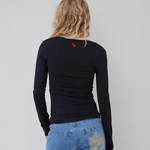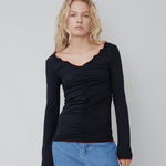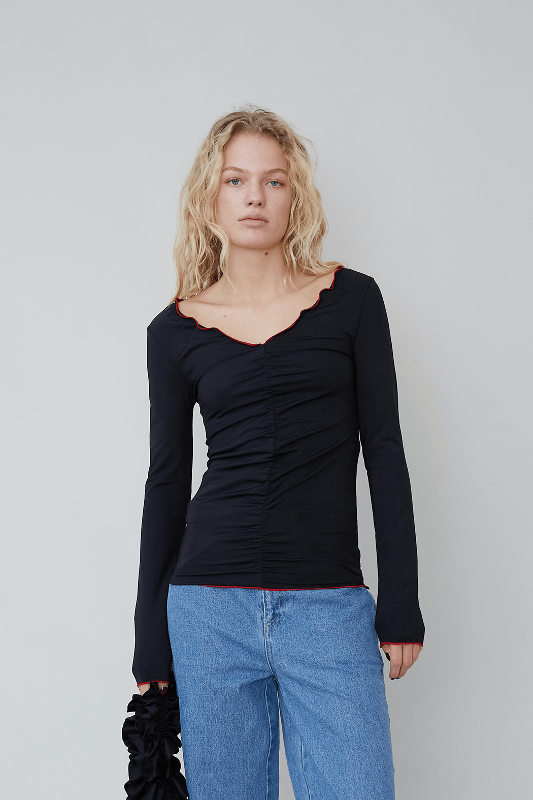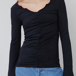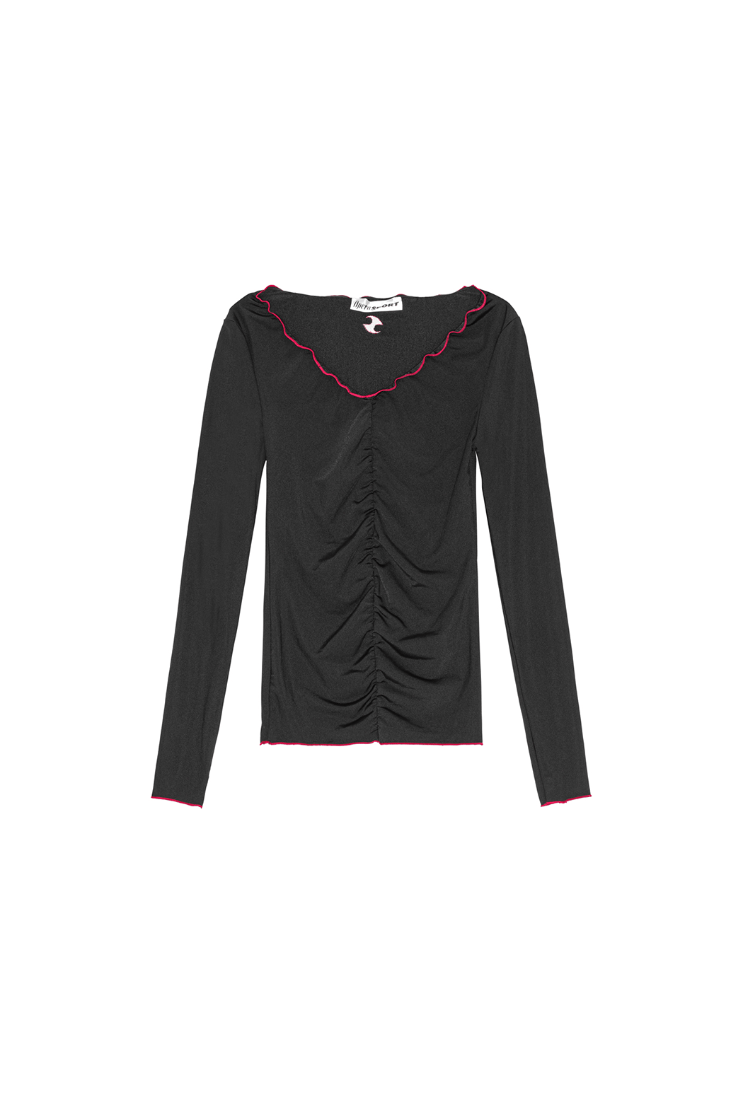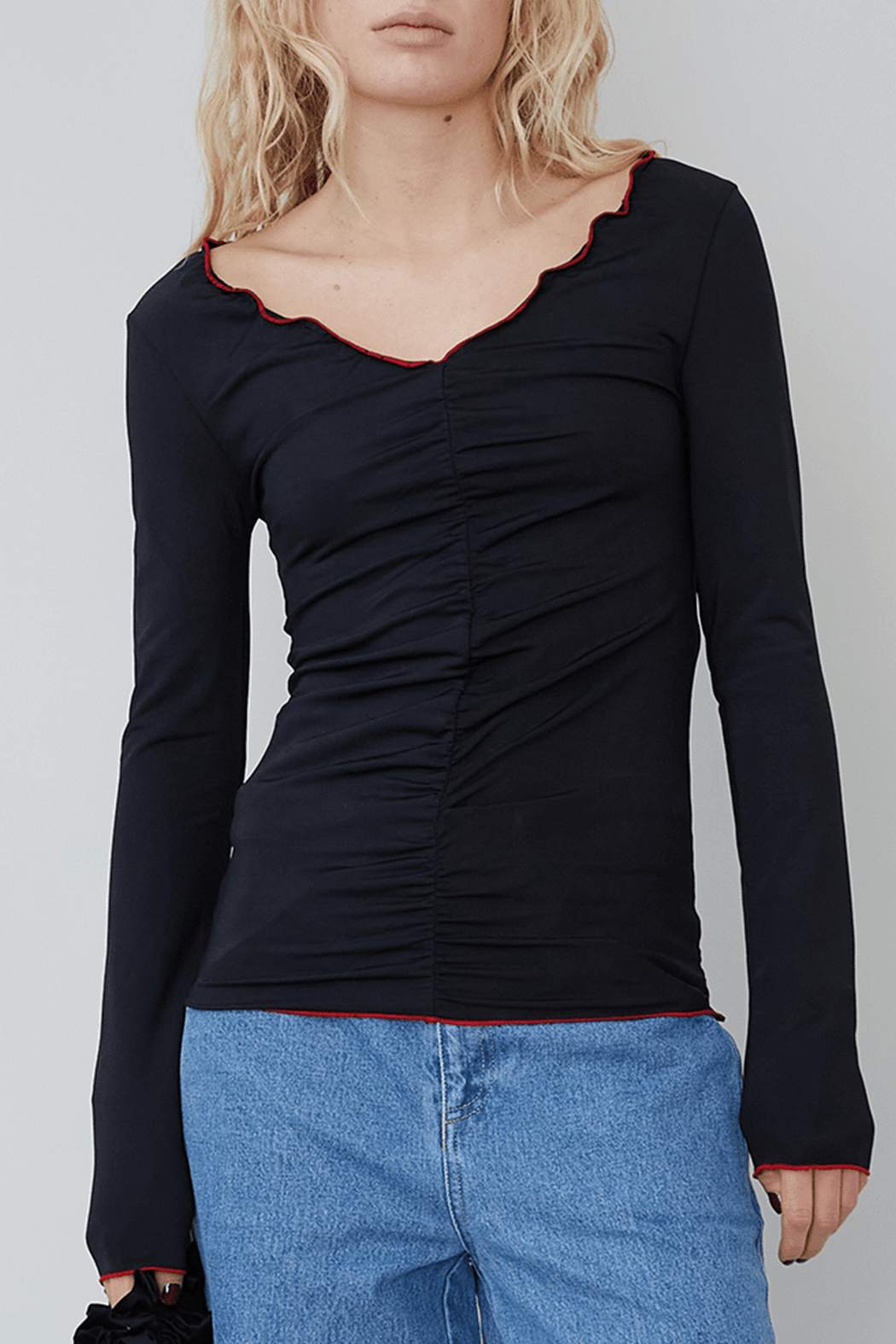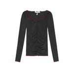 The Sophia Top is made from 82% recycled polyester and 18% spandex, featuring a sporty fabric with an elegant appearance. It fits closely against the body, showcasing a v-neckline that transitions into ruched detailing down the body. This black top is accented with red ruffled stitching along the neckline, sleeve edges, body, and includes a logo on the back of the neck.
