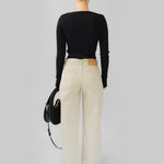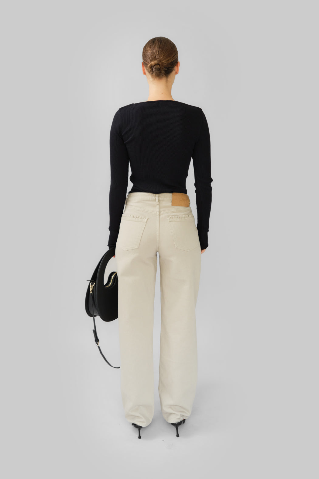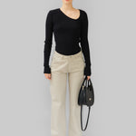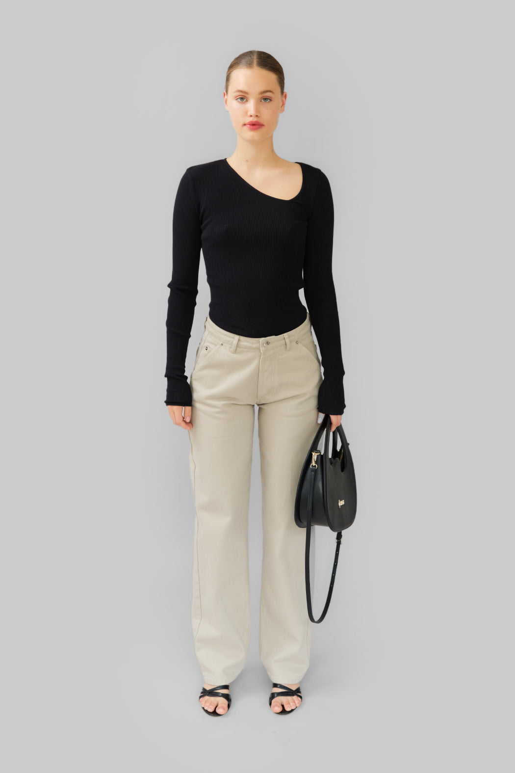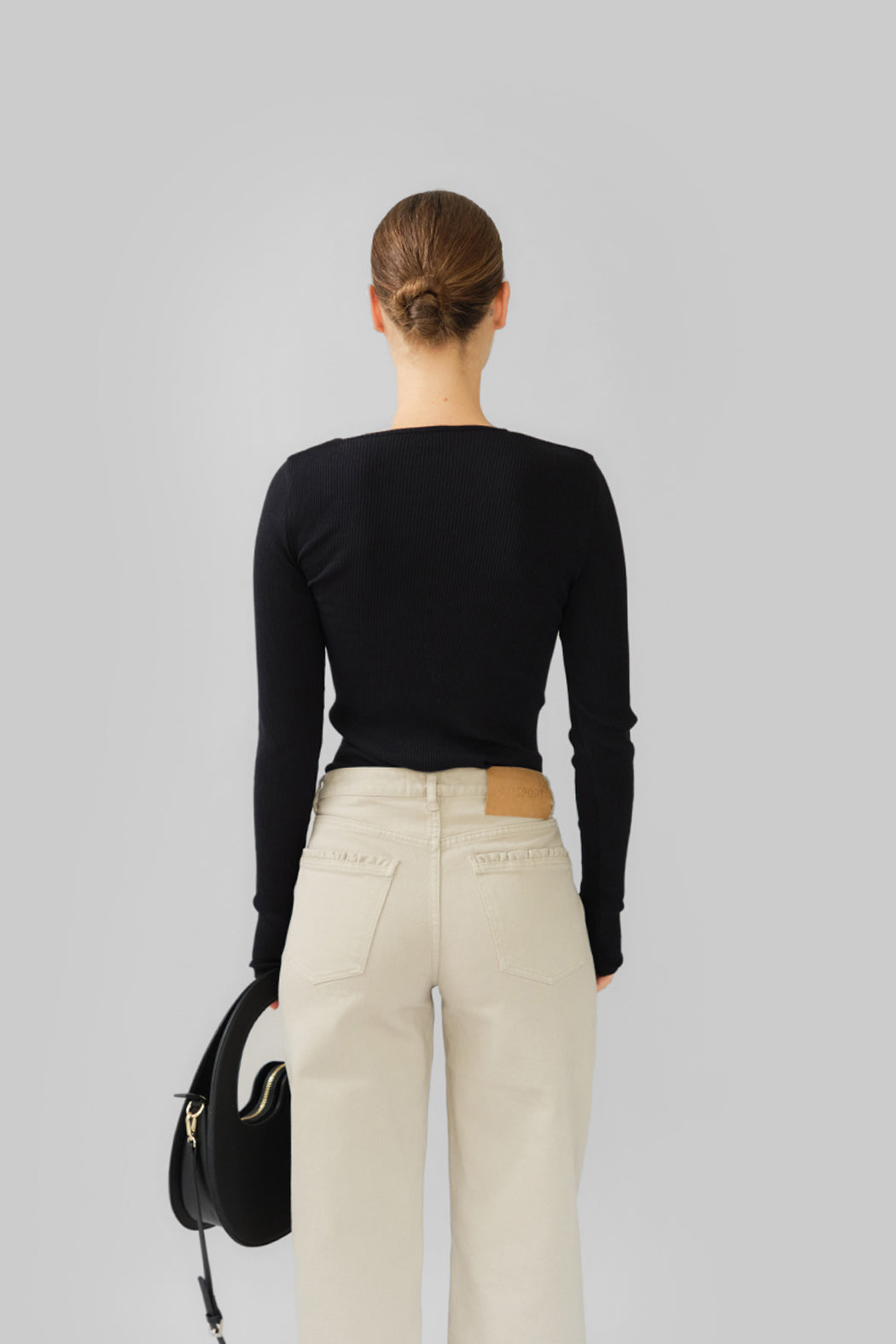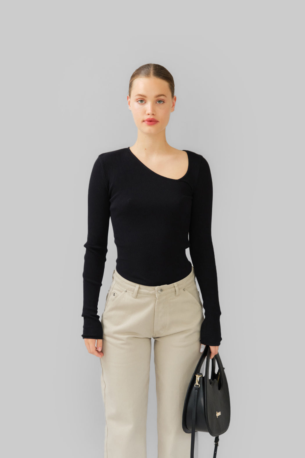 Our signature Eve Top is crafted from black 100% organic cotton. The top with the asymmetrical neckline has been part of OpéraSPORT's DNA since the beginning. The seamless top closely hugs your figure and fits all shapes and sizes.  It features a close fit, asymmetric V-neckline, straight hem, and all-over ribbed detailing. Please note that our seamless styles are designed with significant stretch, which is why the measurements in our size guide show only minimal variation.