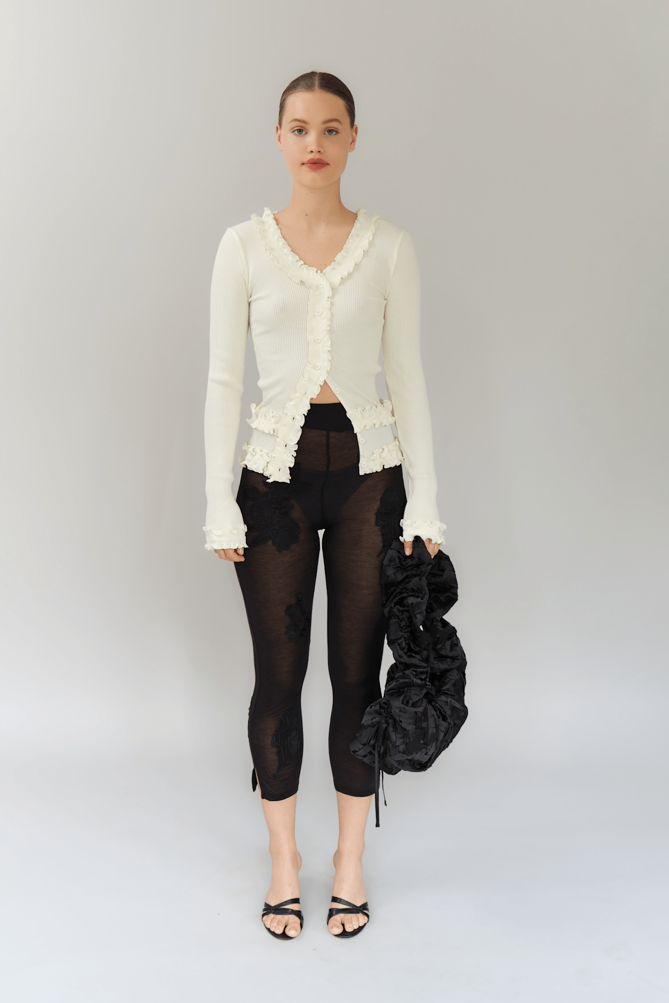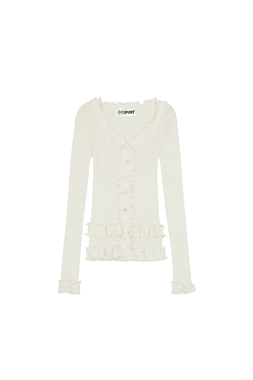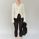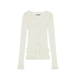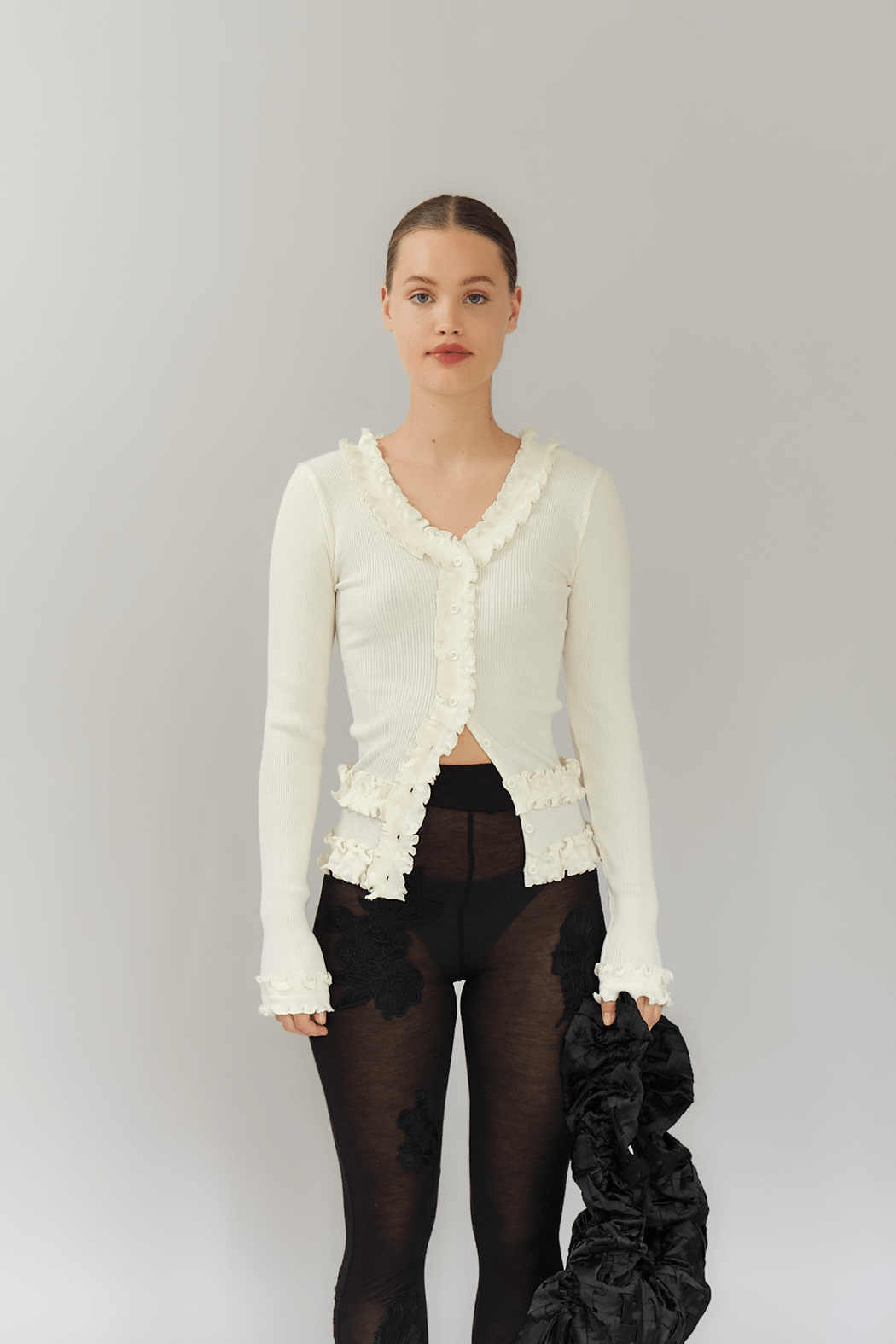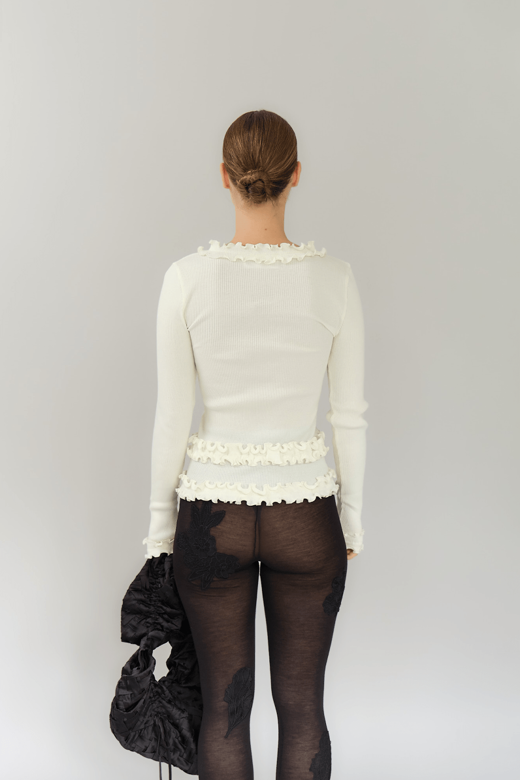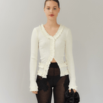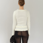 Our stunning Caroline seamless top in white is crafted from 100% organic cotton, combining comfort with style. It features delicate black ruffle details throughout and a flattering V-neckline, making it a versatile addition to any wardrobe.