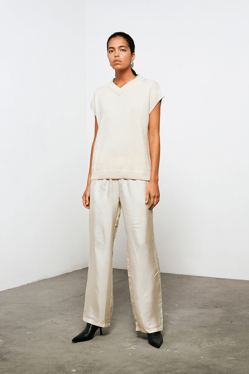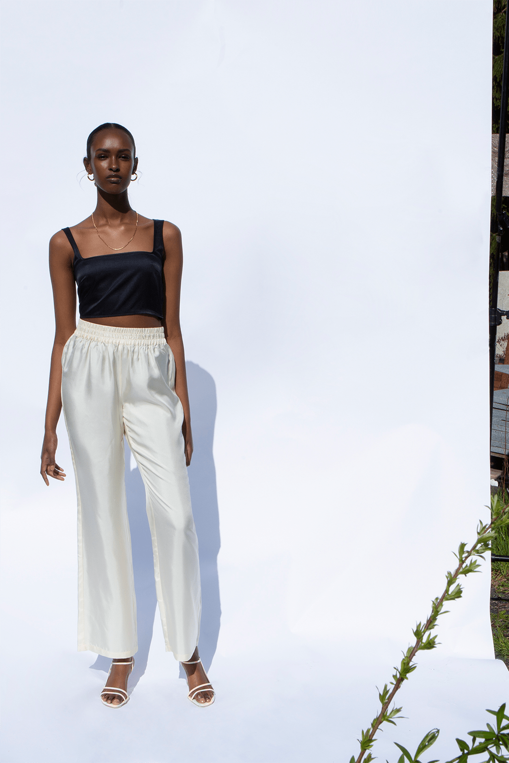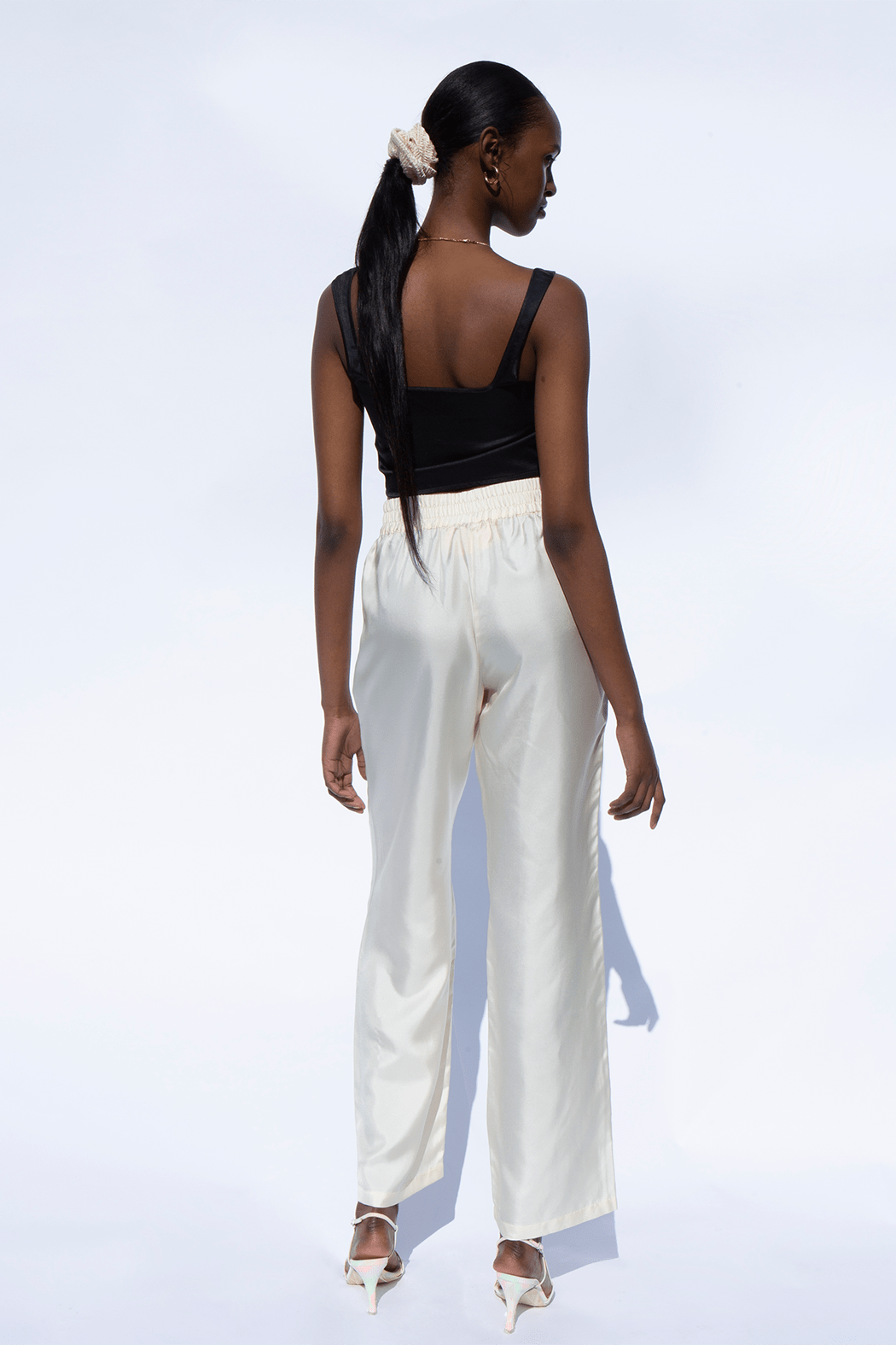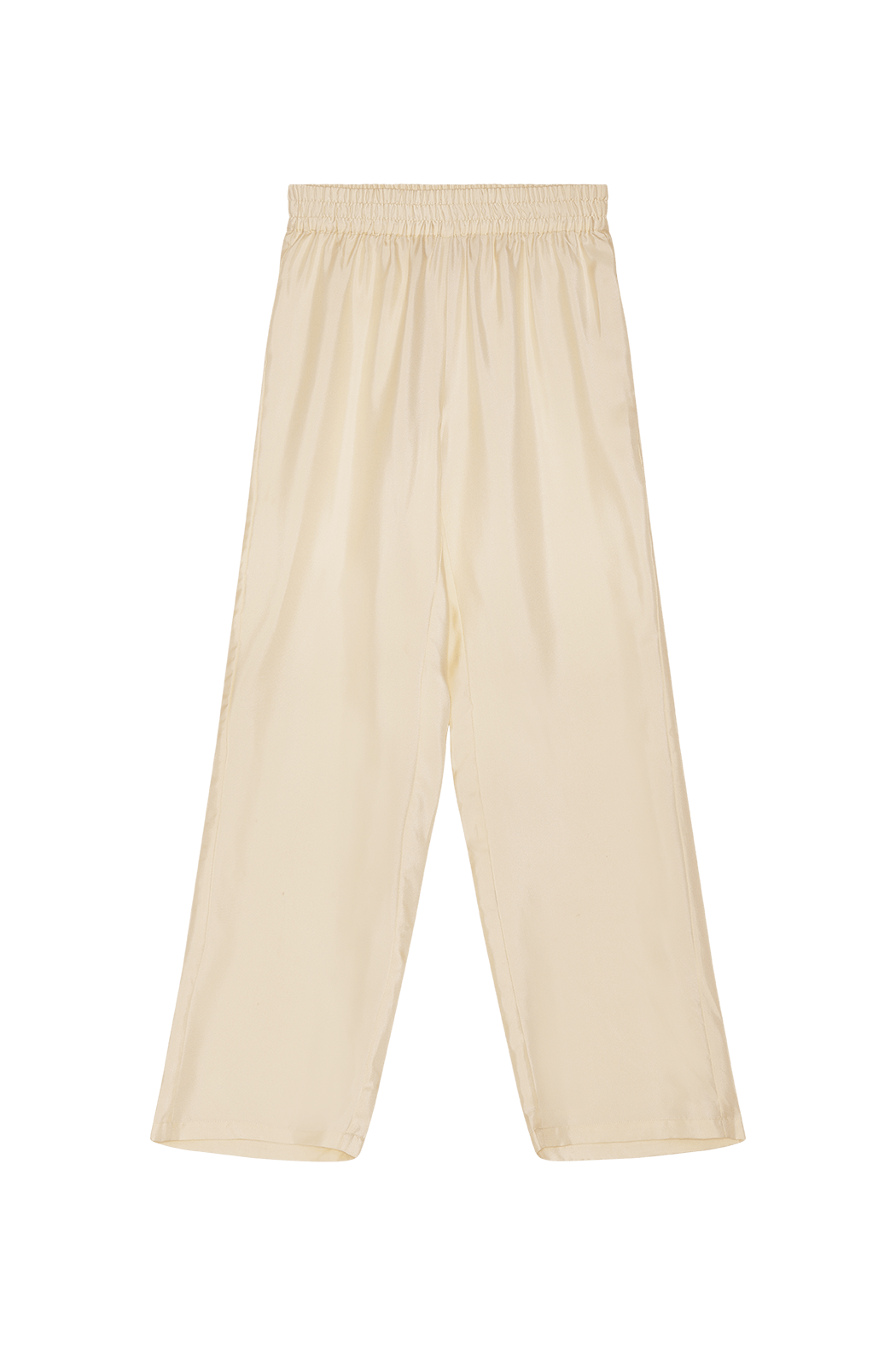 The elegant Renata pants is is one of OpéraSPORT's signature pieces. They are crafted from lightweight fabric in 100% recycled silk. The pants have a slightly loose silhouette with long straight legs and an elasticated waist.