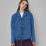The Tavon Shirt is crafted from indigo blue denim in 100% organic cotton. It has a boxy fit with long sleeves, a wide collar, and one front pocket with embroidered OpéraSPORT logo on. The shirt has ties down along the body that can either be left undone or knotted into a bow.