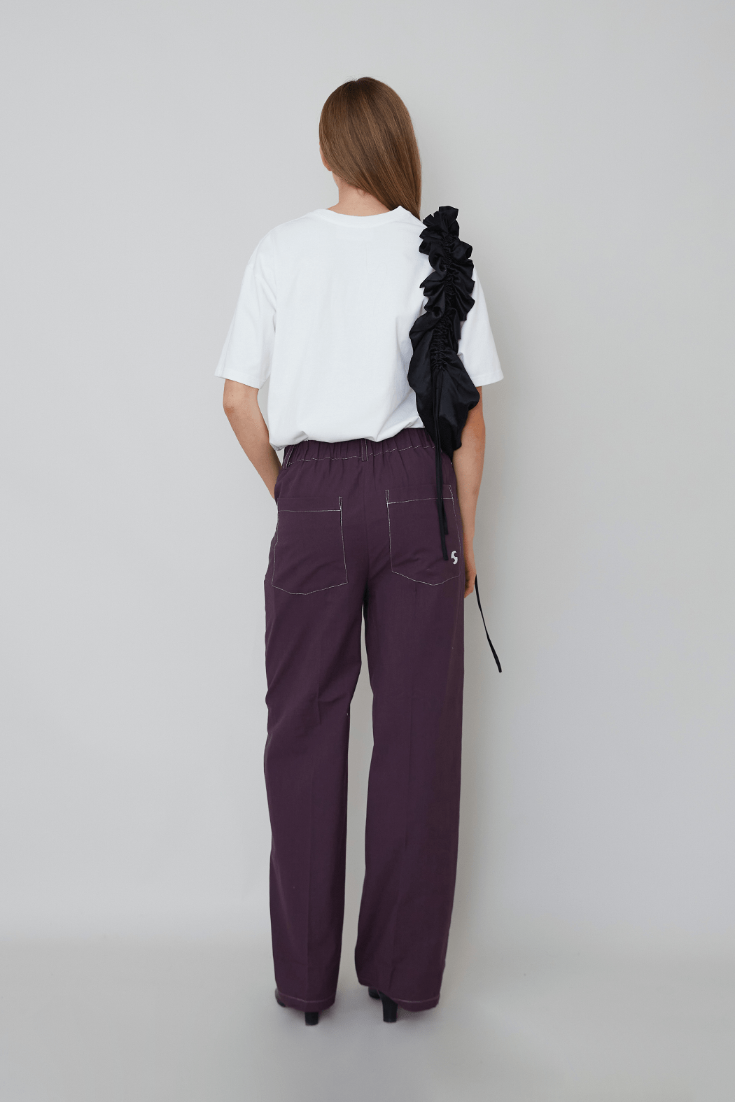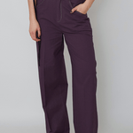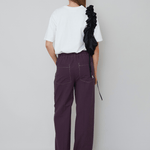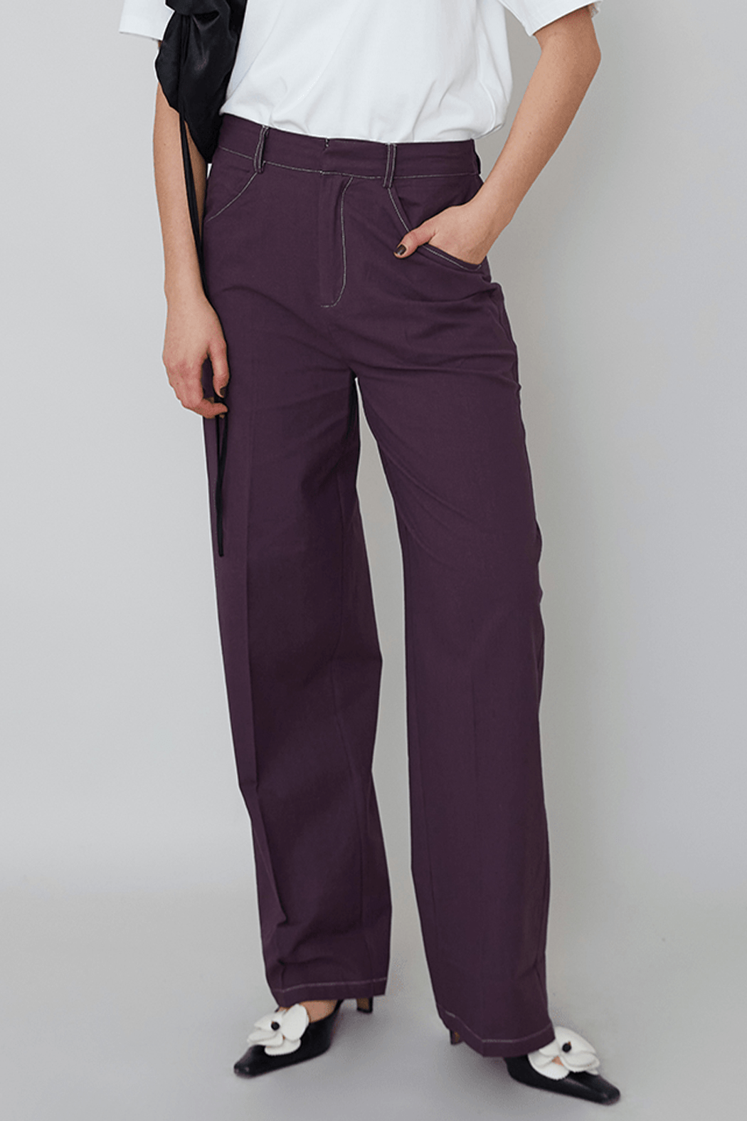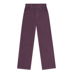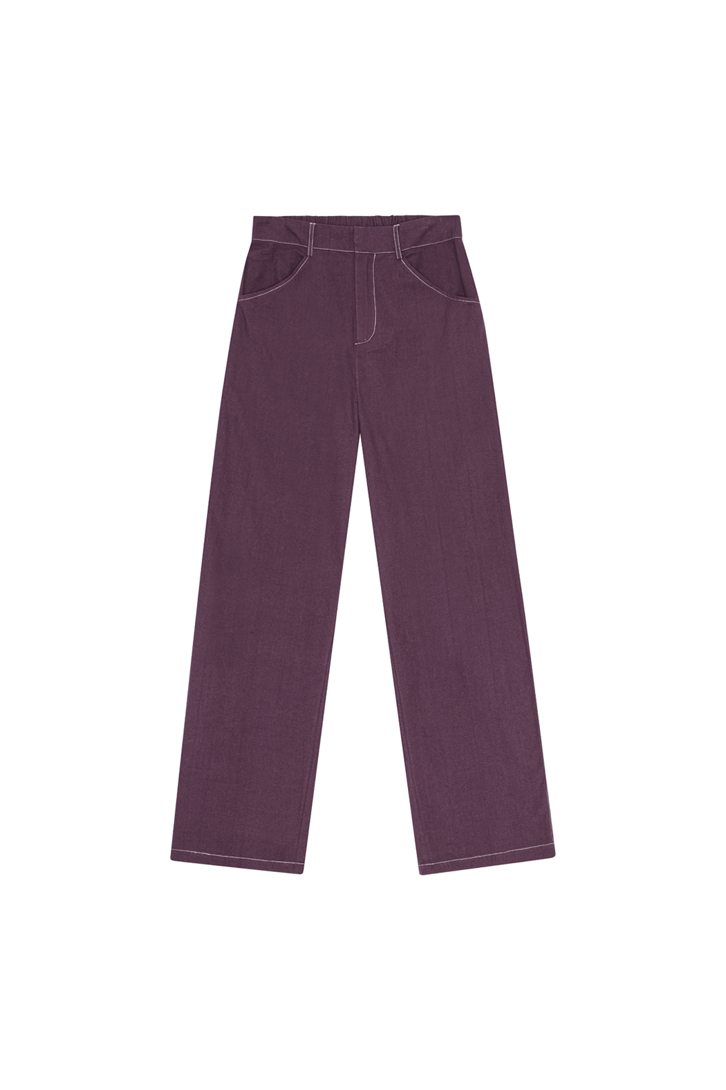 Our Olive Pants are crafted from 100% recycled cotton. Olive unisex trousers offer a high-waisted fit in a striking plum color, complemented by contrasting white stitching. It features two front and two back pockets along with zipper and one button fastening.