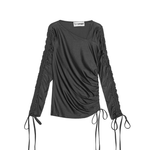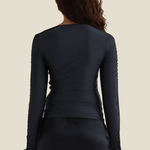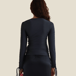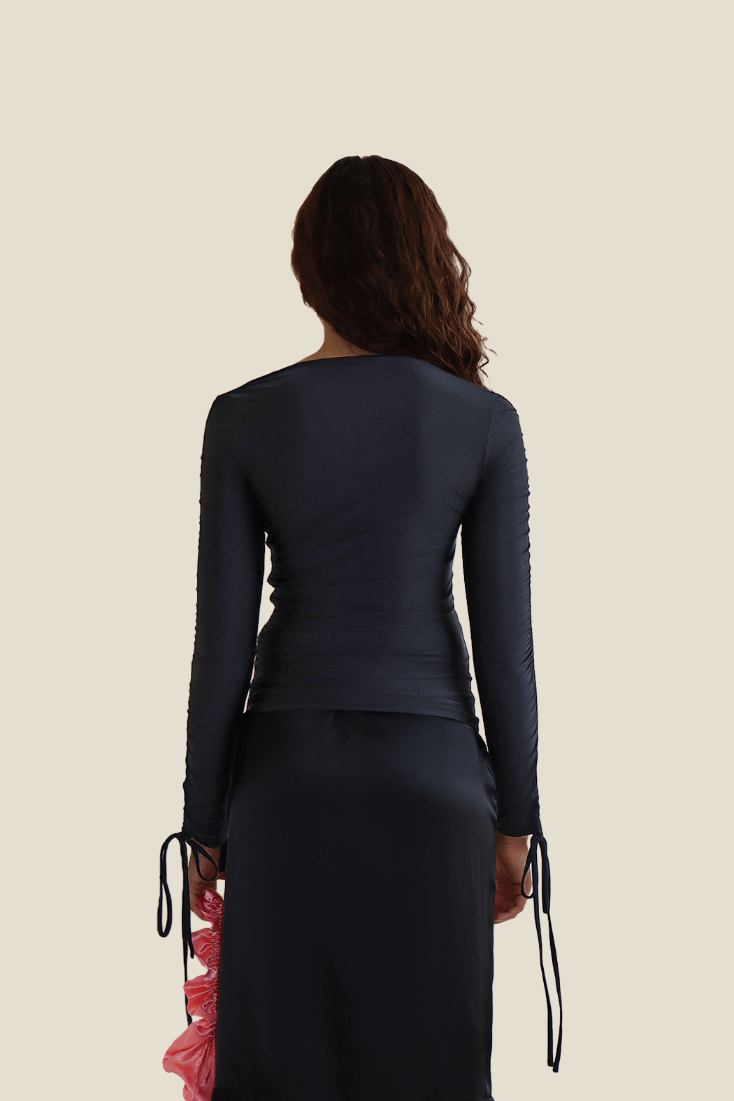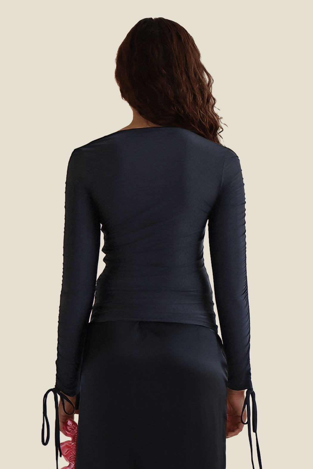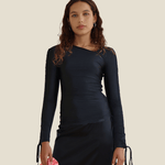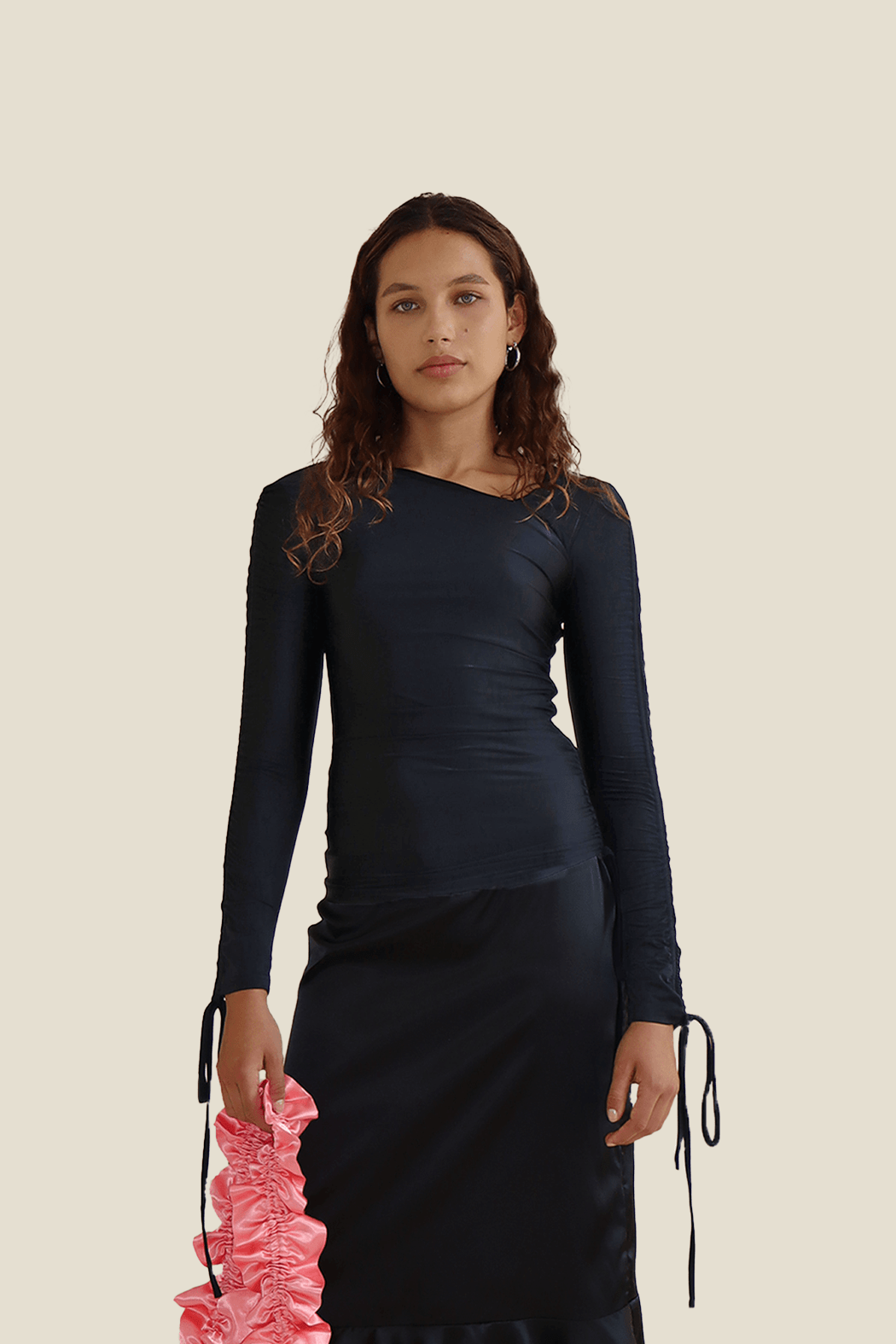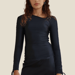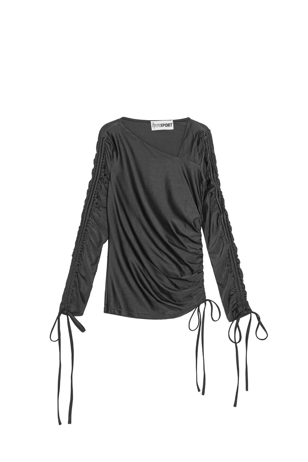 The Anais Top in black is crafted from a blend of 75% recycled polyamide and 25% spandex. This fitted top features an eye-catching asymmetrical neckline and elegant ruched detailing on both sleeves. The look is completed with adjustable ties at the ends of the sleeves, adding a playful yet stylish touch.
