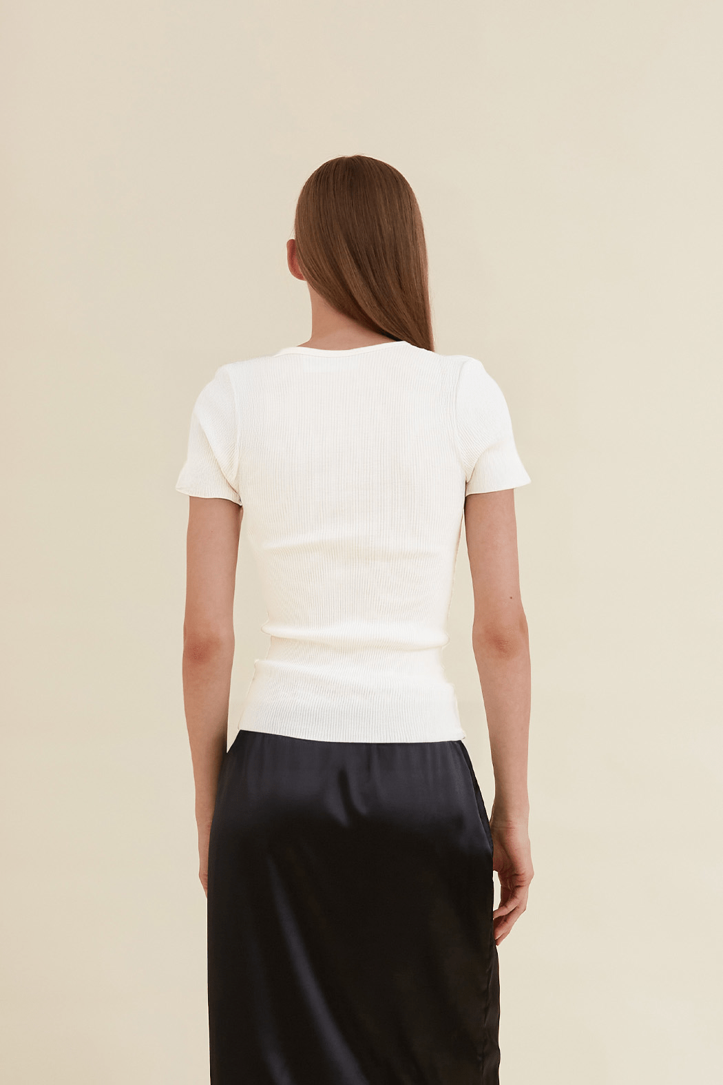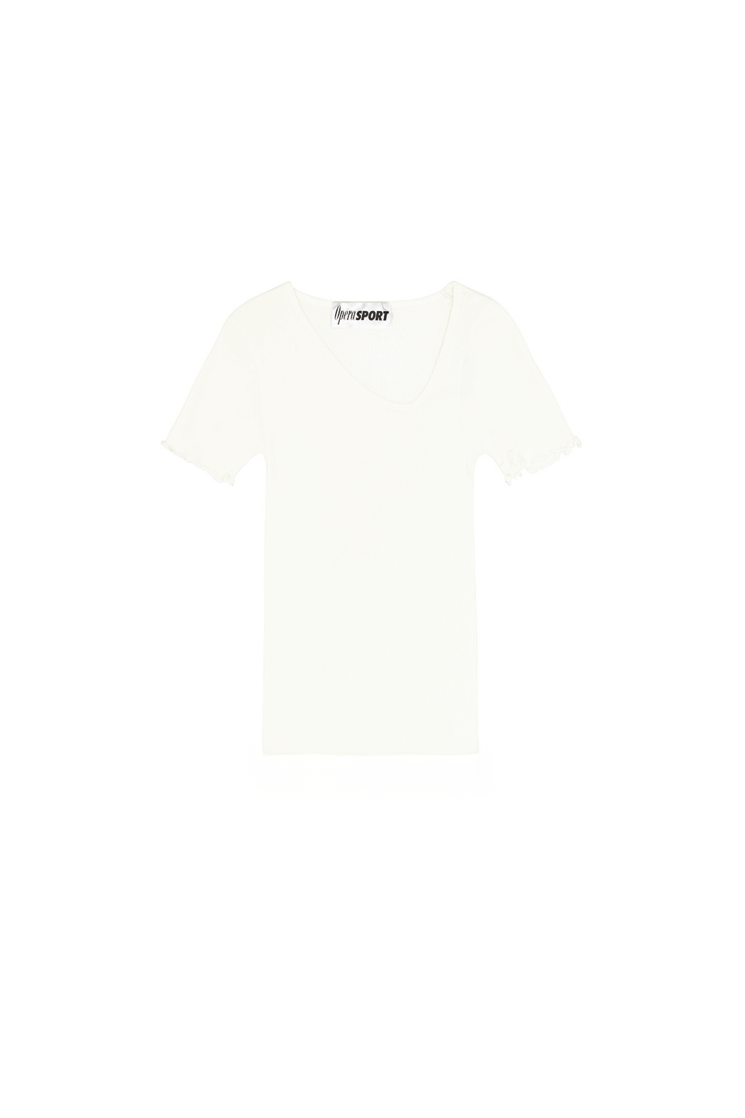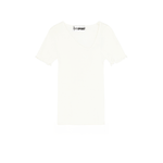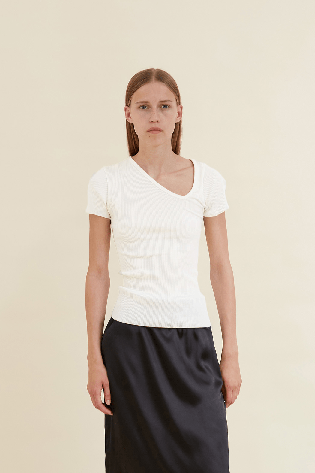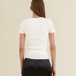 The Ava seamless top in white is made from 100% organic cotton, offering a soft, comfortable feel. Designed with an asymmetrical V-neckline and distinctive wavy edging at the hem and sleeves, it brings a modern twist to a classic silhouette.