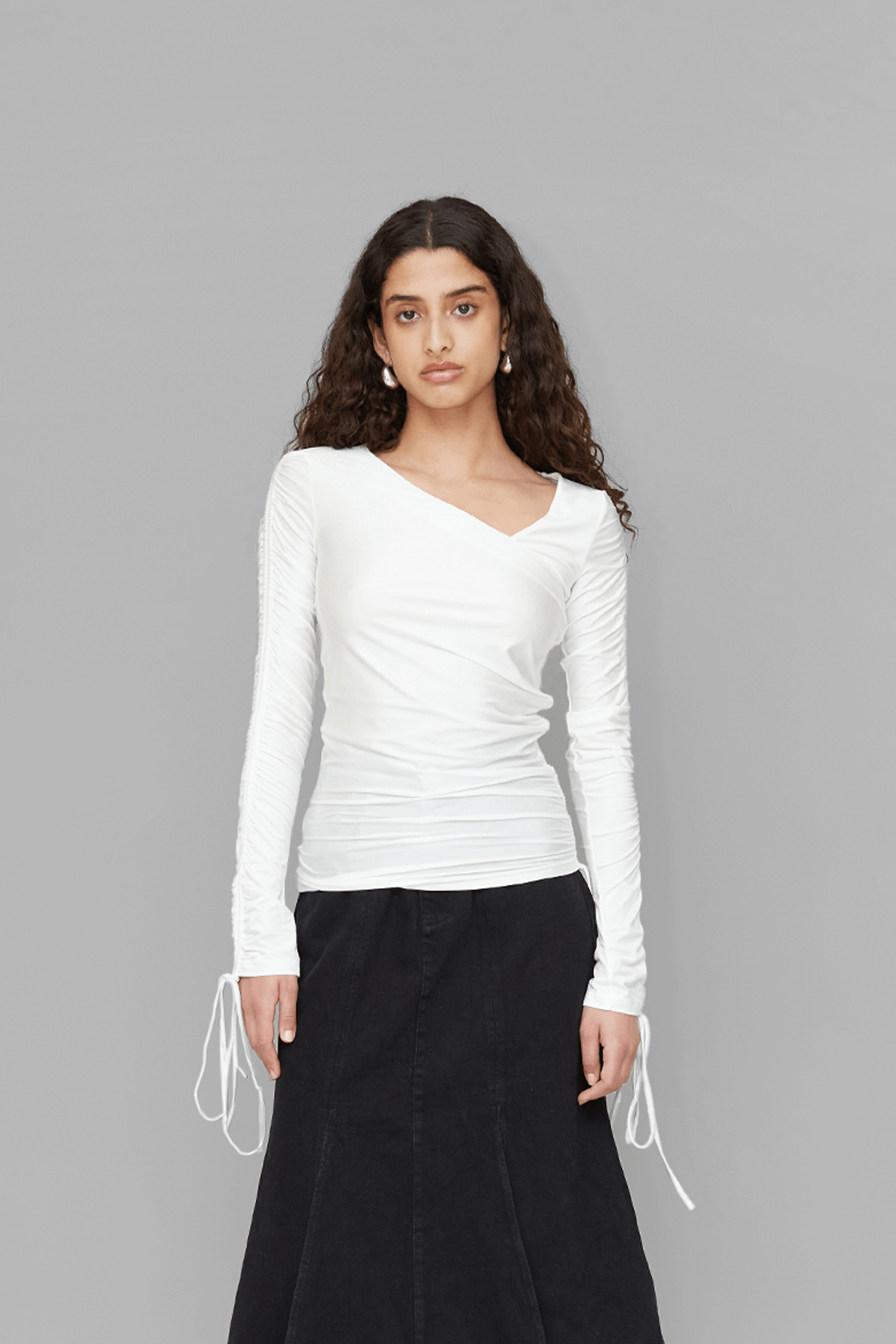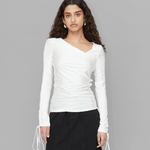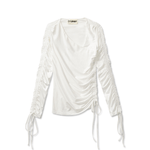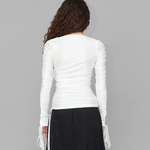 The Anais Top in white is crafted from a blend of 75% recycled nylon and 25% spandex. This fitted top features an eye-catching asymmetrical neckline and elegant ruched detailing on both sleeves. The look is completed with adjustable ties at the ends of the sleeves, adding a playful yet stylish touch.