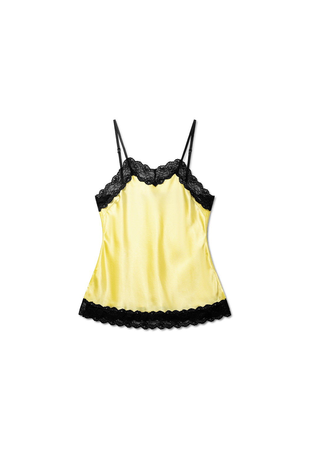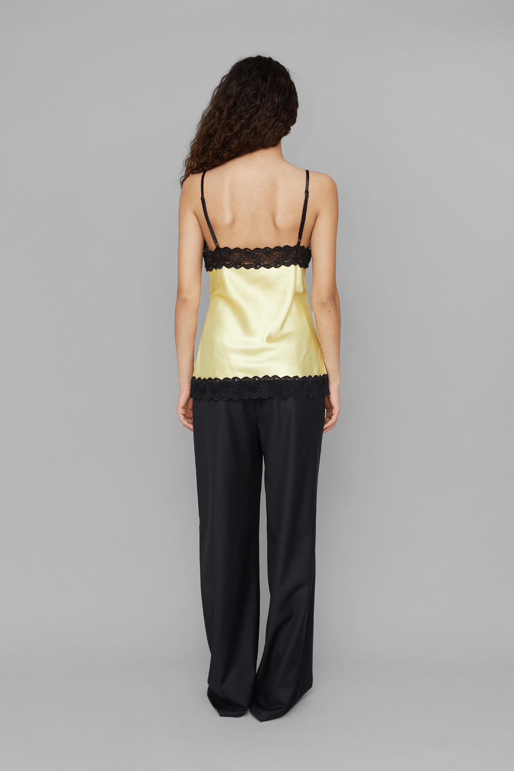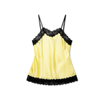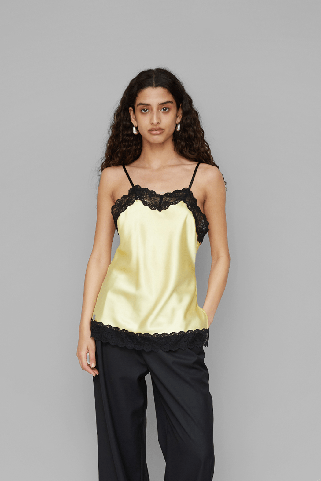 The Elise camisole top is crafted from 100% recycled polyester in elfin yellow. Designed with thin straps, it features delicate black lace detailing along the neckline and bottom edge. The soft satin-like finish and relaxed silhouette give it a refined yet effortless feel.