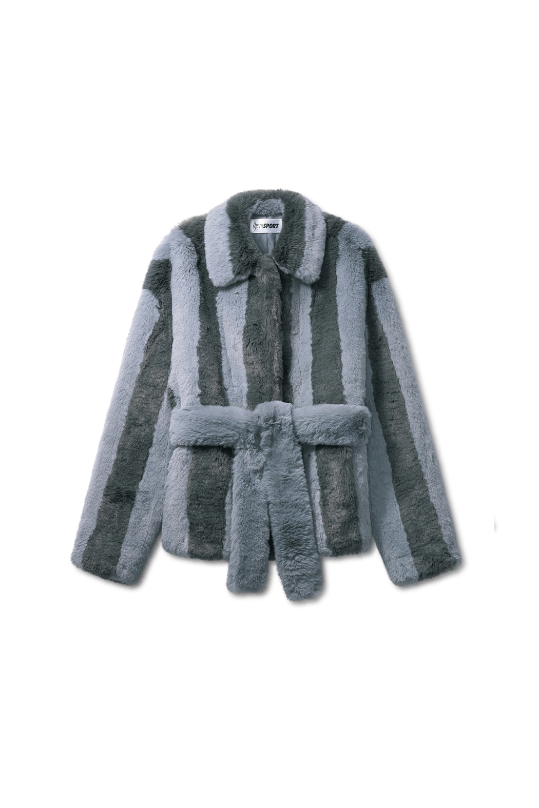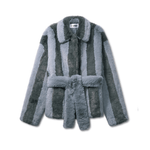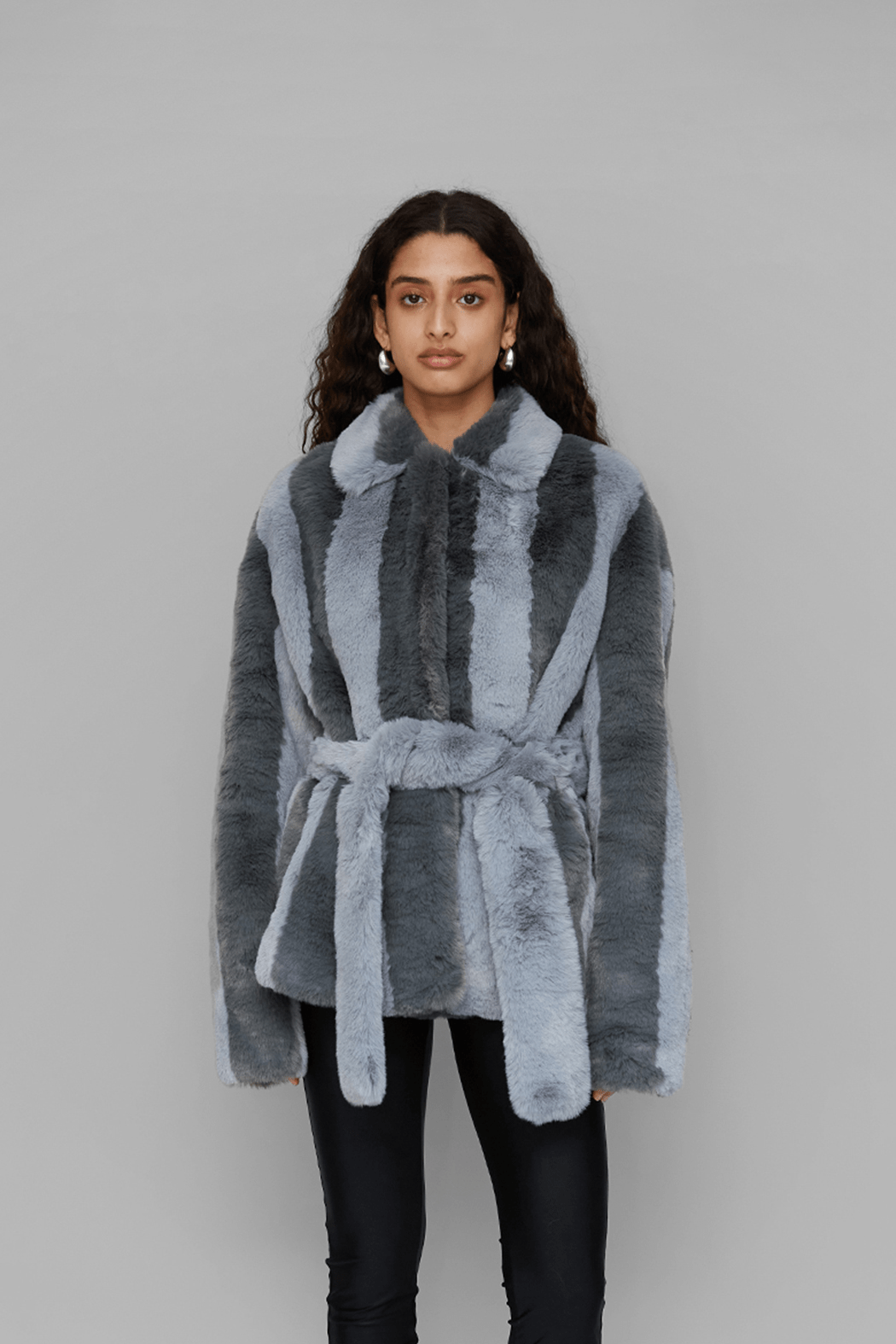 The Fiona Jacket is crafted from 100% recycled polyester in striped shades of grey. Designed in soft faux fur, it features a relaxed fit with long sleeves and a wide collar. A matching belt ties at the waist, allowing the silhouette to be worn loose or cinched for shape.