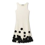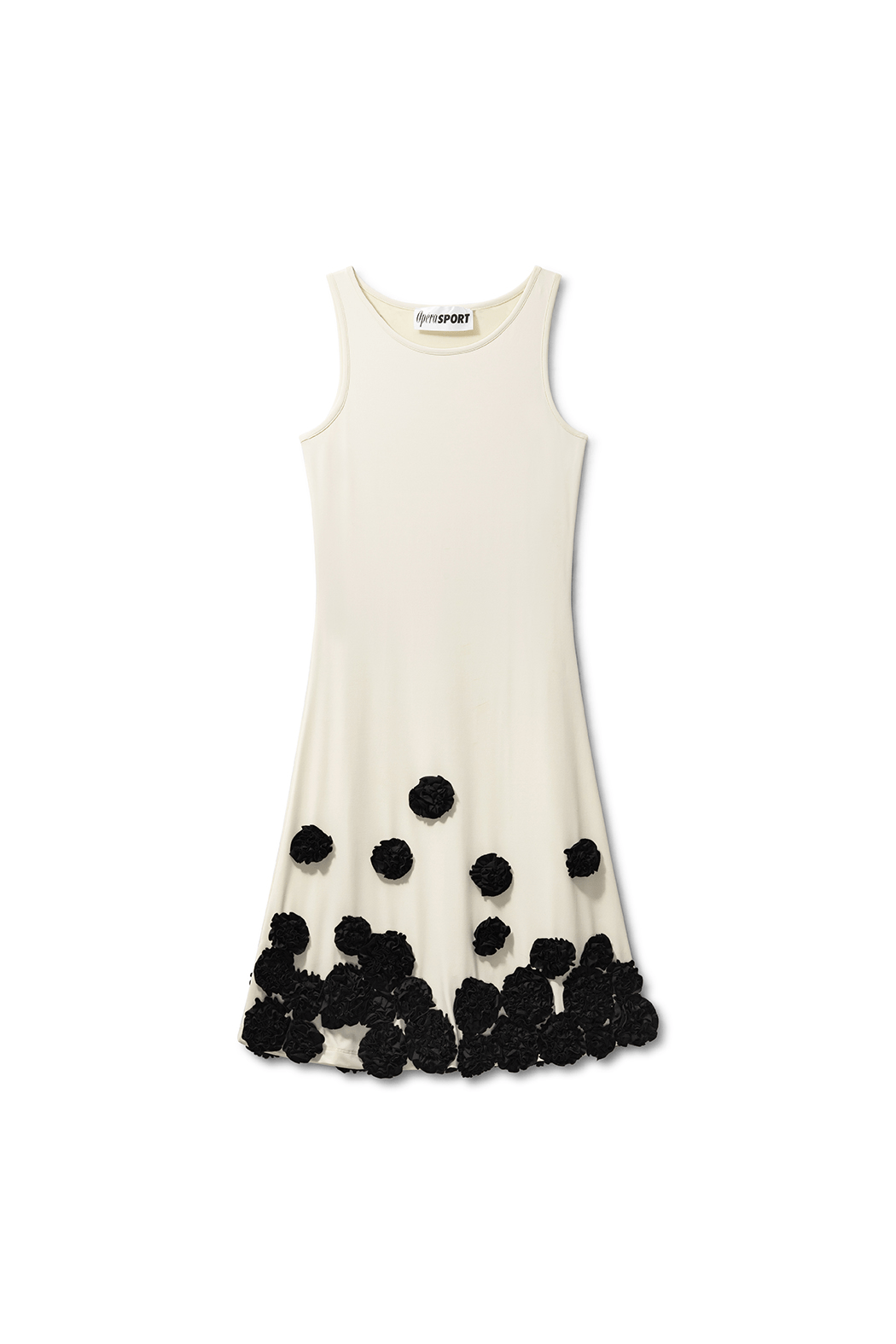The Hana Dress is crafted from a blend of recycled polyester and spandex in a pristine white shade. Designed with a fitted silhouette, it features a sleeveless cut and a round neckline for a clean, modern look. Black floral details are placed across the lower part of the dress, adding dimension and contrast to the minimalist design.