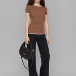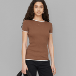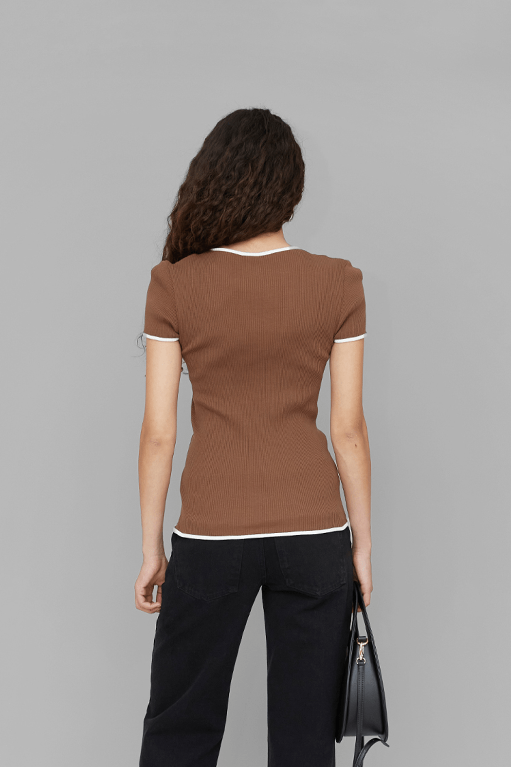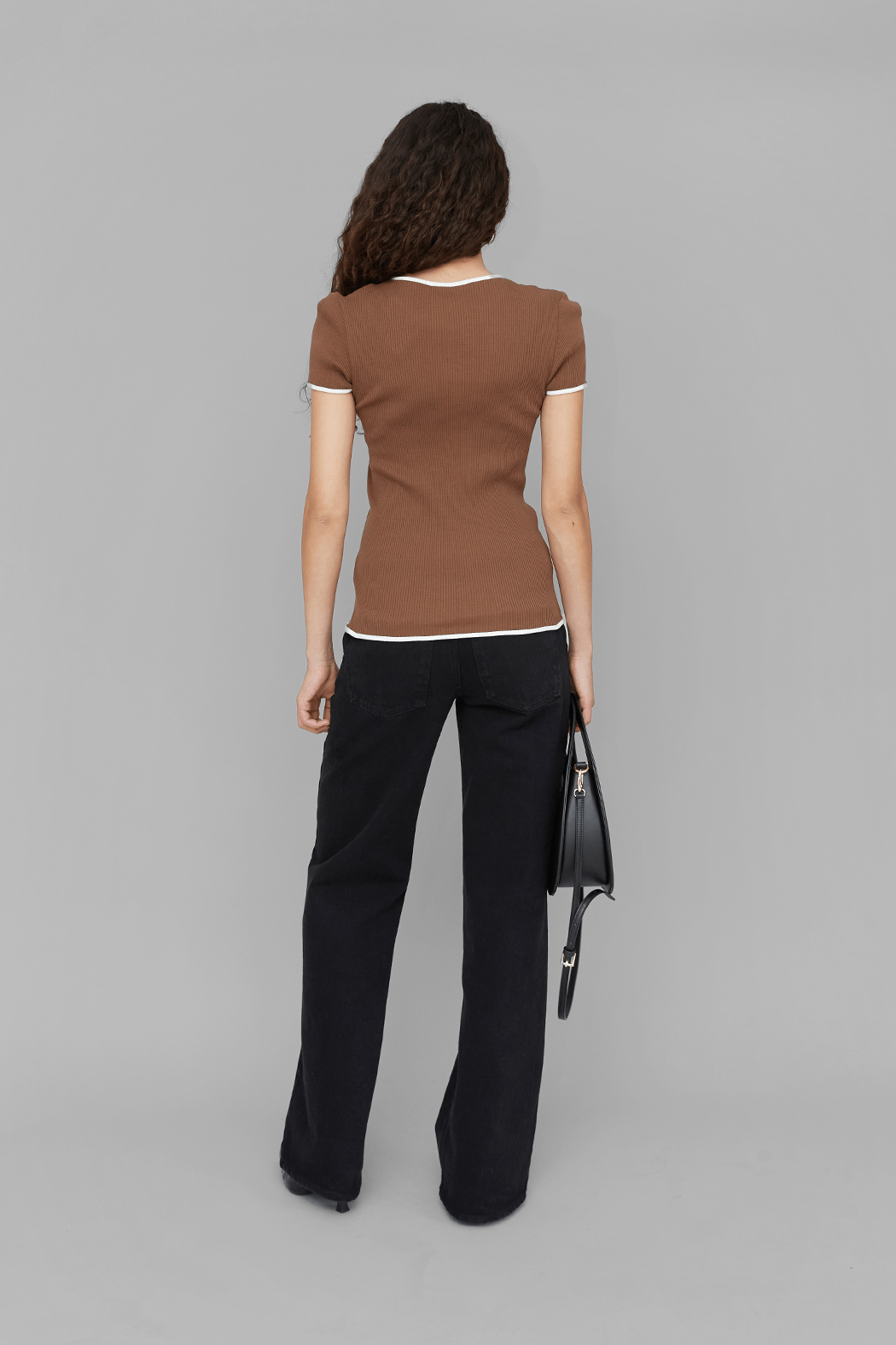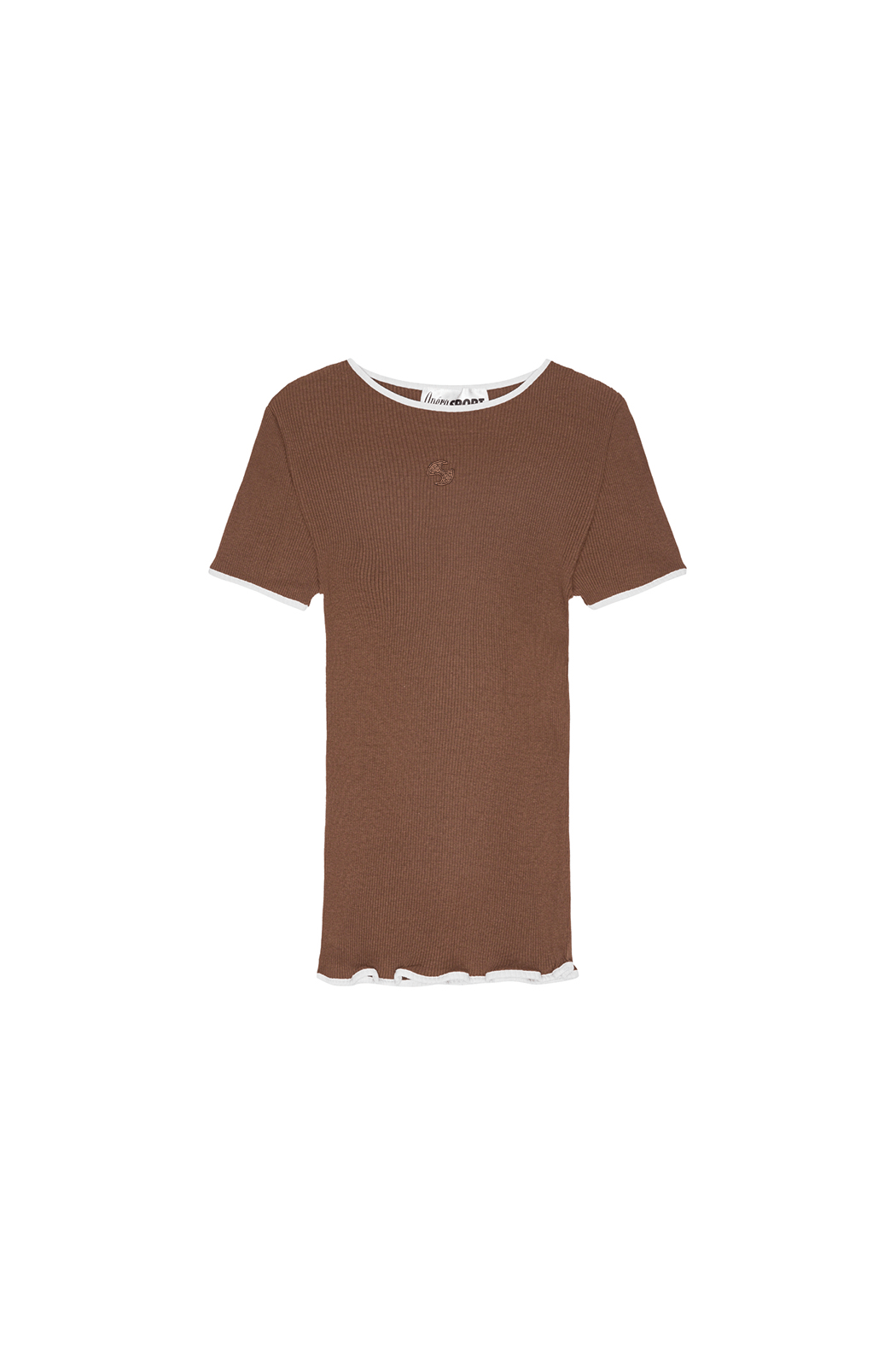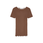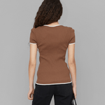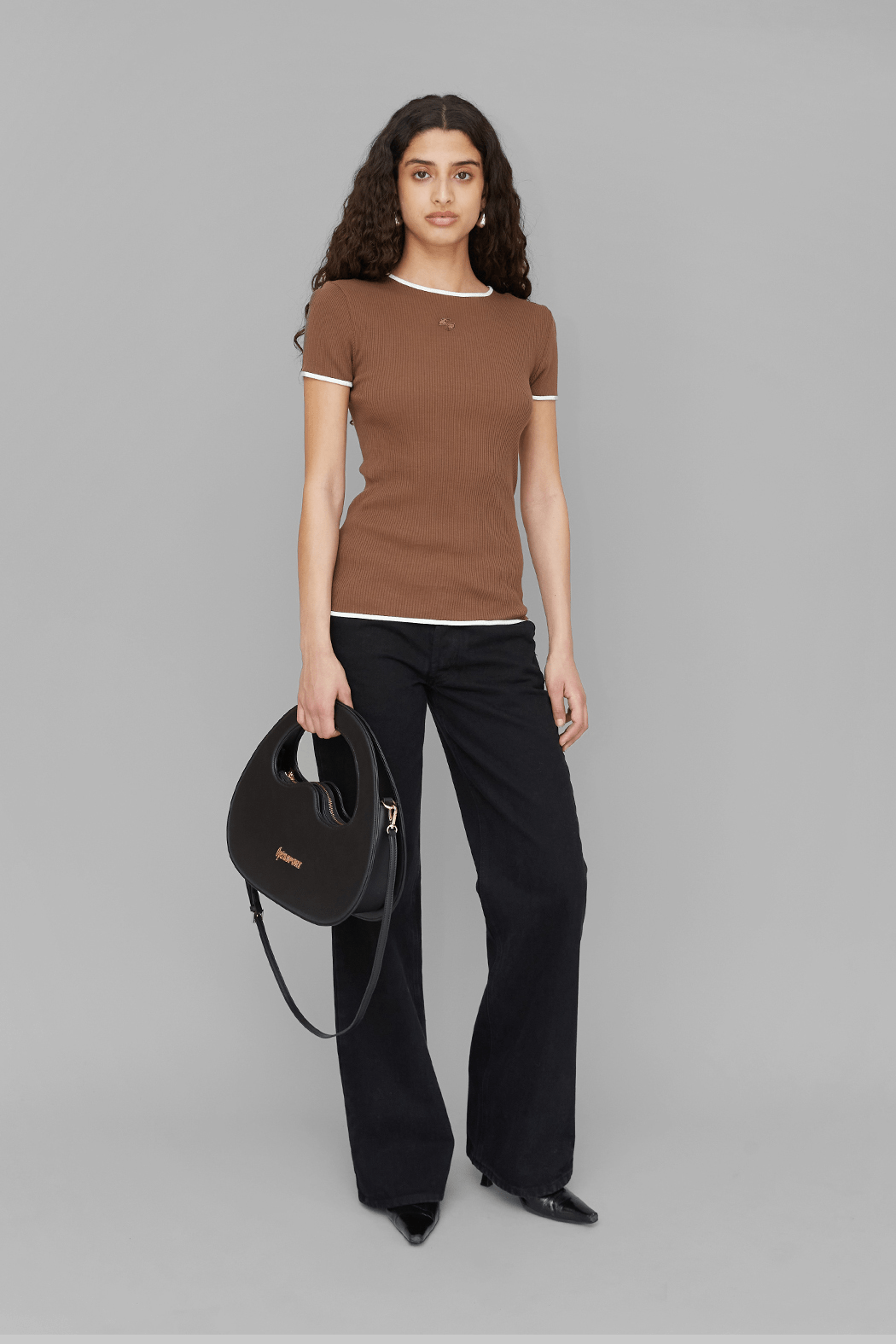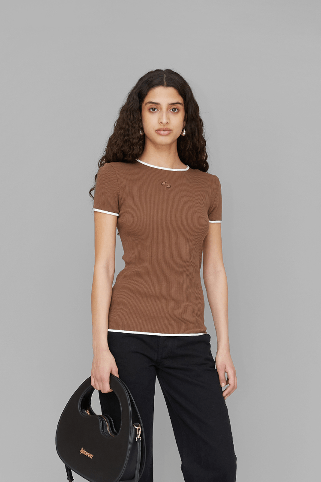 The Jaya Top is crafted from 100% soft organic cotton. This seamless style has a fitted silhouette that hugs the figure while remaining versatile for everyday wear. Designed in brown with contrasting white hems, it features the embroidered OpéraSPORT logo centered on the chest. Please note that our seamless styles are designed with significant stretch, which is why the measurements in our size guide show only minimal variation.