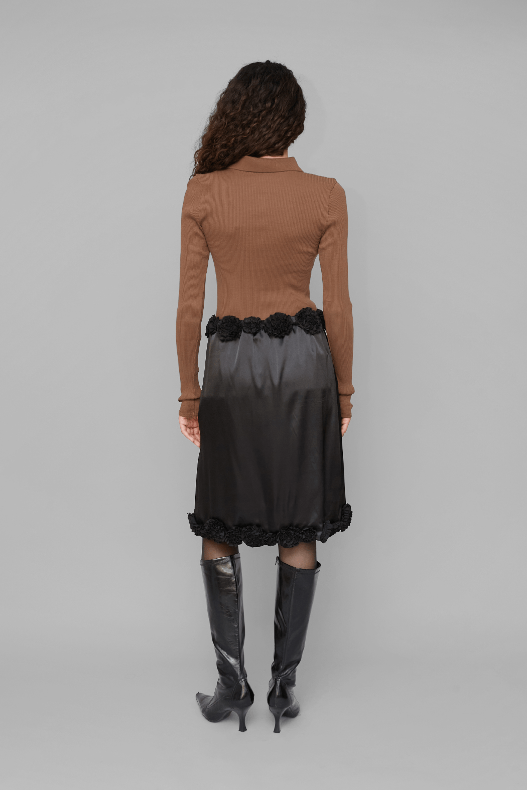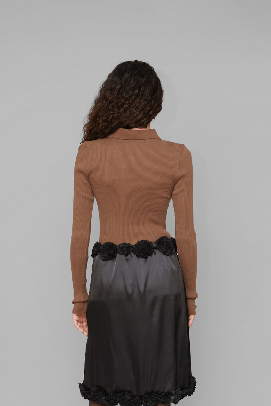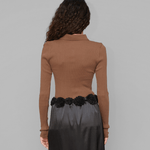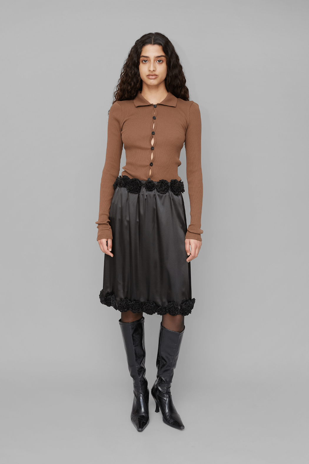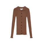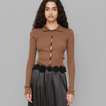 The Laura Shirt is crafted from brown organic cotton with black buttons. Laura has a close-fitted silhouette with long sleeves, a pointy collar, and a button-fastening down the front giving it endless styling options. Please note that our seamless styles are designed with significant stretch, which is why the measurements in our size guide show only minimal variation.