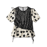 The Mila Top is crafted from 100% recycled polyester. Designed in a mixed dots print, it features short sleeves and a round neckline. Adjustable side ties allow for a customizable fit, while the satin-like finish gives it an elegant touch. The playful mix of polka-dot sizes makes it a standout piece that can be styled both casually and for evening looks.