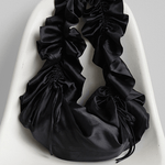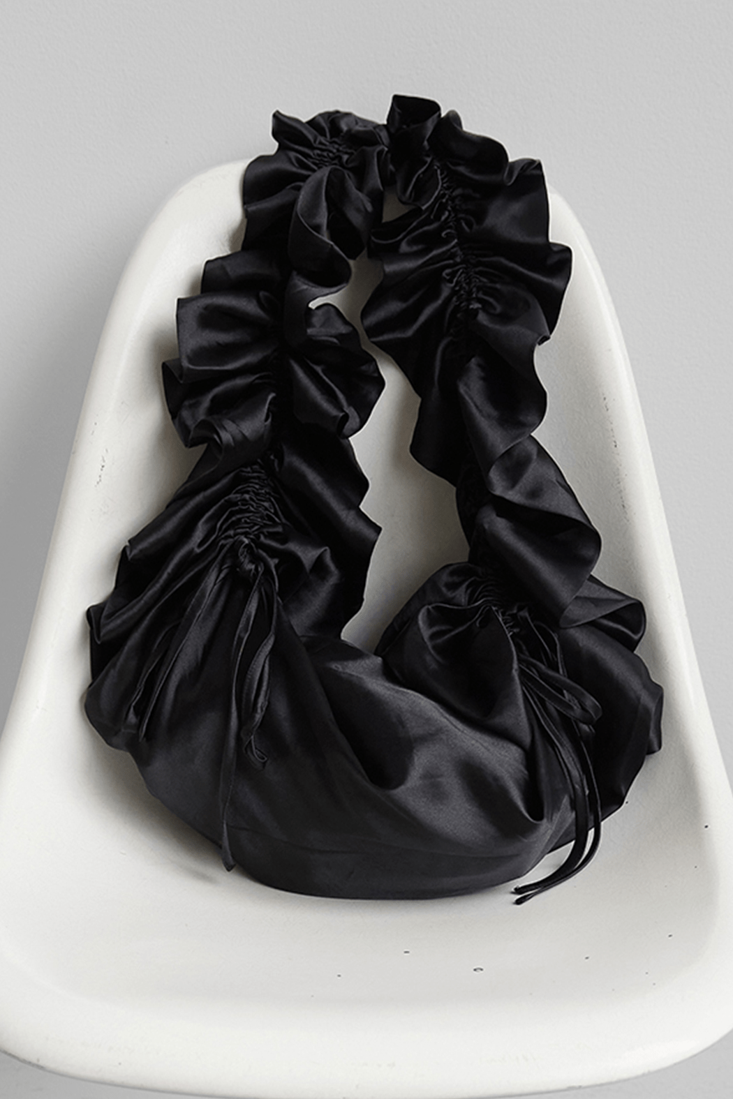 The eye-catching Shirley bag is crafted from luxurious black recycled polyester. Featuring an adjustable strap and ruffle detailing. Can be worn around the shoulder, crossbody, or as a handbag.