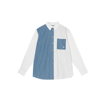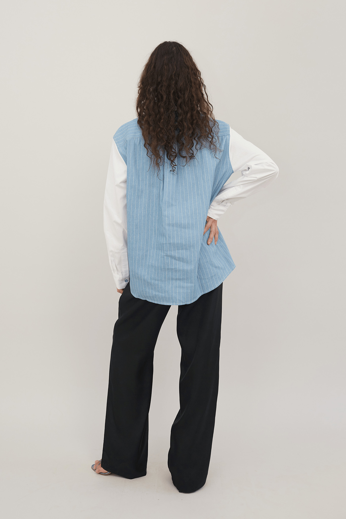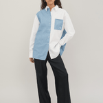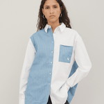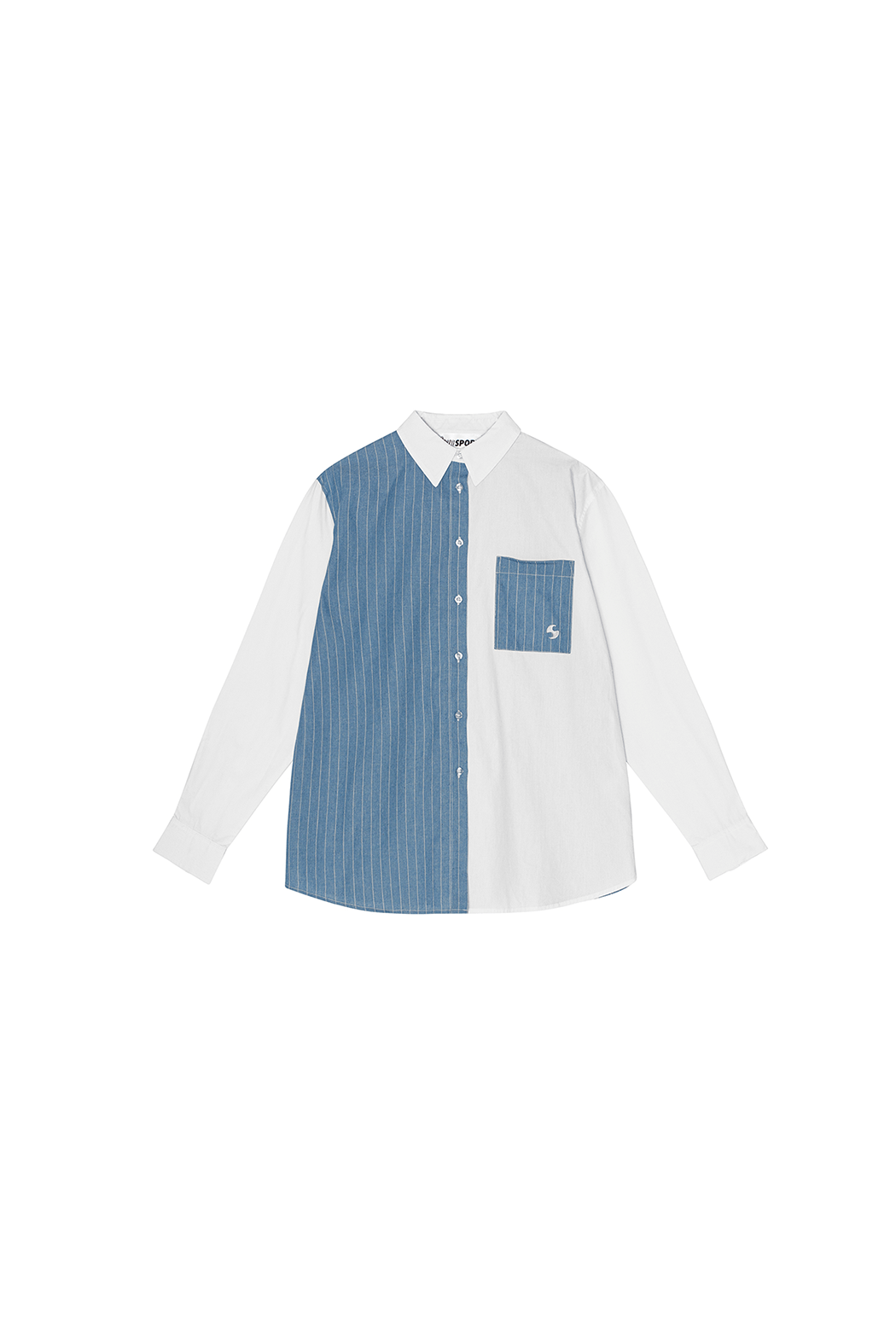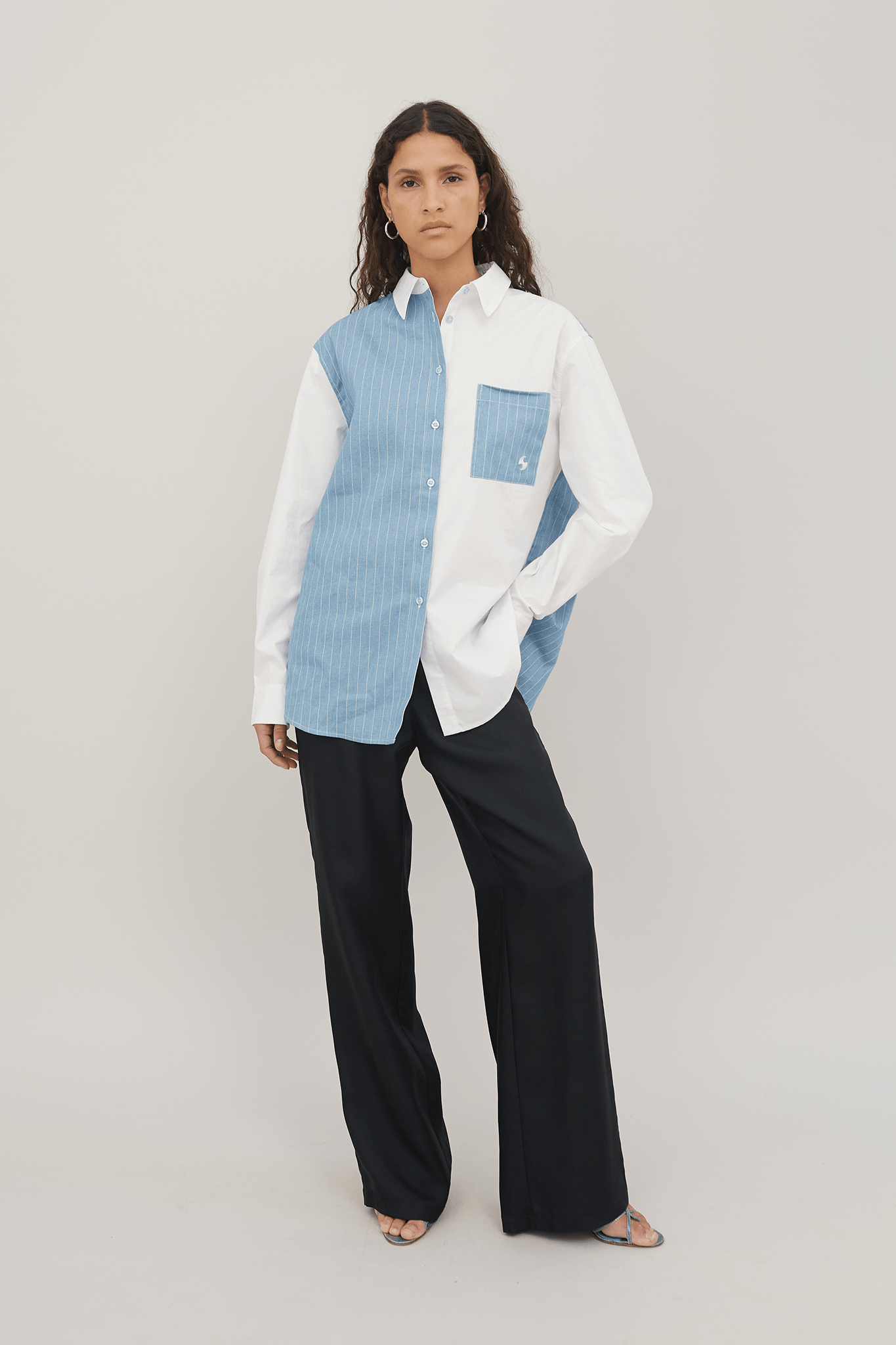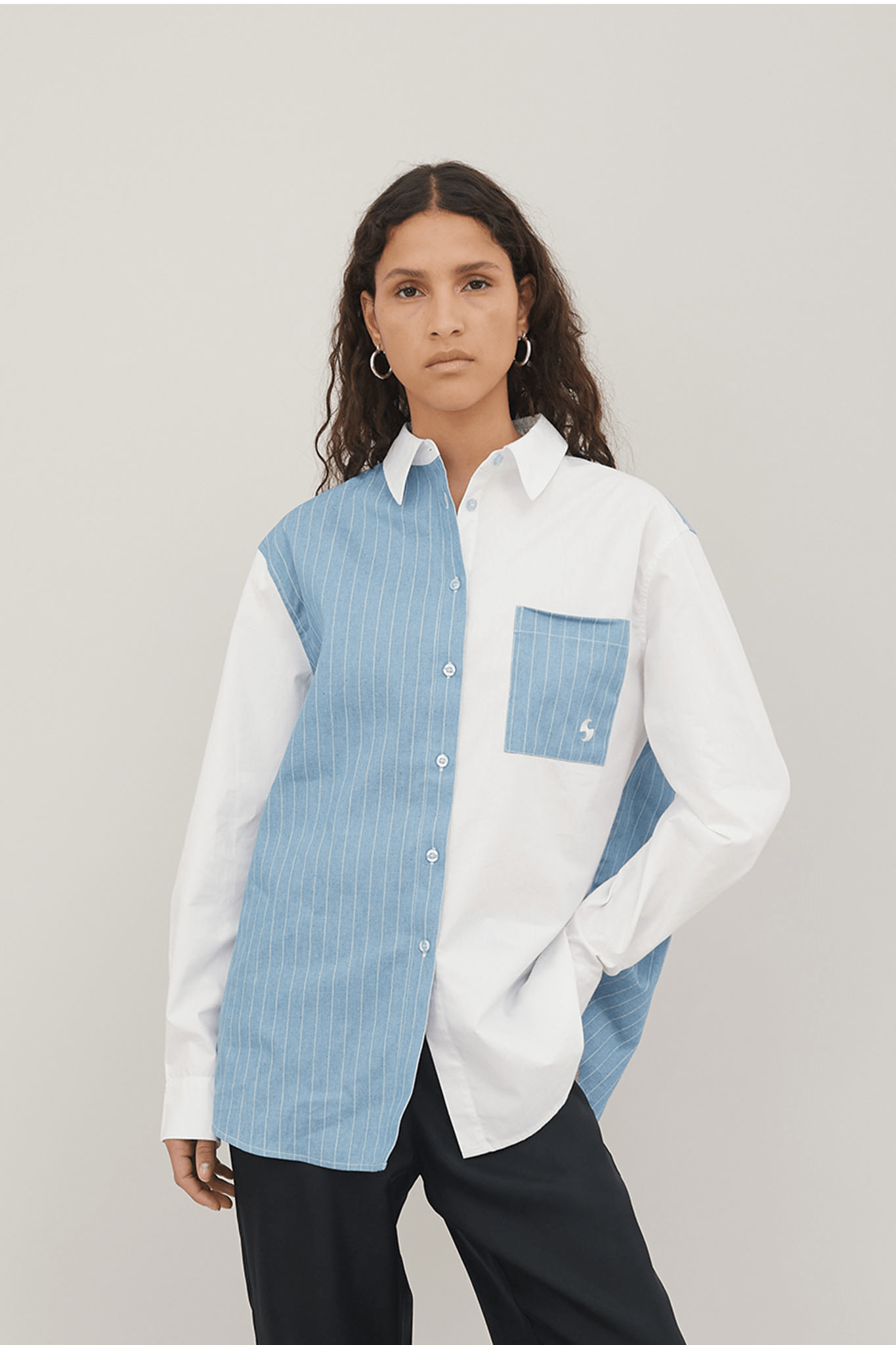 This spring we are introducing the Vago unisex shirt crafted from crisp recycled cotton poplin in a white and blue pinned striped color combination. The shirt has an effortlessly chic, oversized silhouette with cuffs, a classic collar, and a button-down front. The shirt has one front pocket on the chest with the signature OpéraSPORT logo embroidered in white. It is the perfect classic shirt with a twist.