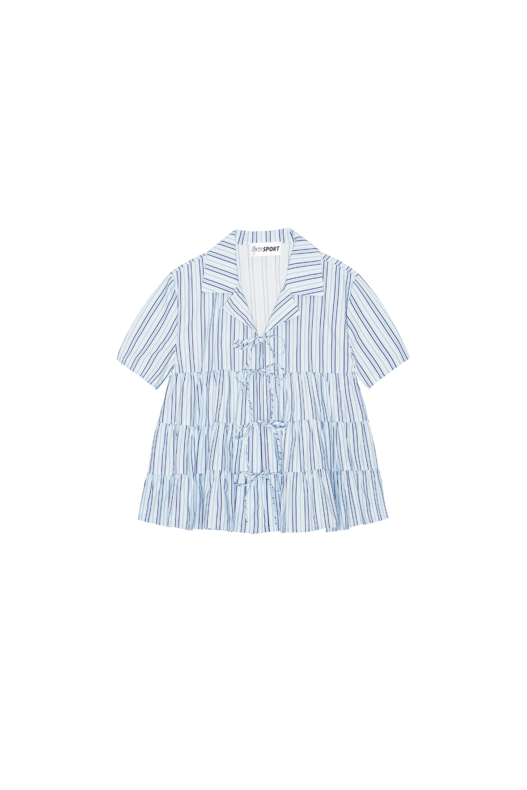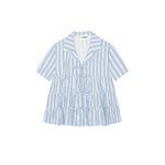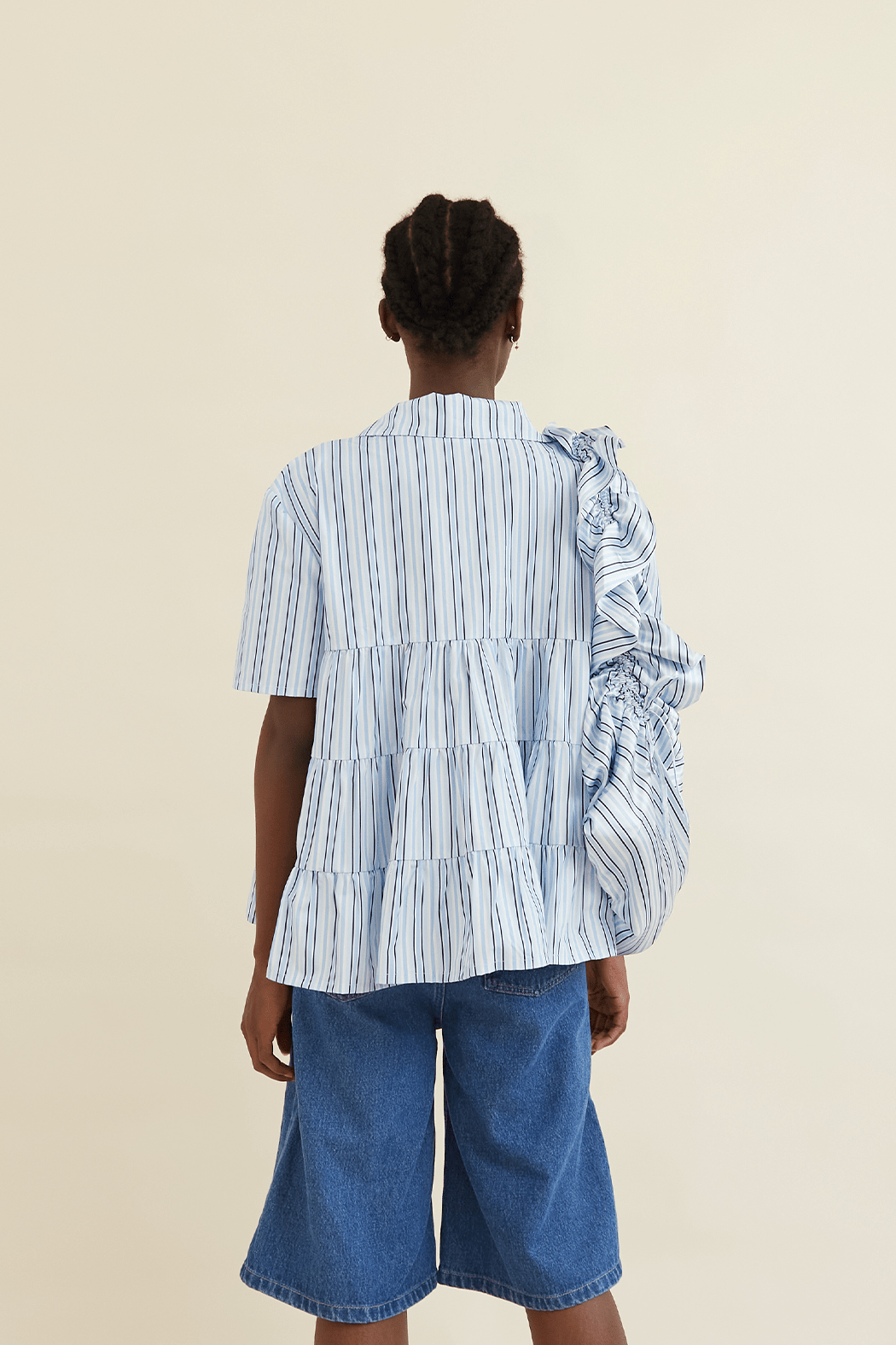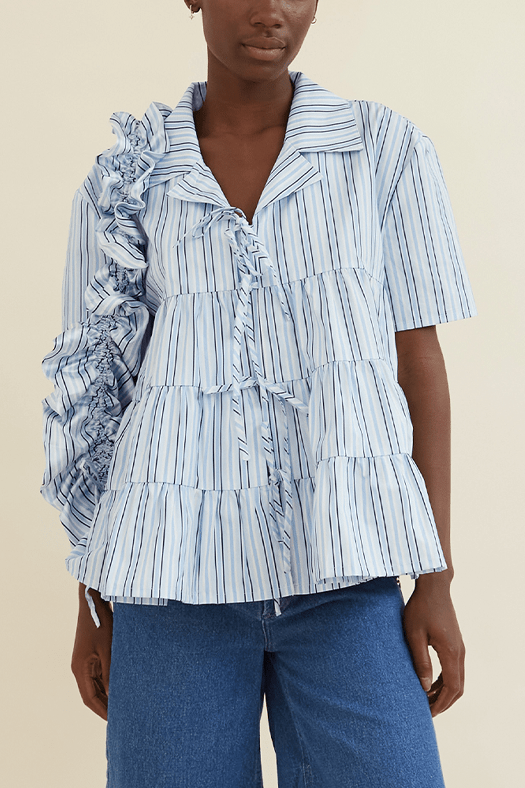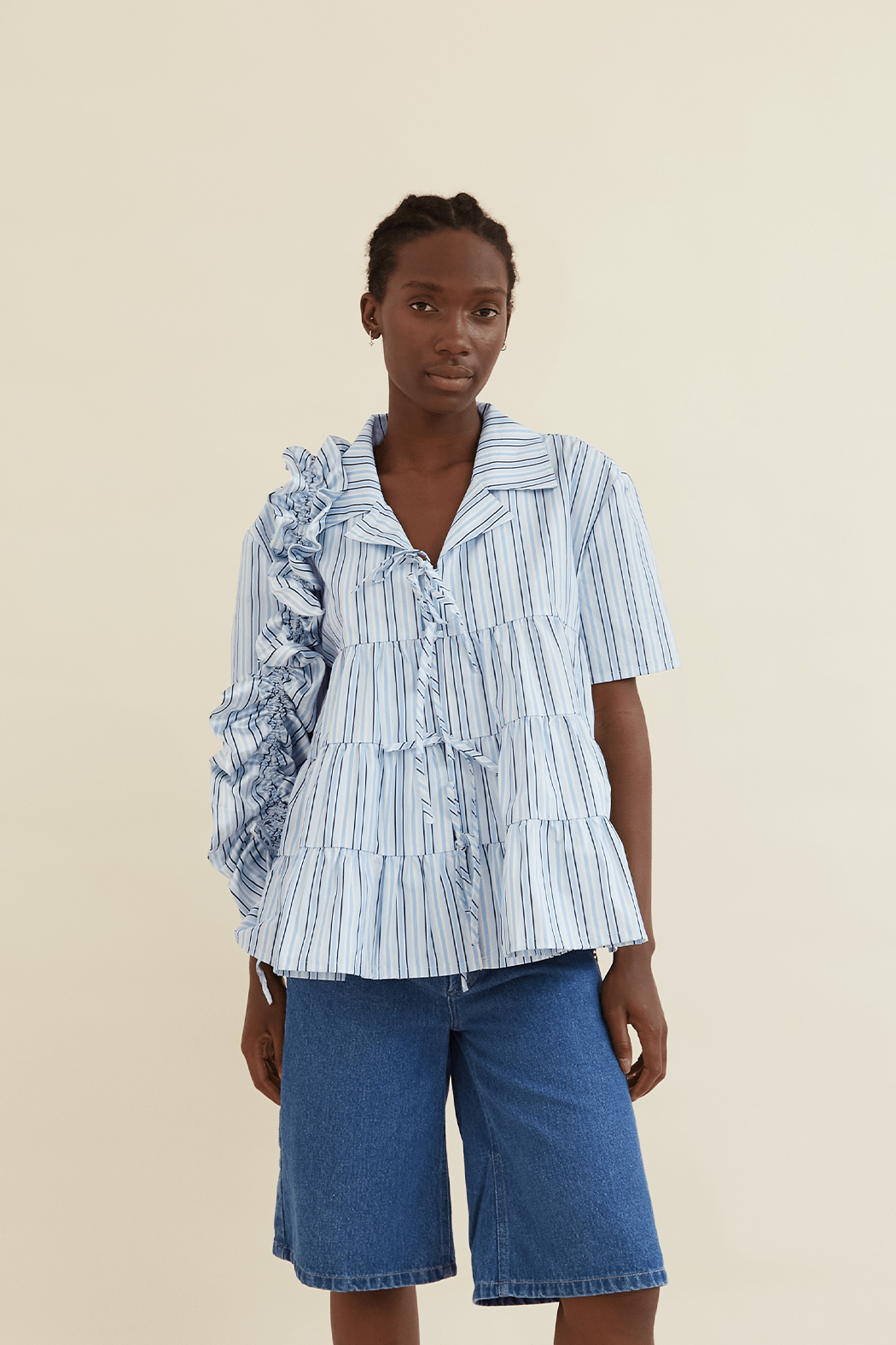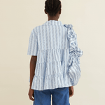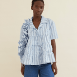 The Desiree Shirt in stripes is made from 100% organic cotton. This shirt features a cute and fresh stripe blue print, perfect for adding a playful touch to your wardrobe. The ruffled peplum enhances the silhouette with a feminine, flirty flair, while the short sleeves and wide collar provide a relaxed, breezy feel. The shirt has ties that can be left undone or knotted into a bow.